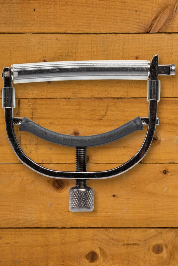 Guitar capo with around-the-neck yoke design to ensure superior tone, intonation and tuning stability. Easily stored behind the nut when not in use. Made in USA.