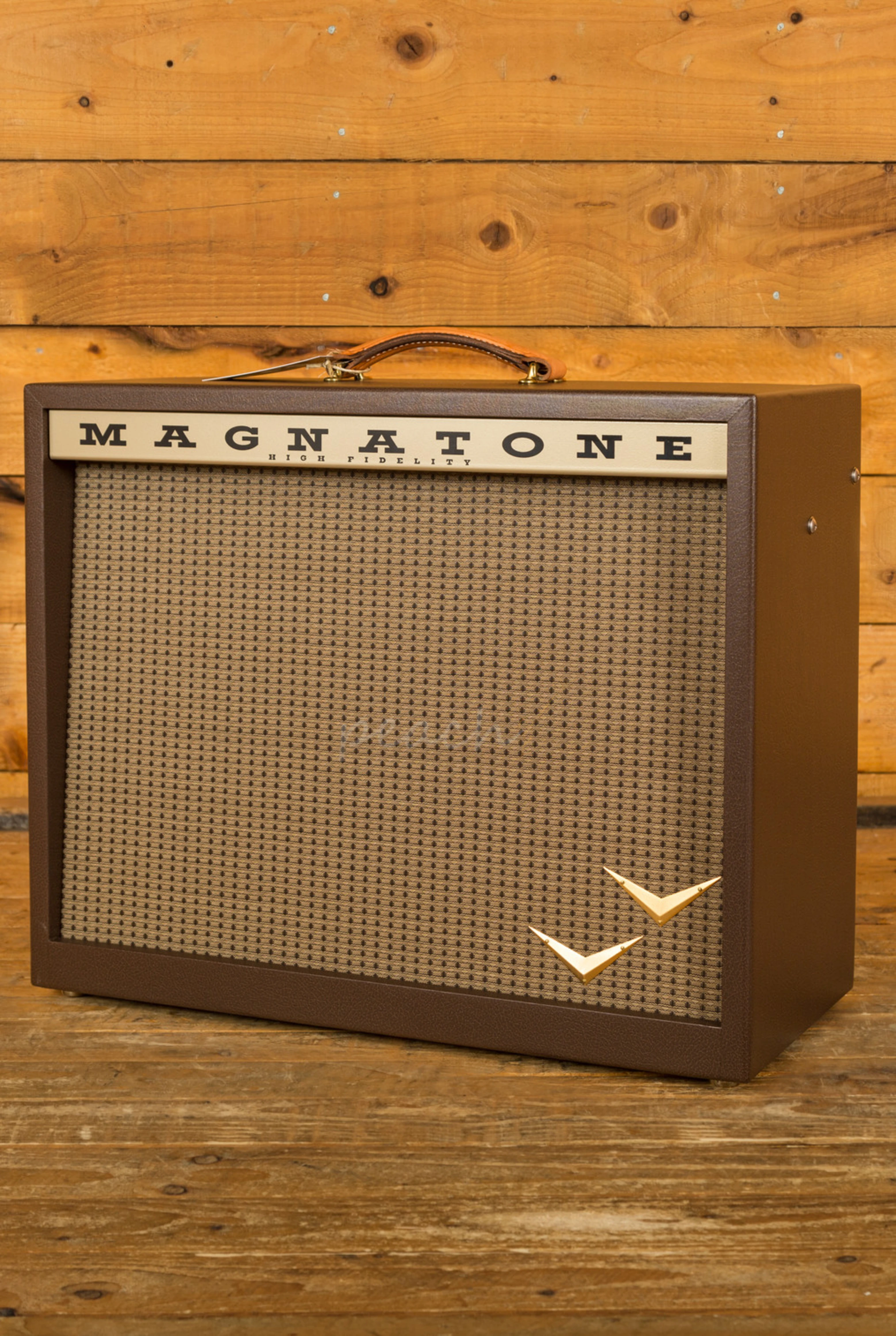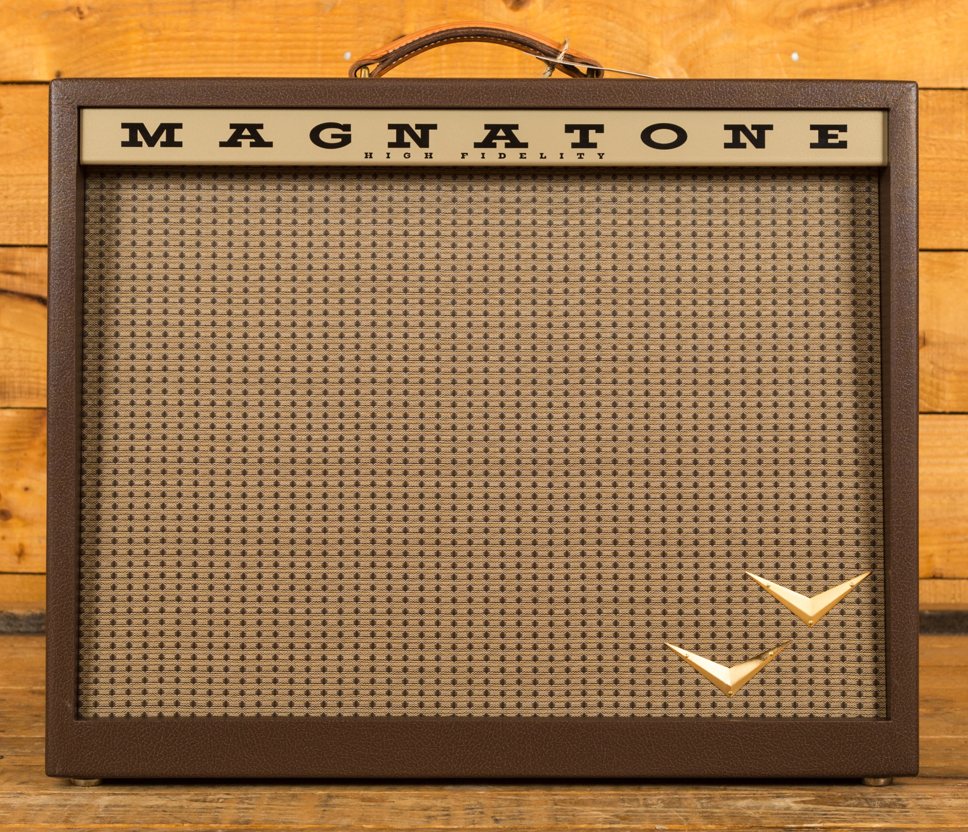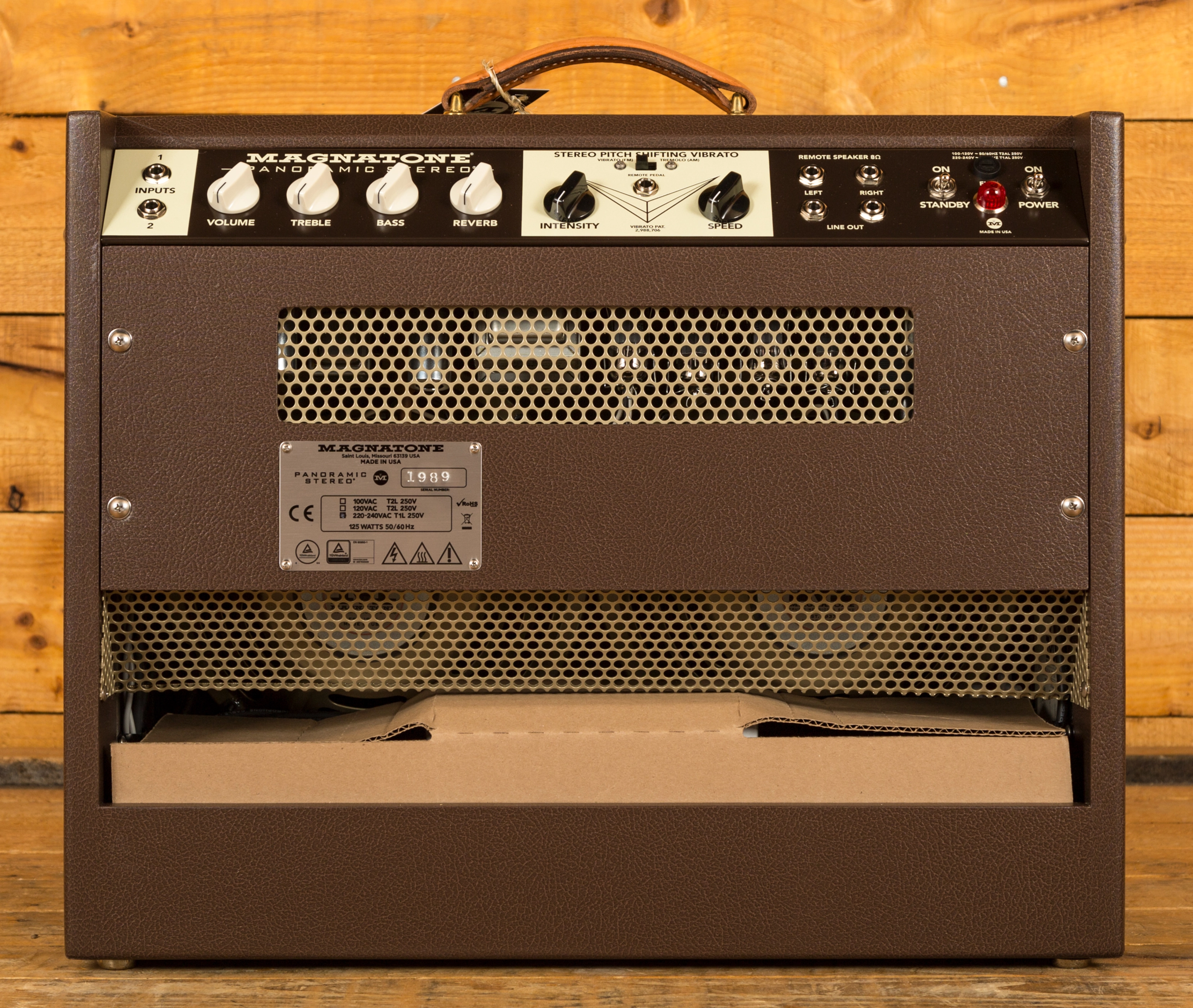 Clothed in the vintage brown and gold cosmetic, the Panoramic Stereo brings the Magnatone stereo experience to a smaller, more convenient size. Two 10" speakers are powered by four EL84s push pull 12 + 12 watts of all tube stereo power for a very compact and wide sounding amplifier.