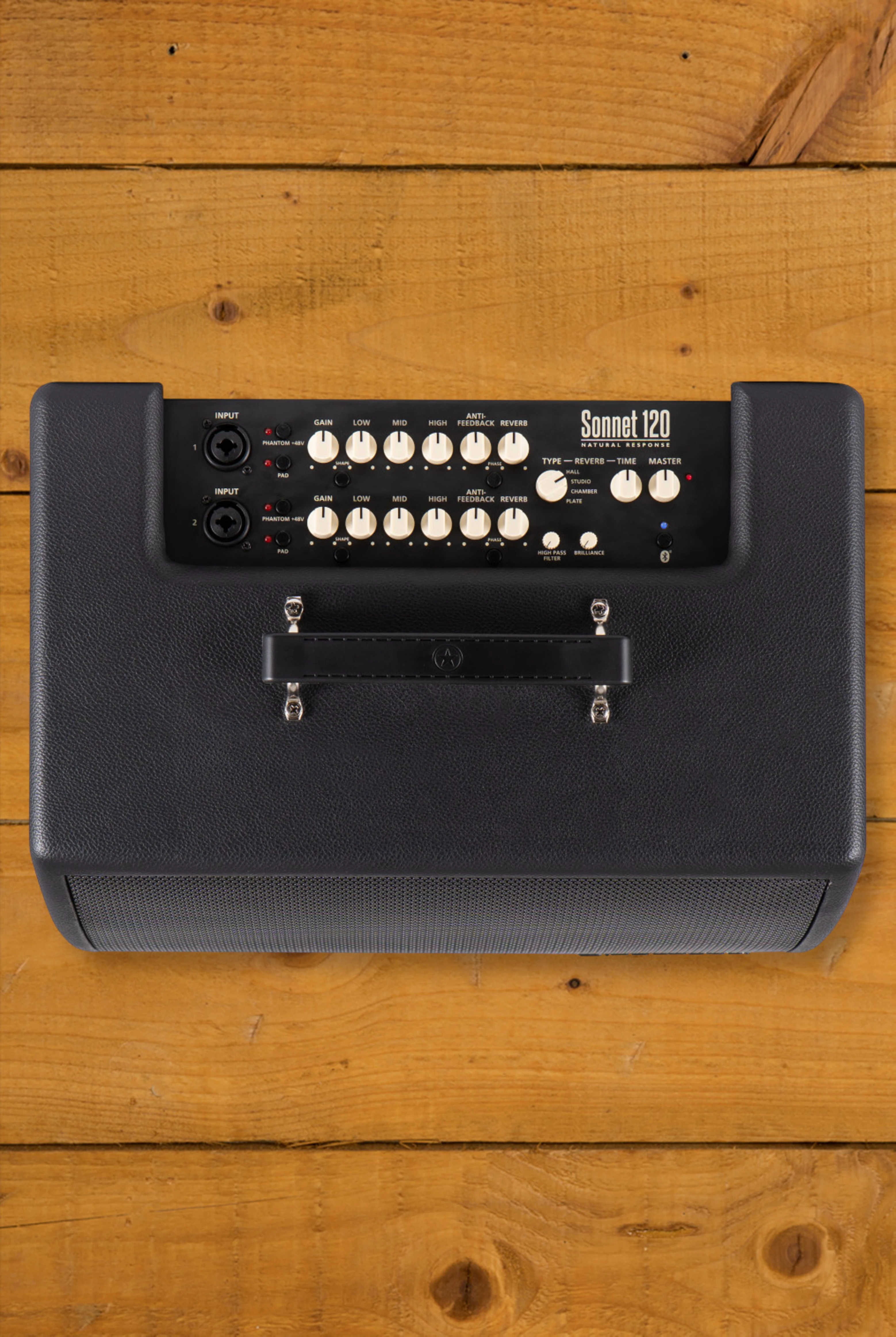 At its core, the Sonnet 120 features two independent channels, allowing players to blend microphone and instrument inputs with dedicated EQ and reverb settings. The four studio-quality reverbs (Hall, Plate, Studio, and Chamber) add depth and ambience, while the anti-feedback and phase controls ensure smooth, uninterrupted performance.