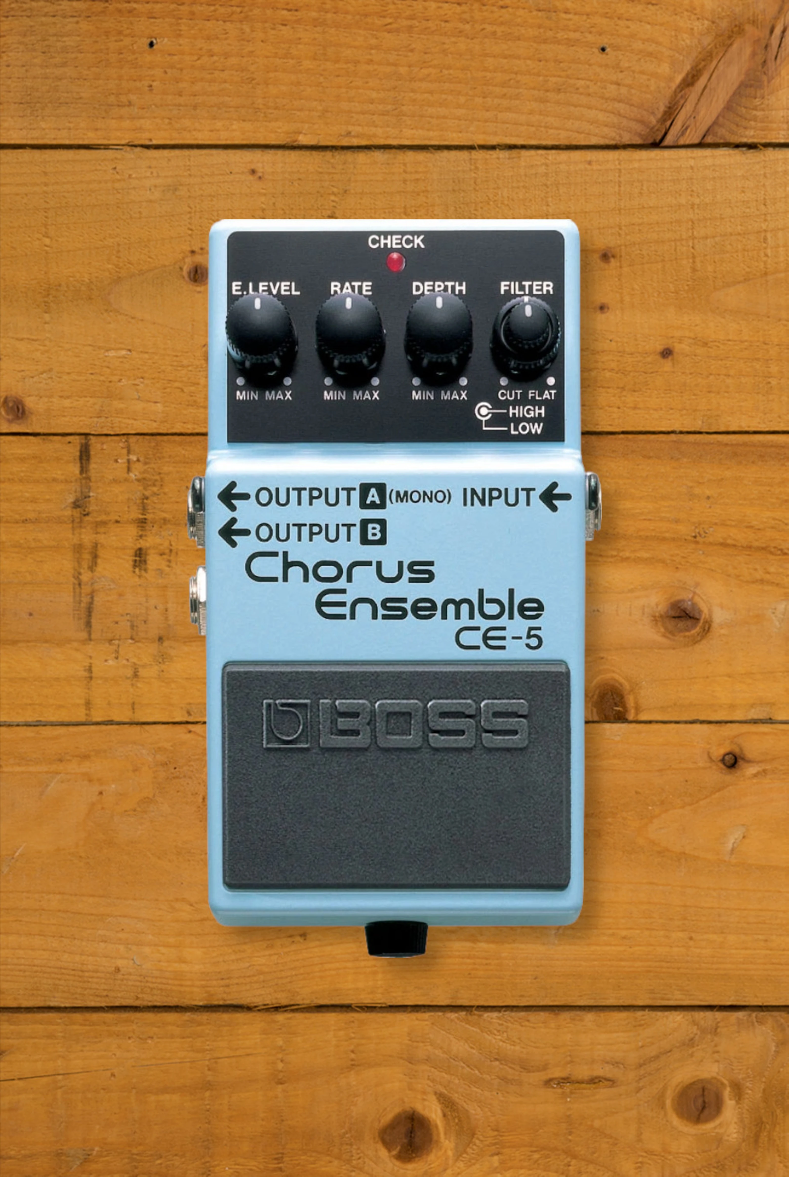The BOSS CE5 Chorus Ensemble is BOSS' definitive compact chorus pedal, covering a wide frequency range and featuring high- and low-cut filters.