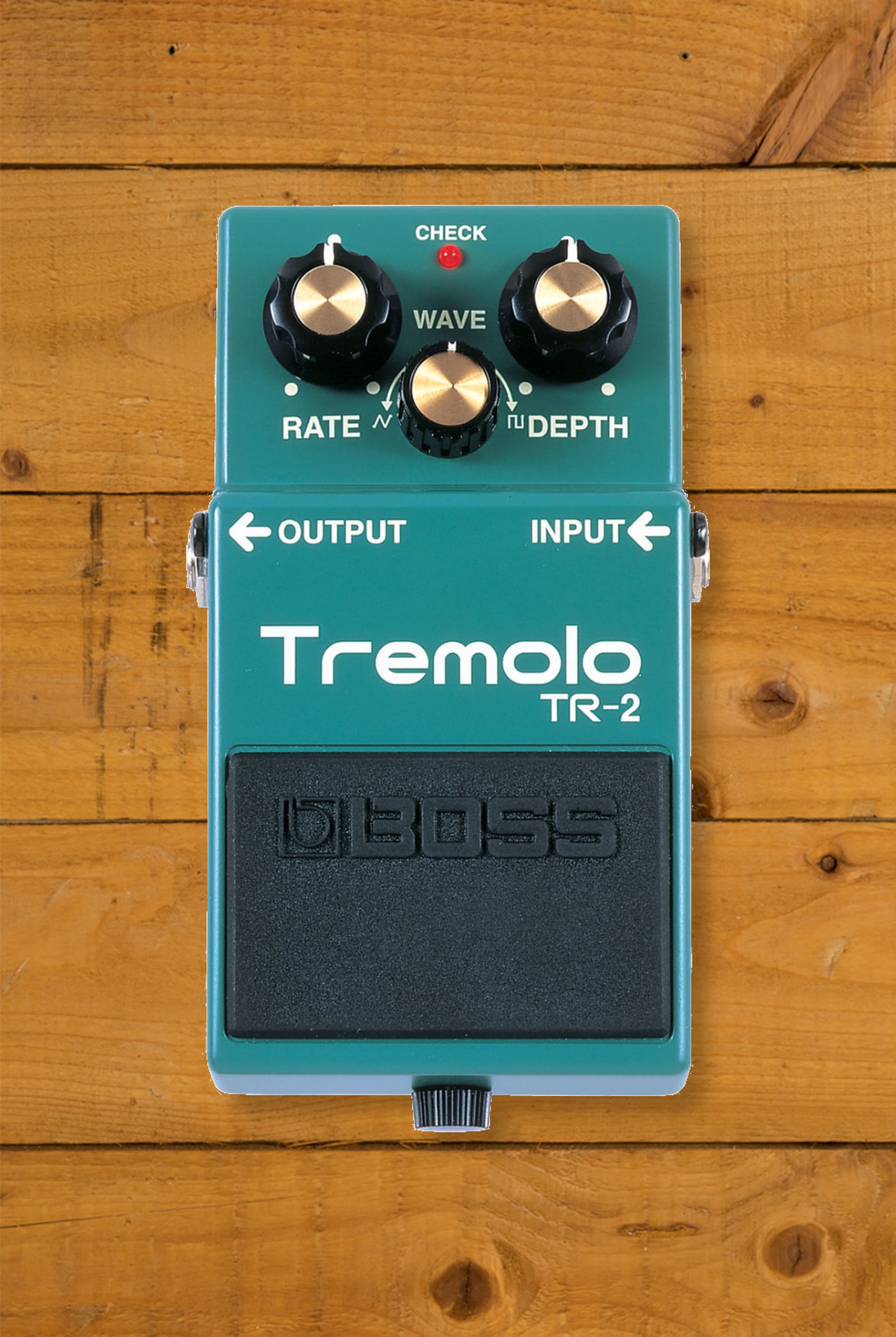 The BOSS TR-2 Tremolo is designed to provide guitarists with classic tremolo effects in an easy-to-use compact pedal. Dedicated "Wave," "Rate," and "Depth" knobs provide a multitude of effect possibilities.