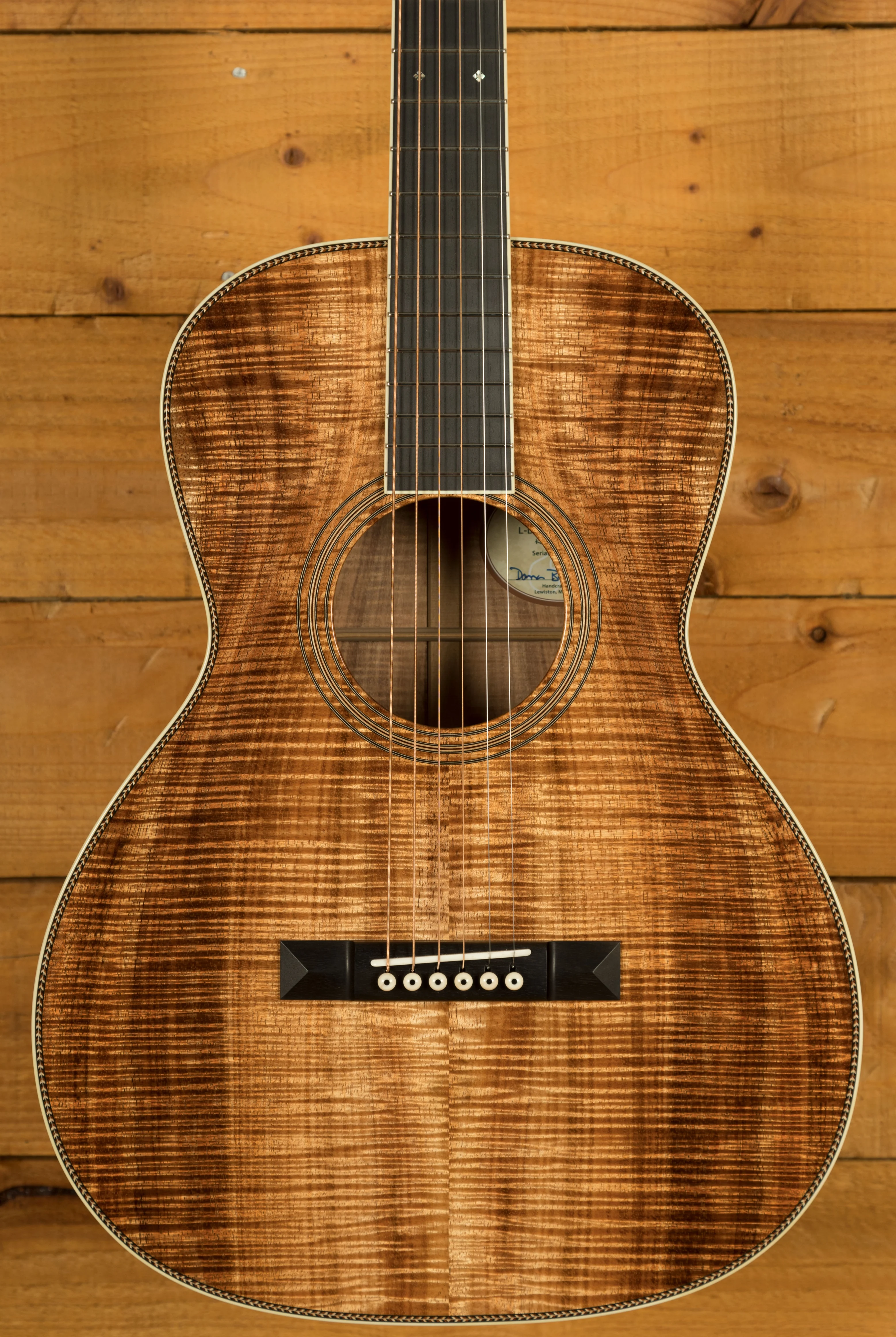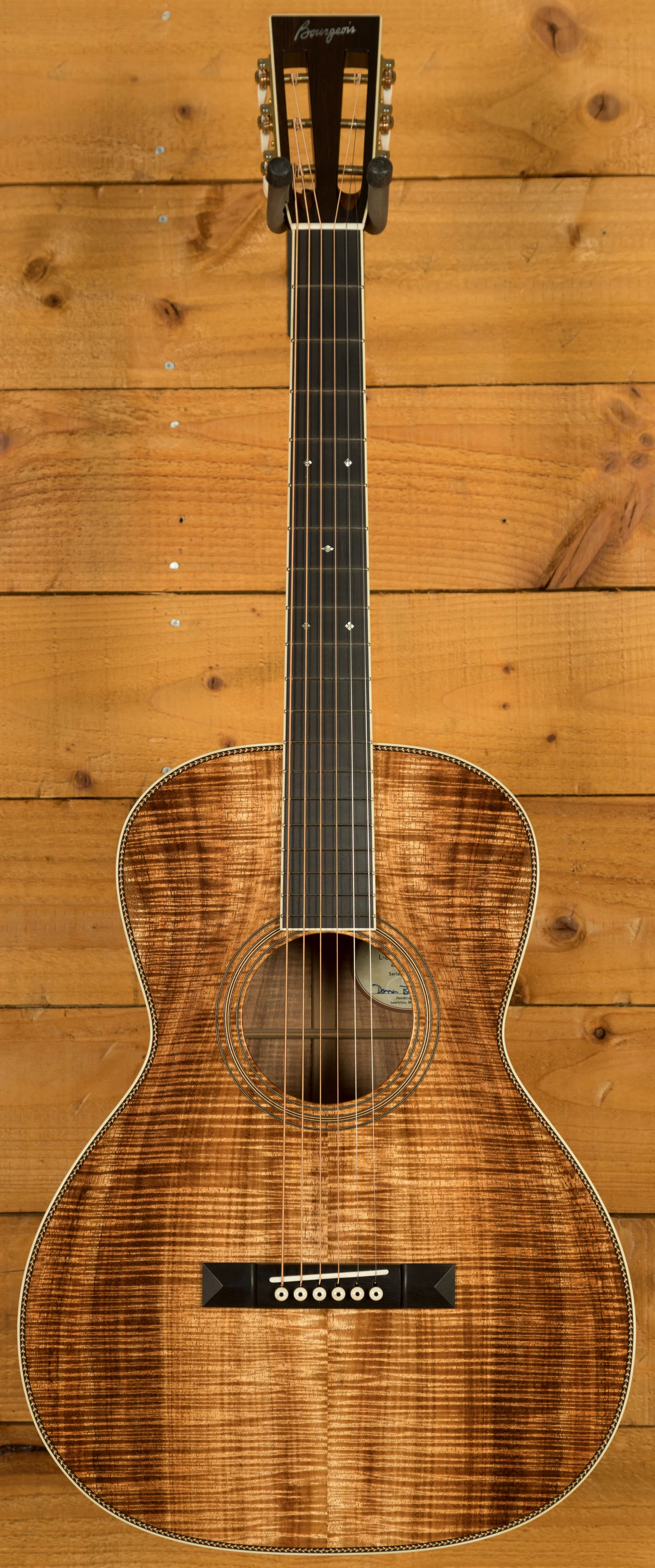 Further enhancing this instrument are features like a 25" short scale, an extra vintage signature wood rosette, and a slotted headstock design featuring a diamond inlay and a Madagascar Rosewood veneer adorned with a Mother of Pearl Bourgeois logo. The Ebony fretboard and bridge feature abalone slotted squares and diamonds as fretboard inlays. The nut width is 1 23/32", and the bridge spacing is 2.2". It sports a pyramid-style bridge with bone pins featuring black dots. The internal label bears the signature of Dana Bourgeois himself. Constructed with animal protein glue, the guitar features a satin finish on the neck and headstock, contrasting with a high-gloss body. Notably, it includes aged tone torrefied bracing as a special option.