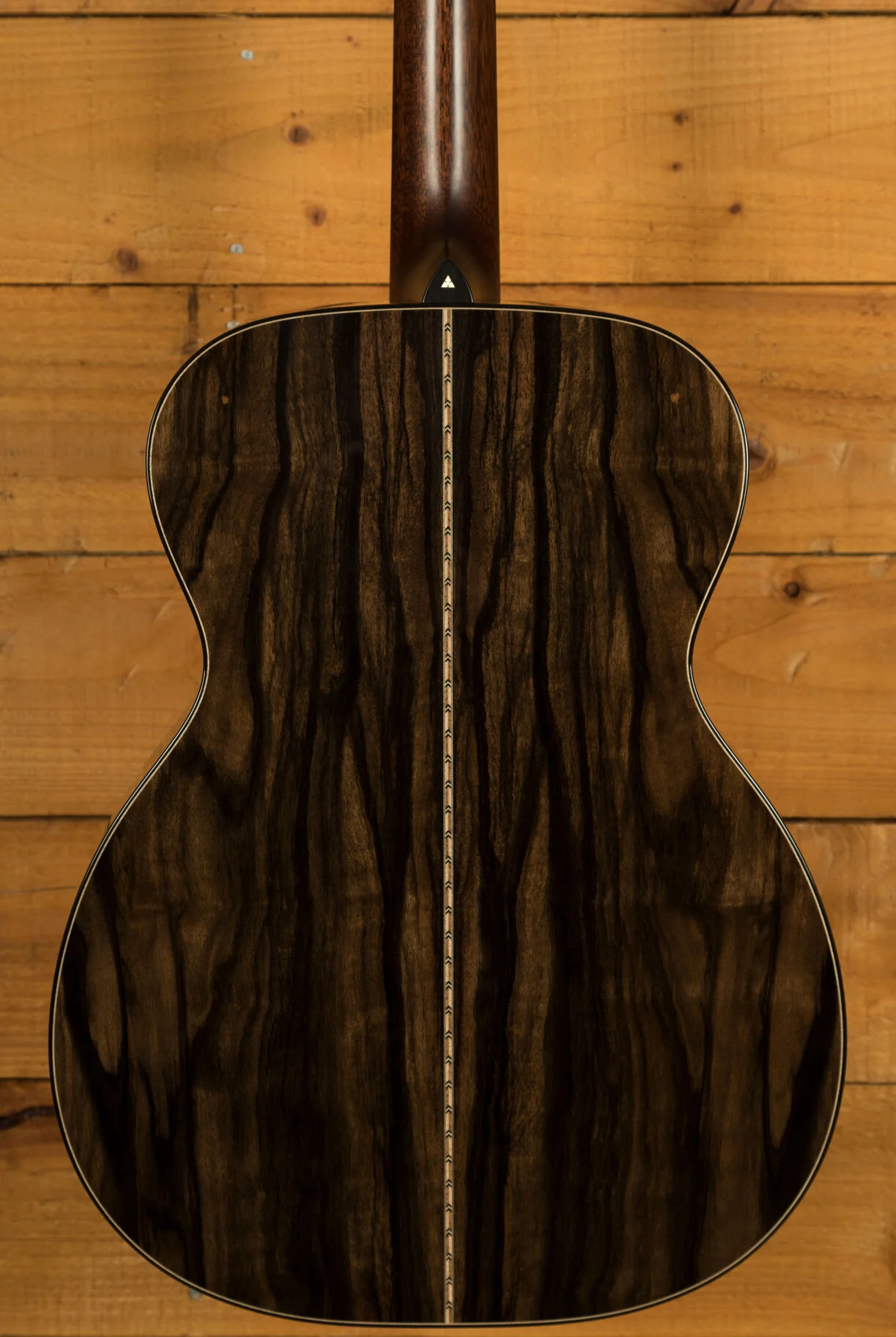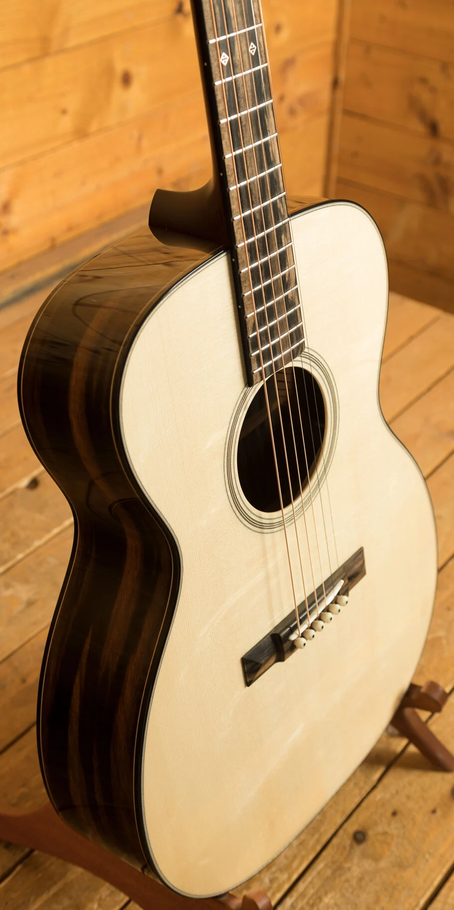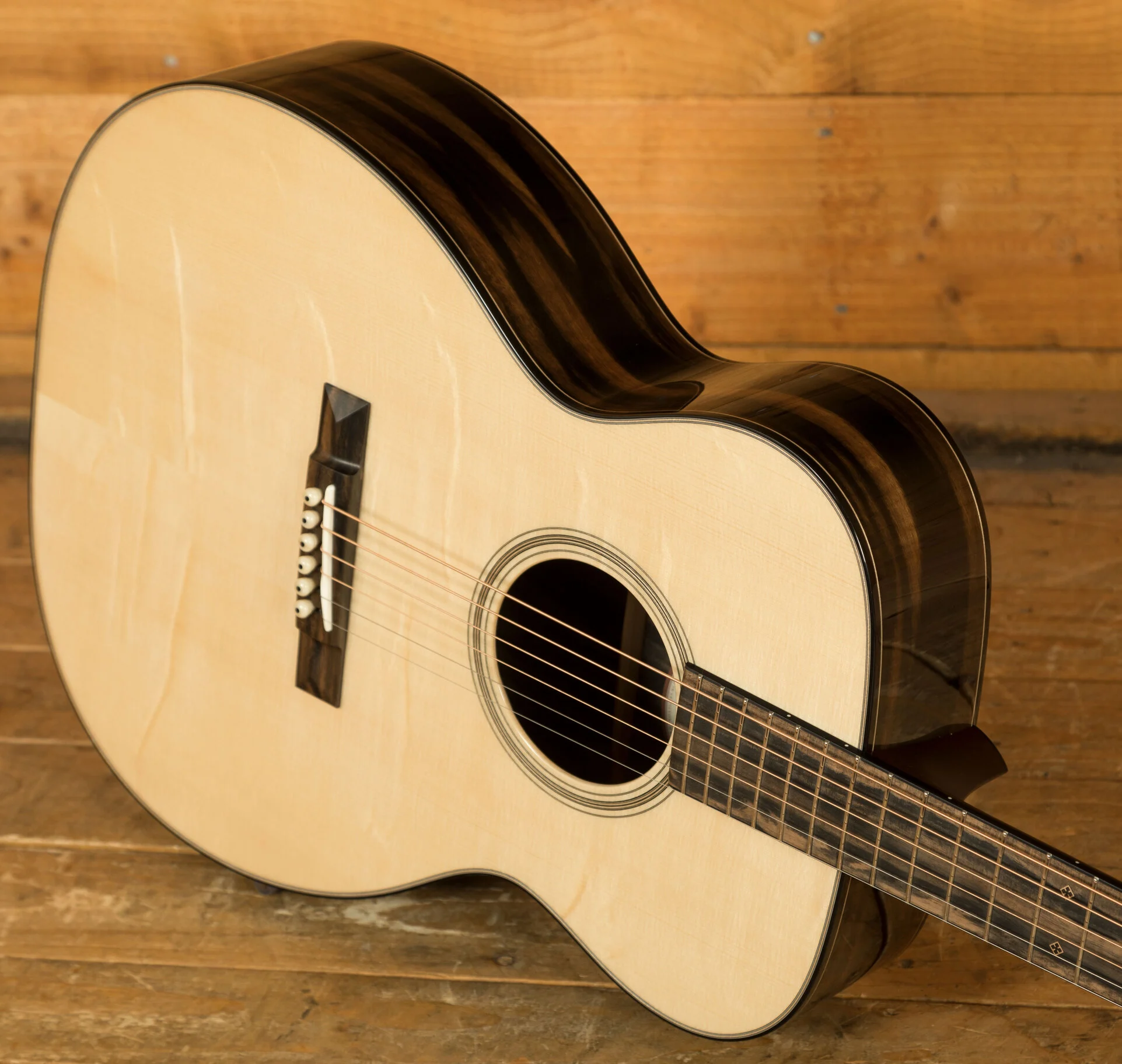 Words truly struggle to capture the exceptional quality and sonic prowess of this guitar. Its voice is nothing short of phenomenal, boasting a remarkable bass response, impressive volume, and articulate punch that belies its smaller OOO dimensions. Visually, it is equally captivating. The soundboard is crafted from exquisitely figured Bearclaw Italian Spruce, protected by a lustrous gloss finish and presented without a pickguard to showcase its natural beauty. The dramatically figured Macassar Ebony graces not only the back and sides but also the headstock veneer, fingerboard, and elegant pyramid bridge, creating a cohesive and undeniably luxurious aesthetic.