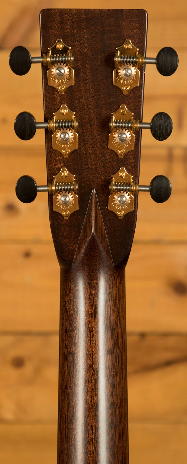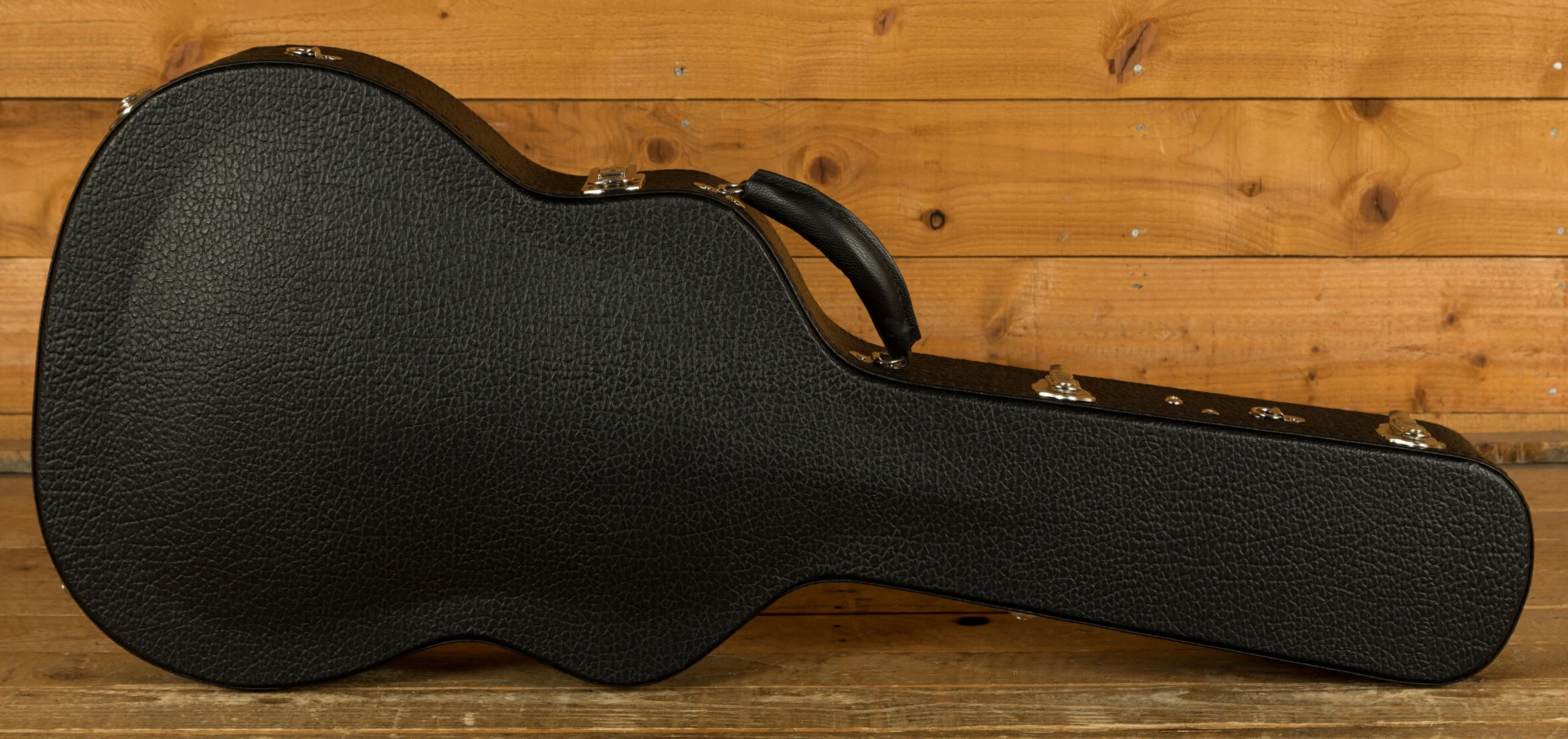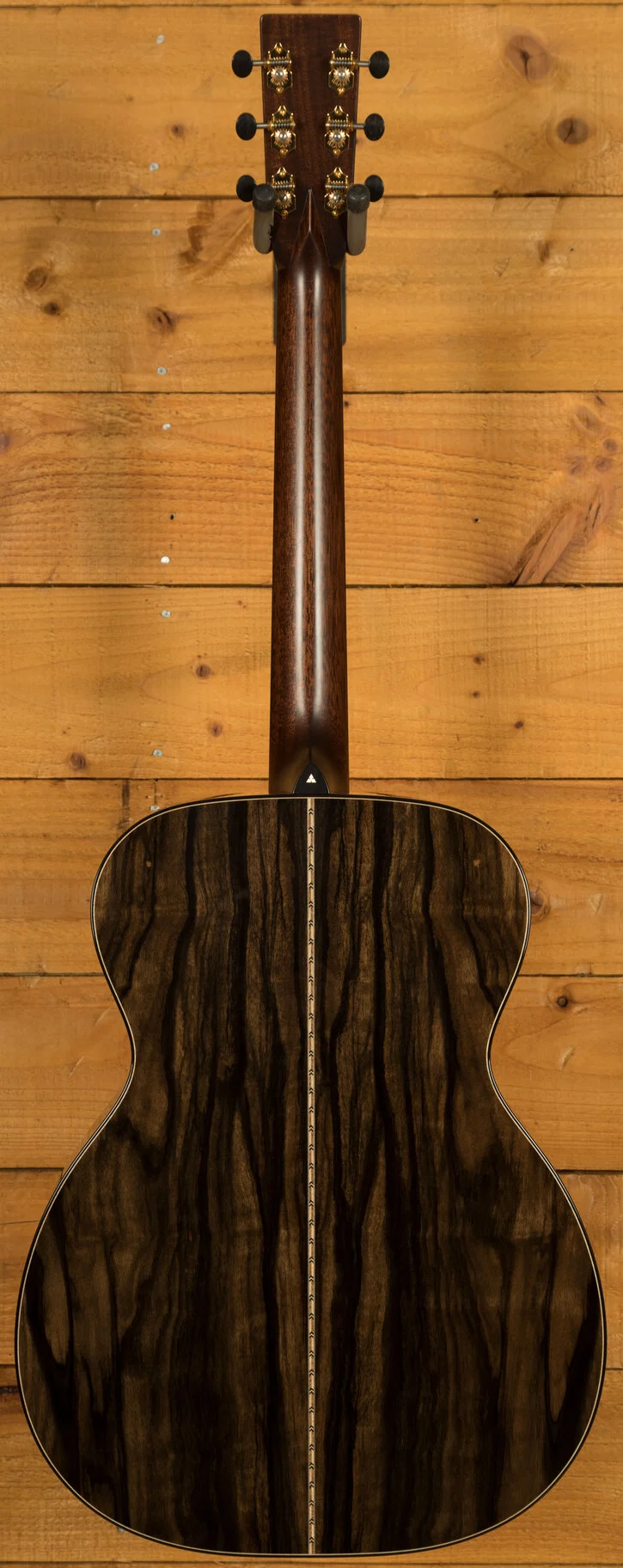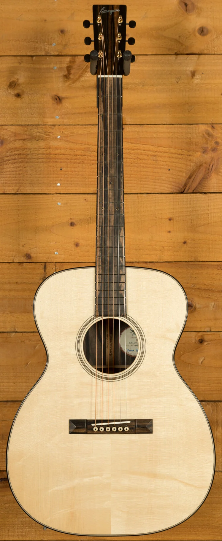 Words truly struggle to capture the exceptional quality and sonic prowess of this guitar. Its voice is nothing short of phenomenal, boasting a remarkable bass response, impressive volume, and articulate punch that belies its smaller OOO dimensions. Visually, it is equally captivating. The soundboard is crafted from exquisitely figured Bearclaw Italian Spruce, protected by a lustrous gloss finish and presented without a pickguard to showcase its natural beauty. The dramatically figured Macassar Ebony graces not only the back and sides but also the headstock veneer, fingerboard, and elegant pyramid bridge, creating a cohesive and undeniably luxurious aesthetic.
