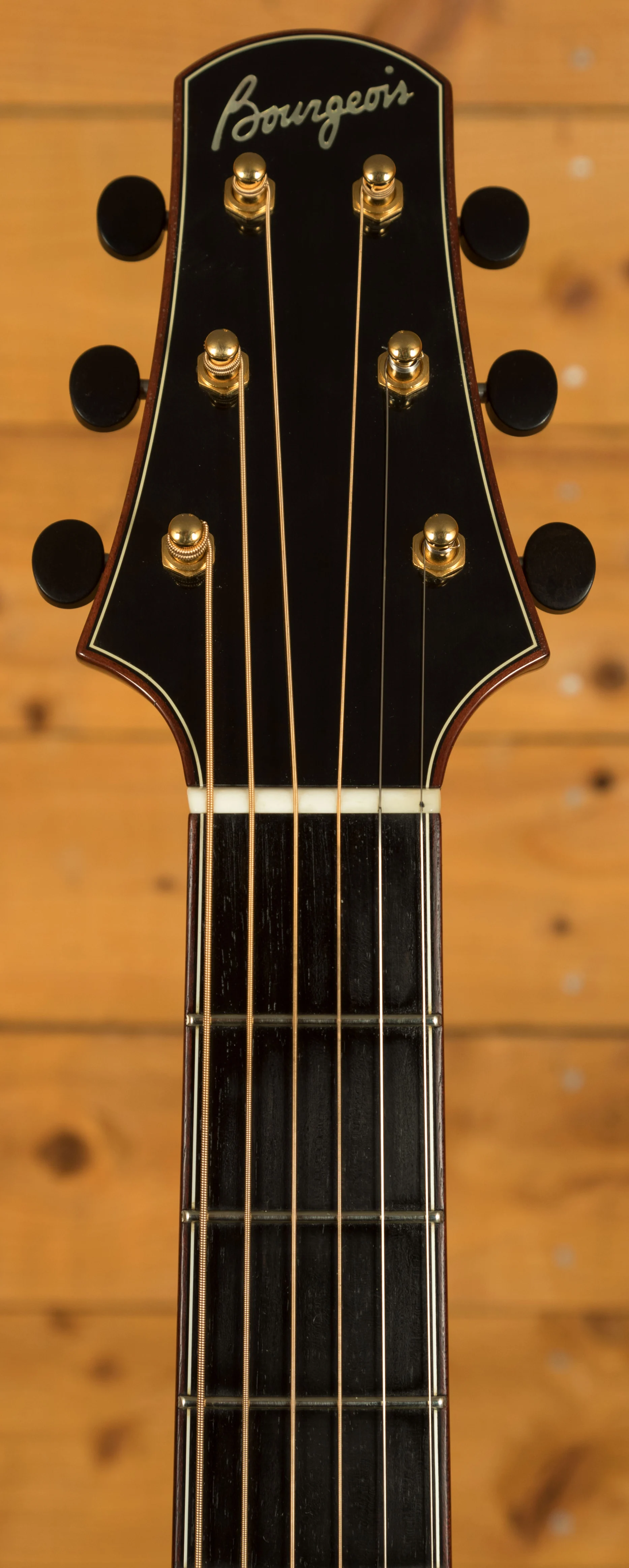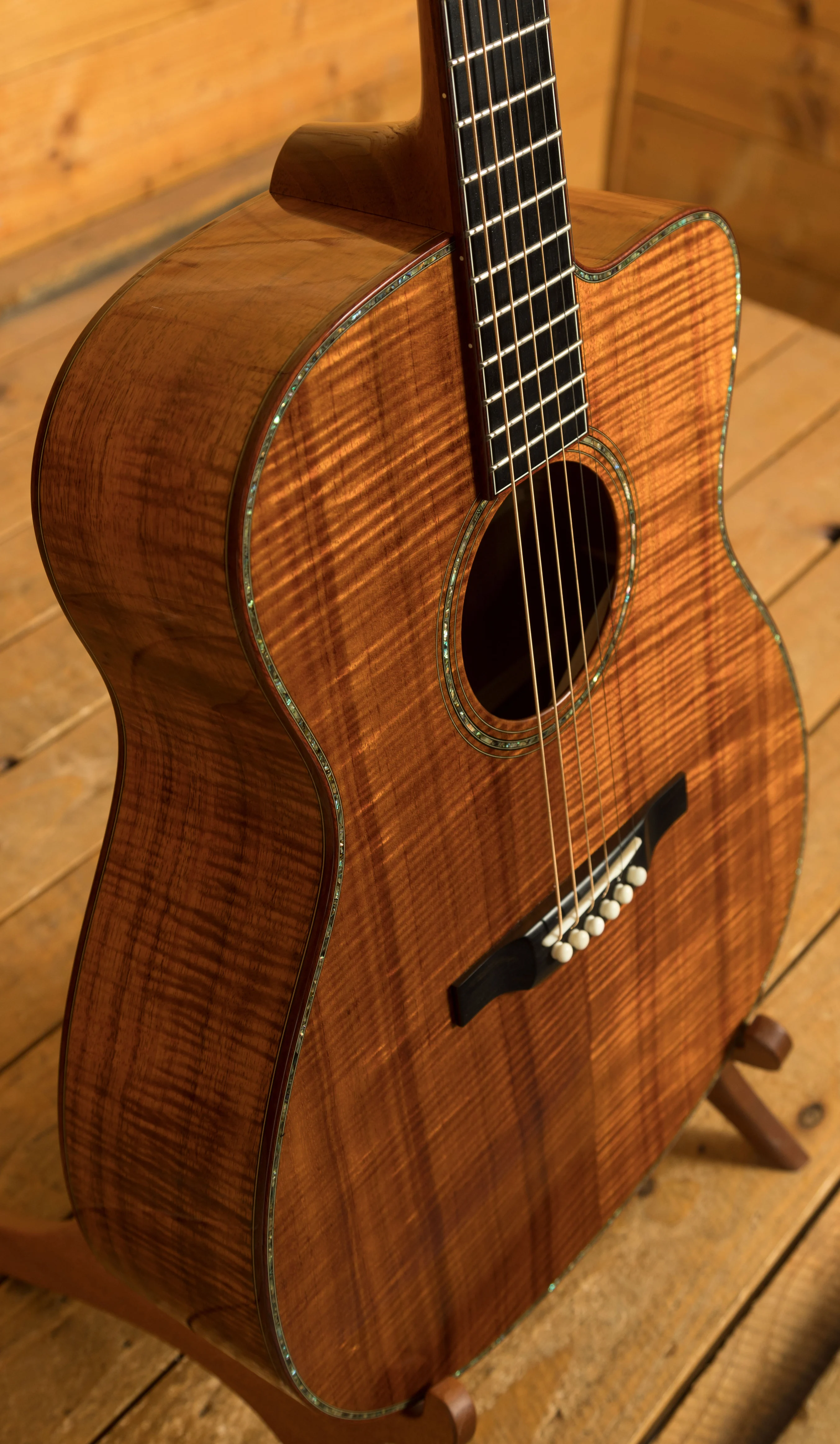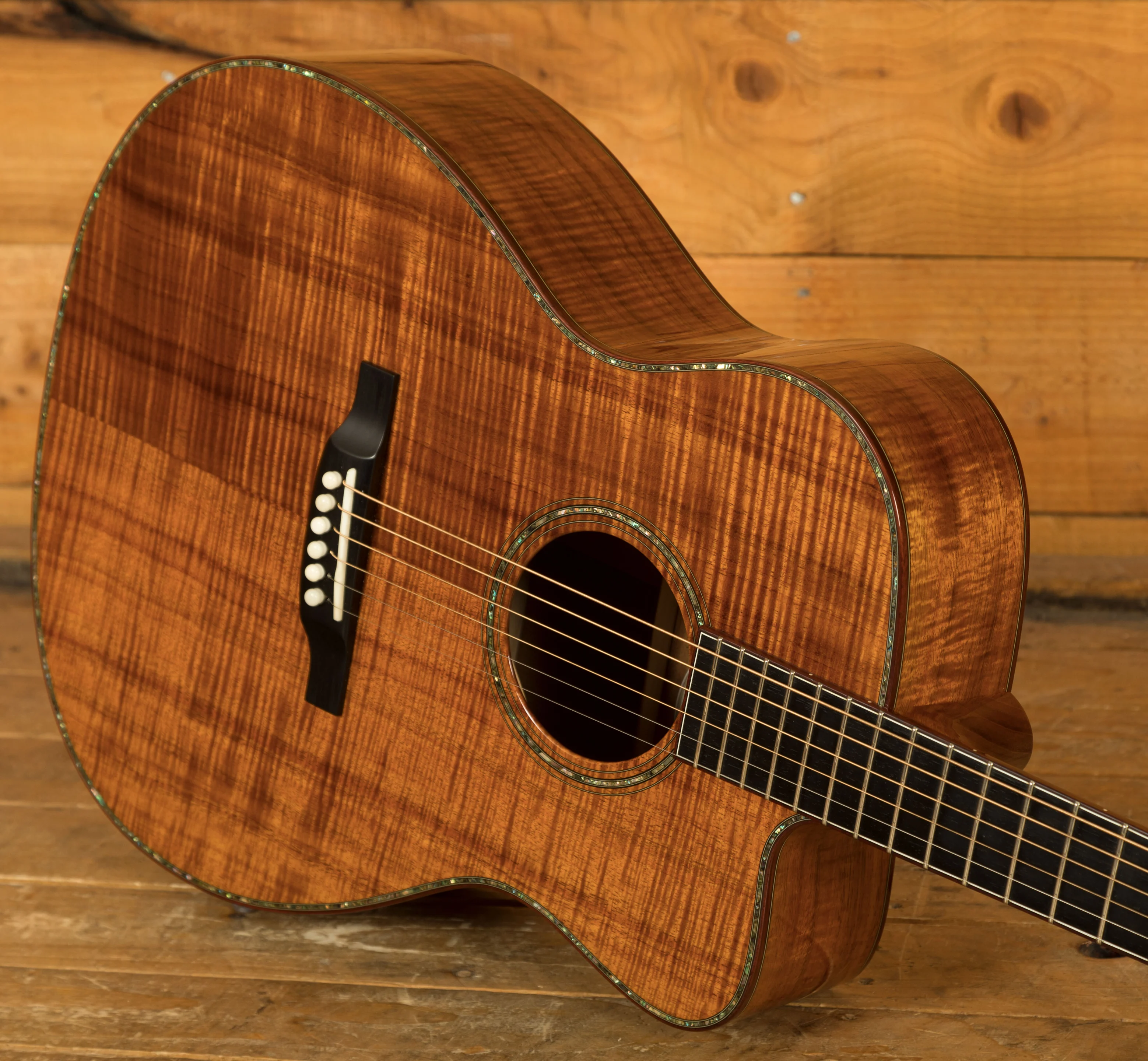 But the real magic of this guitar lies in its exquisite tonewoods and meticulous construction. The top is made from highly flamed and figured curly koa, exhibiting a level of figuring and depth that is simply breathtaking. It's far more visually striking than the koa typically seen on guitars today. The koa's visual beauty is matched by its tonal properties, contributing to a clear and resonant sound with a full warm bass. The abalone rosette, complemented by a multicolour herringbone backstrip and an abalone top border with matching back and side purfling, creates a visually stunning contrast against the koa, adding to the instrument's overall elegance. The 14-fret joint fretboard and bridge are crafted from very dark ebony, providing a smooth playing surface and contributing to the guitar's clear, articulate tone. The nut and saddle are bone, ensuring optimal string vibration transfer. The tuners are open-back, gold-plated Waverly with ebony buttons, adding a touch of classic elegance. The head and fretboard binding are ivoroid, further hinting at the custom nature of this instrument. And, crucially, this guitar was tap-tuned by Dana Bourgeois himself, a testament to the personal attention and care that went into its creation.