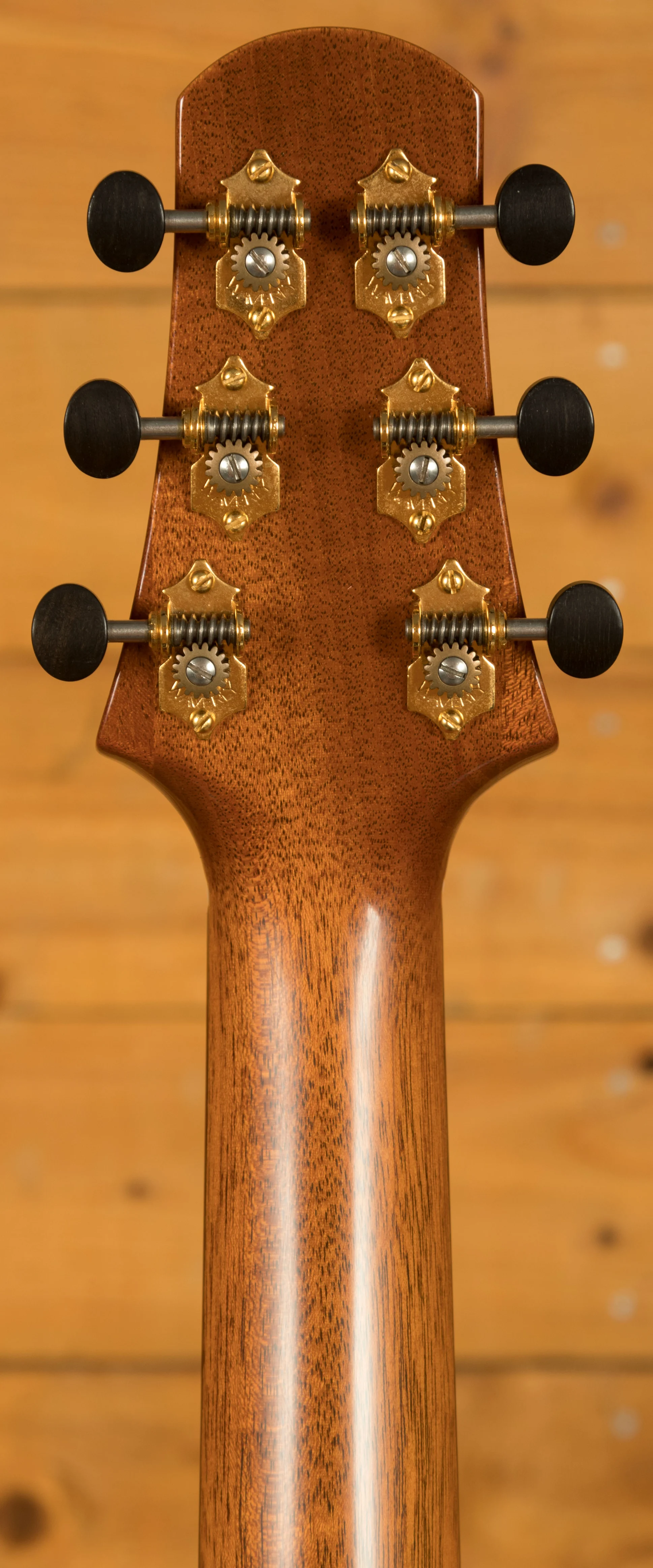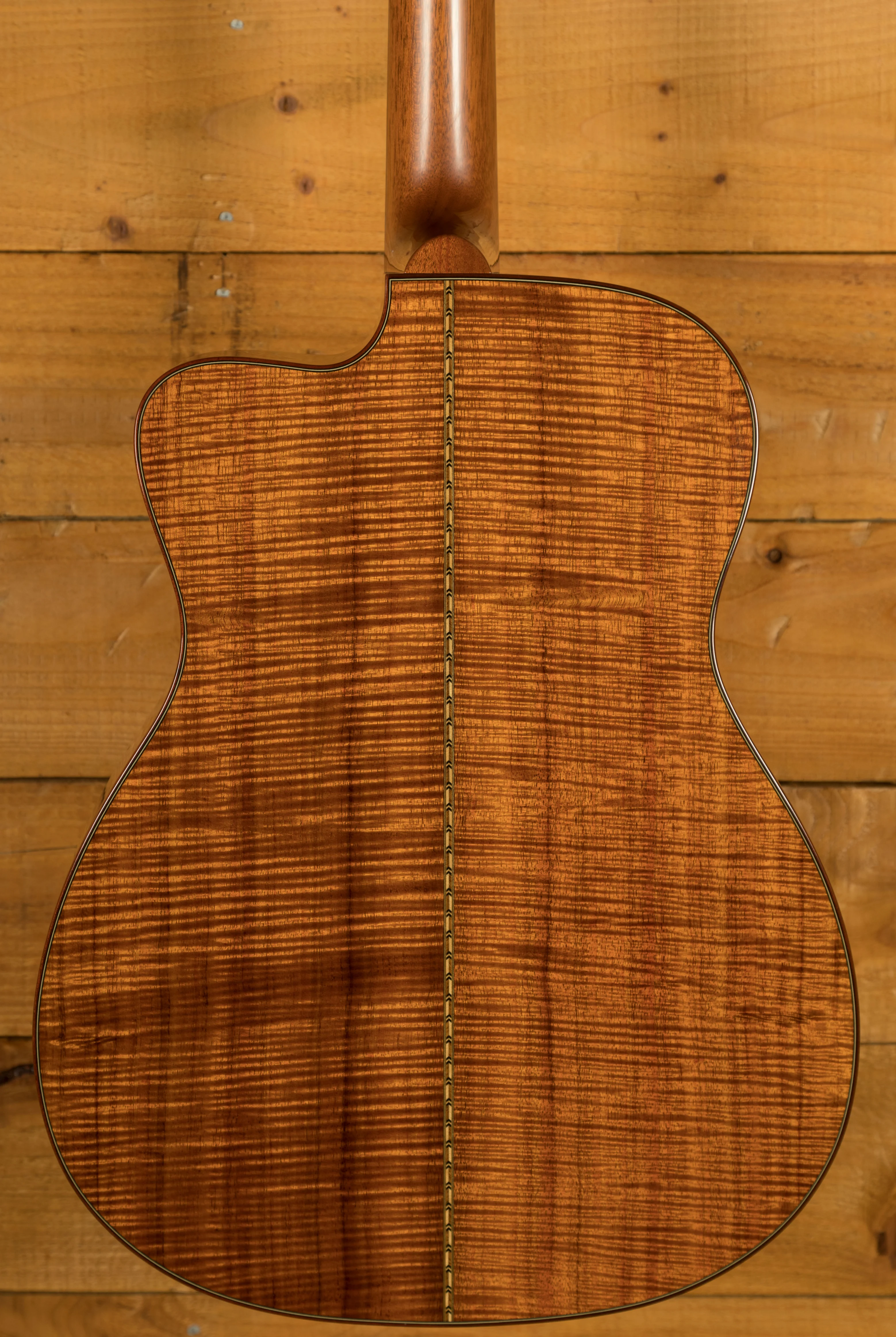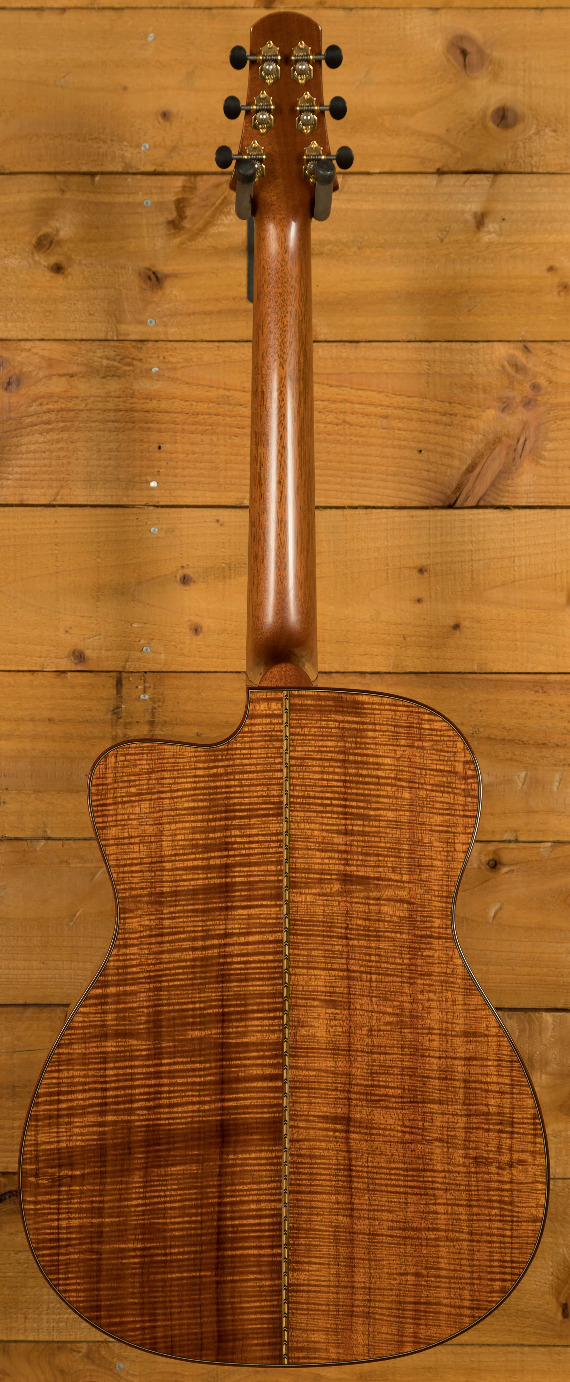 But the real magic of this guitar lies in its exquisite tonewoods and meticulous construction. The top is made from highly flamed and figured curly koa, exhibiting a level of figuring and depth that is simply breathtaking. It's far more visually striking than the koa typically seen on guitars today. The koa's visual beauty is matched by its tonal properties, contributing to a clear and resonant sound with a full warm bass. The abalone rosette, complemented by a multicolour herringbone backstrip and an abalone top border with matching back and side purfling, creates a visually stunning contrast against the koa, adding to the instrument's overall elegance. The 14-fret joint fretboard and bridge are crafted from very dark ebony, providing a smooth playing surface and contributing to the guitar's clear, articulate tone. The nut and saddle are bone, ensuring optimal string vibration transfer. The tuners are open-back, gold-plated Waverly with ebony buttons, adding a touch of classic elegance. The head and fretboard binding are ivoroid, further hinting at the custom nature of this instrument. And, crucially, this guitar was tap-tuned by Dana Bourgeois himself, a testament to the personal attention and care that went into its creation.