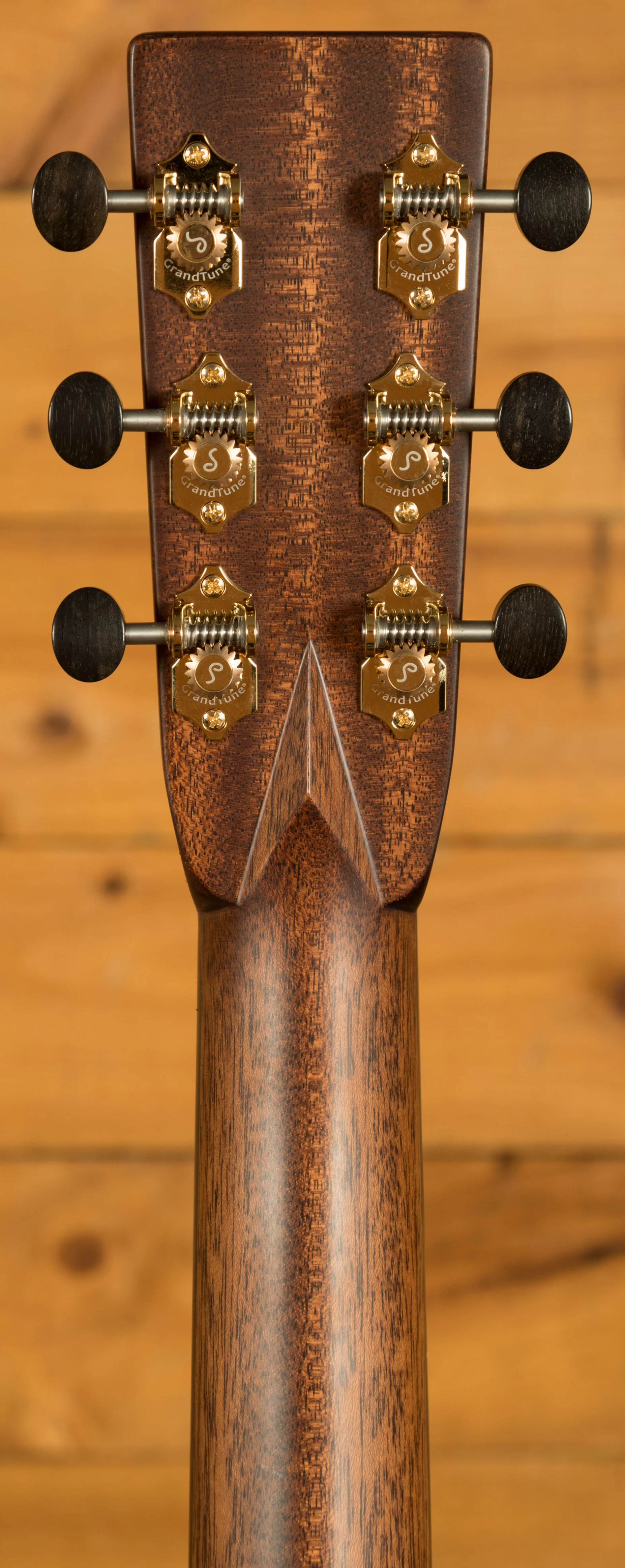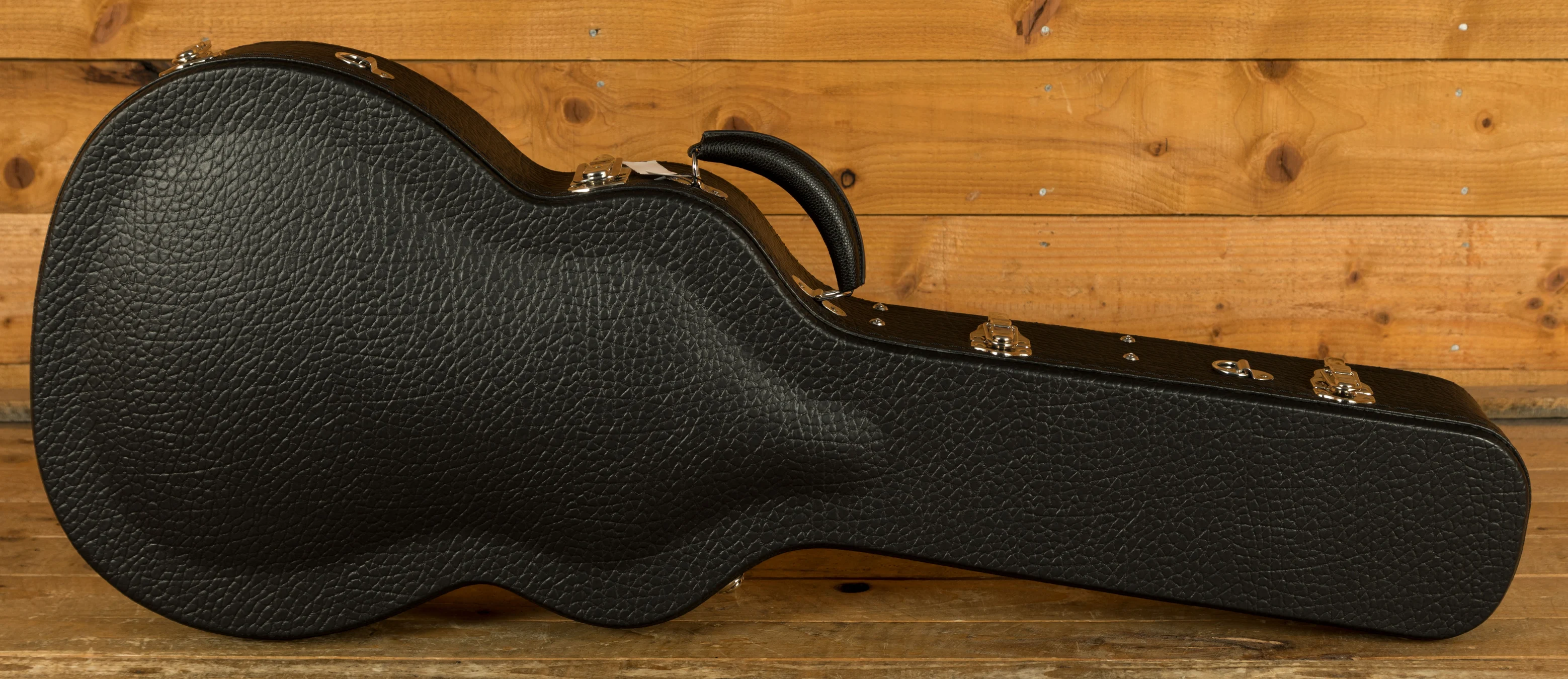 The guitar offers a comfortable playing experience, featuring a 14-fret, one-piece Genuine Mahogany neck with a 25.5" scale length and a 1 23/32" bone nut. The inclusion of an Ebony bridge and ivoroid pins further contributes to the instrument's quality. Tuning stability and accuracy are ensured by Schaller Grand Tune Gold/Ebony tuners, adding to the boutique feel of the guitar.