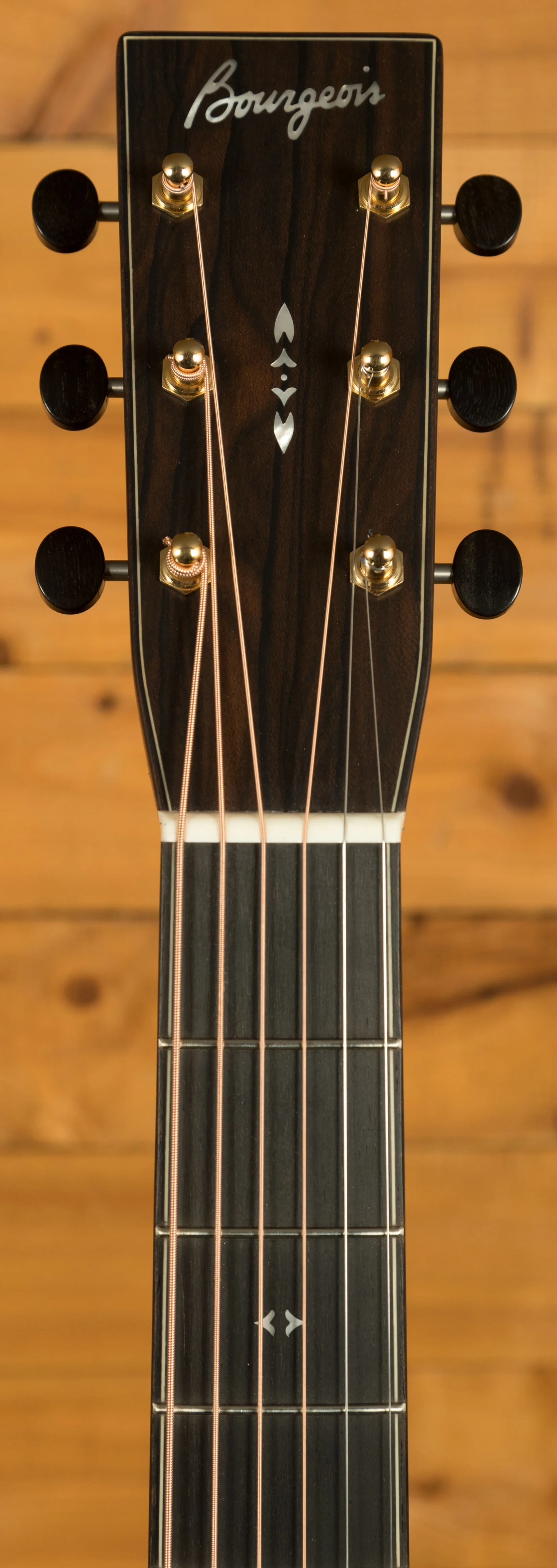 The aesthetic of the Touchstone Signature reflects an understated elegance. The body, fretboard, and headstock are bound with Ziricote, a figured wood that complements Dana Bourgeois' distinctive tri-colour herringbone top border and delicate pearl inlays. According to Dana Bourgeois, the design was conceived approximately two decades ago with the aim of creating a unique look for their Dreadnought and OM guitars, favouring understated wood bindings and historically inspired marqueteries and inlays to harmonise with classic aesthetics.