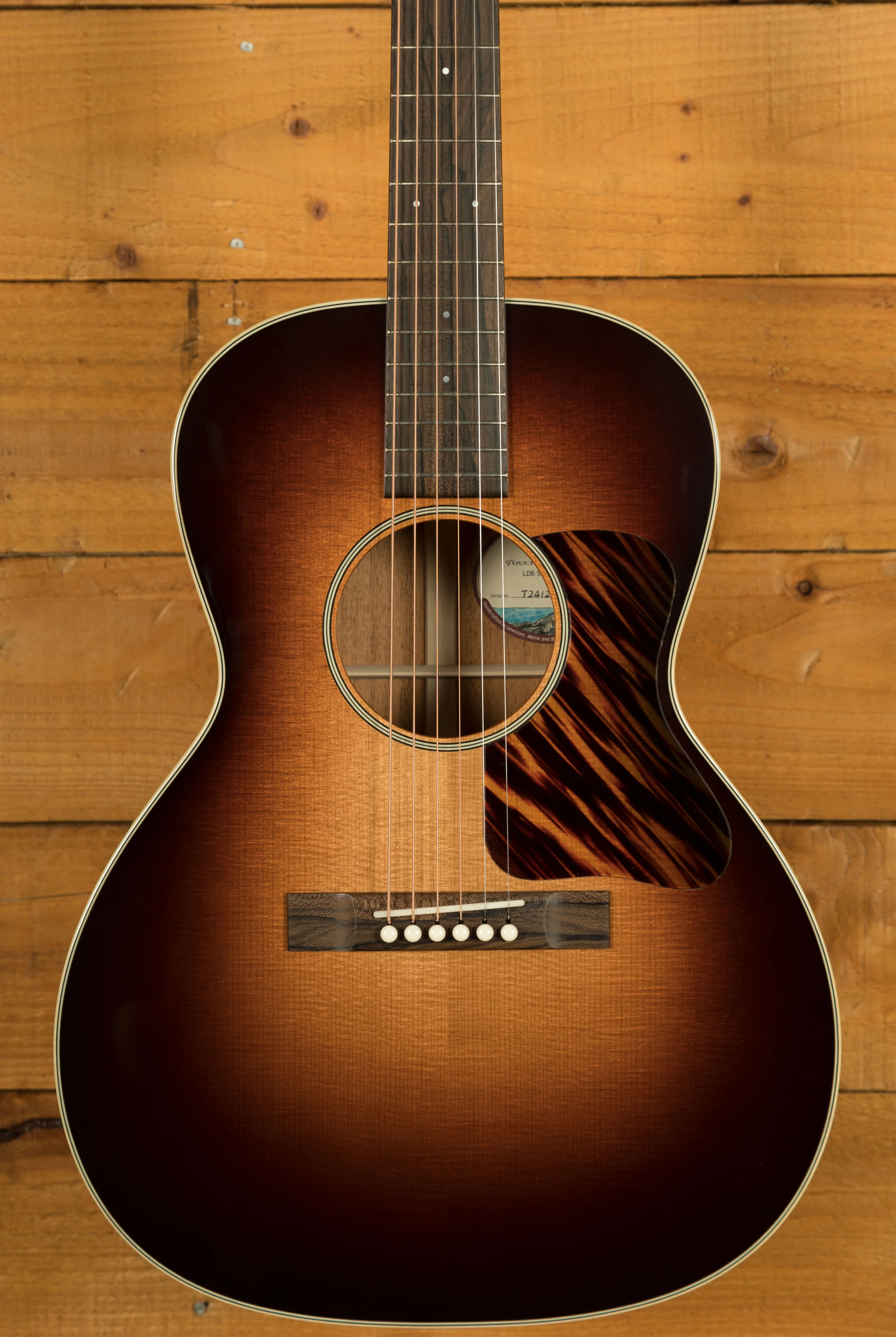 The L-DBO body shape sits between a 00 and a 000/OM in size and features a 25" scale neck. Its slightly narrower upper bout contributes to its distinctive wedge-like appearance. Notably, the L-DBO incorporates a larger-than-usual soundhole for its size and narrow, 1/4" top bracing. This combination is engineered to produce a surprising amount of power and presence from a relatively compact instrument. Dana Bourgeois, the company's founder, attests to the L-DBO's capabilities, stating that it has become his preferred guitar after years of playing dreadnoughts, and suggesting that its sound can be mistaken for that of a much larger guitar; just listen to Sierra Hull or Courtney Hartman to hear for yourself.