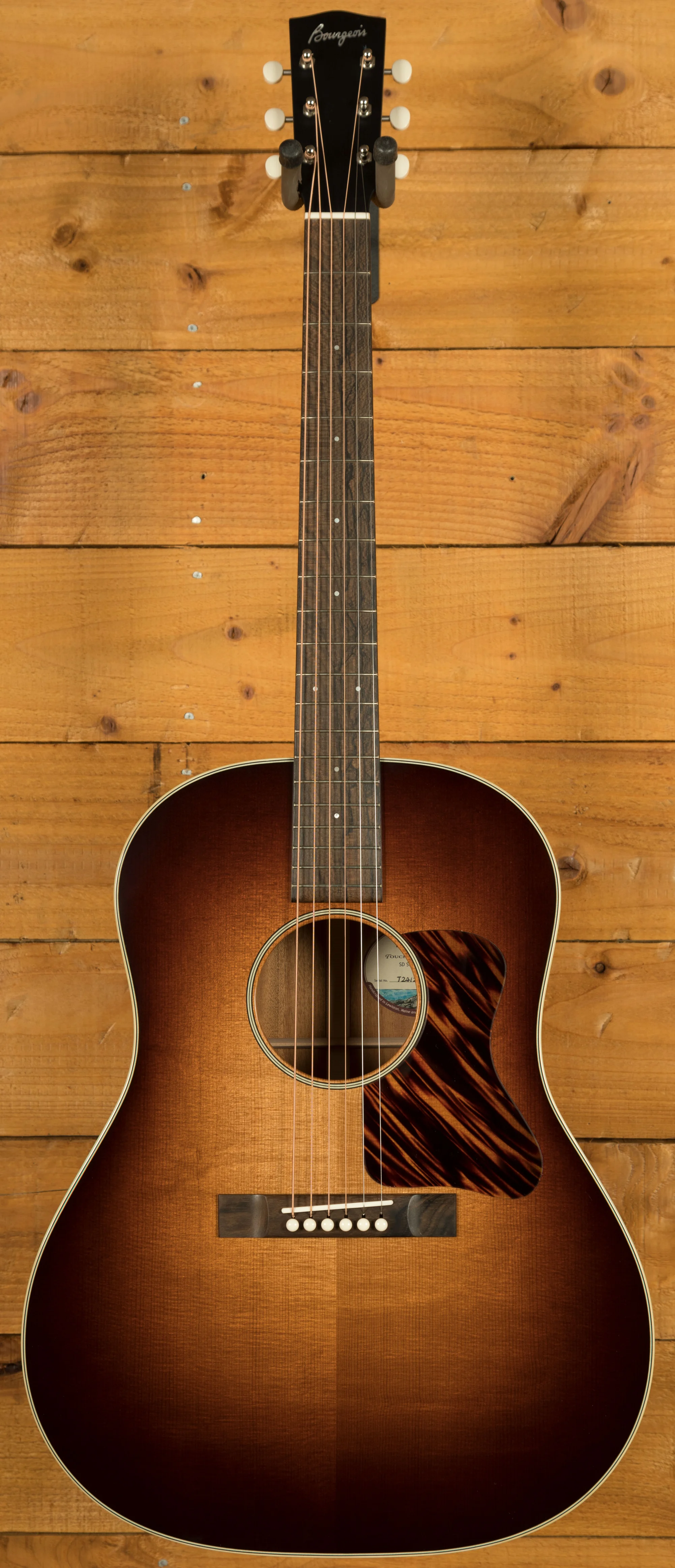 The Slope D body shape distinguishes itself with a tonal presence that offers both boldness and warmth. While sharing a lineage with "square shouldered" Dreadnoughts, the Slope D features a curvier form, being slightly wider and deeper. A key structural difference lies in its shorter 25-inch scale length. This design has historically been favoured by country musicians and remains popular amongst various American roots music stylists, often being cited as an excellent choice for accompanying vocals. While excelling at flatpicking, the Slope D is also particularly well-regarded as a fingerpicker's Dreadnought.