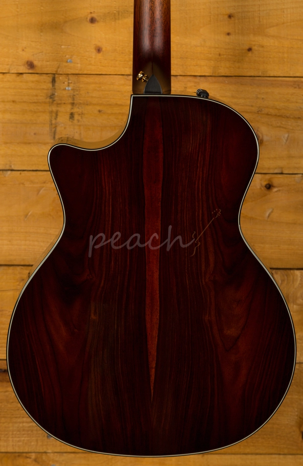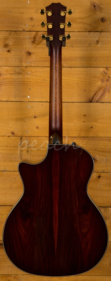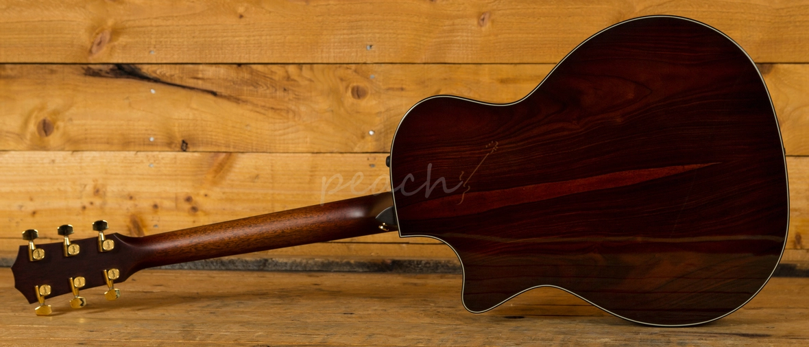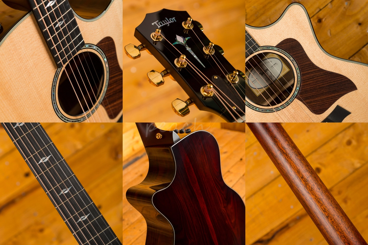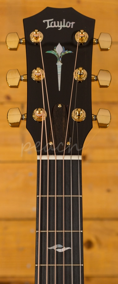 There are a number of high end appointments on this beauty including a single ring Paua Abalone rosette, ebony binding, mother of pearl element inlays and the same Nouveau peghead inlay as on Taylor Presentation Series models.
