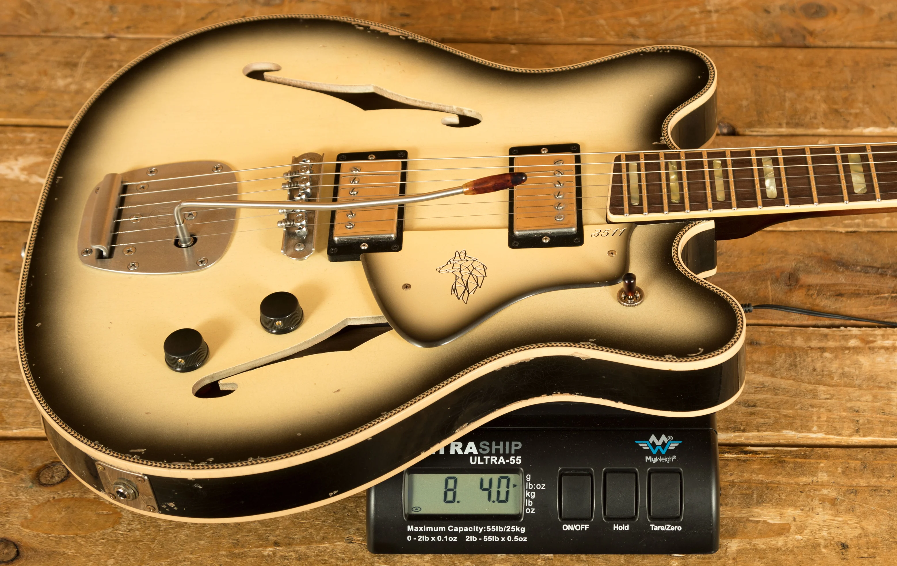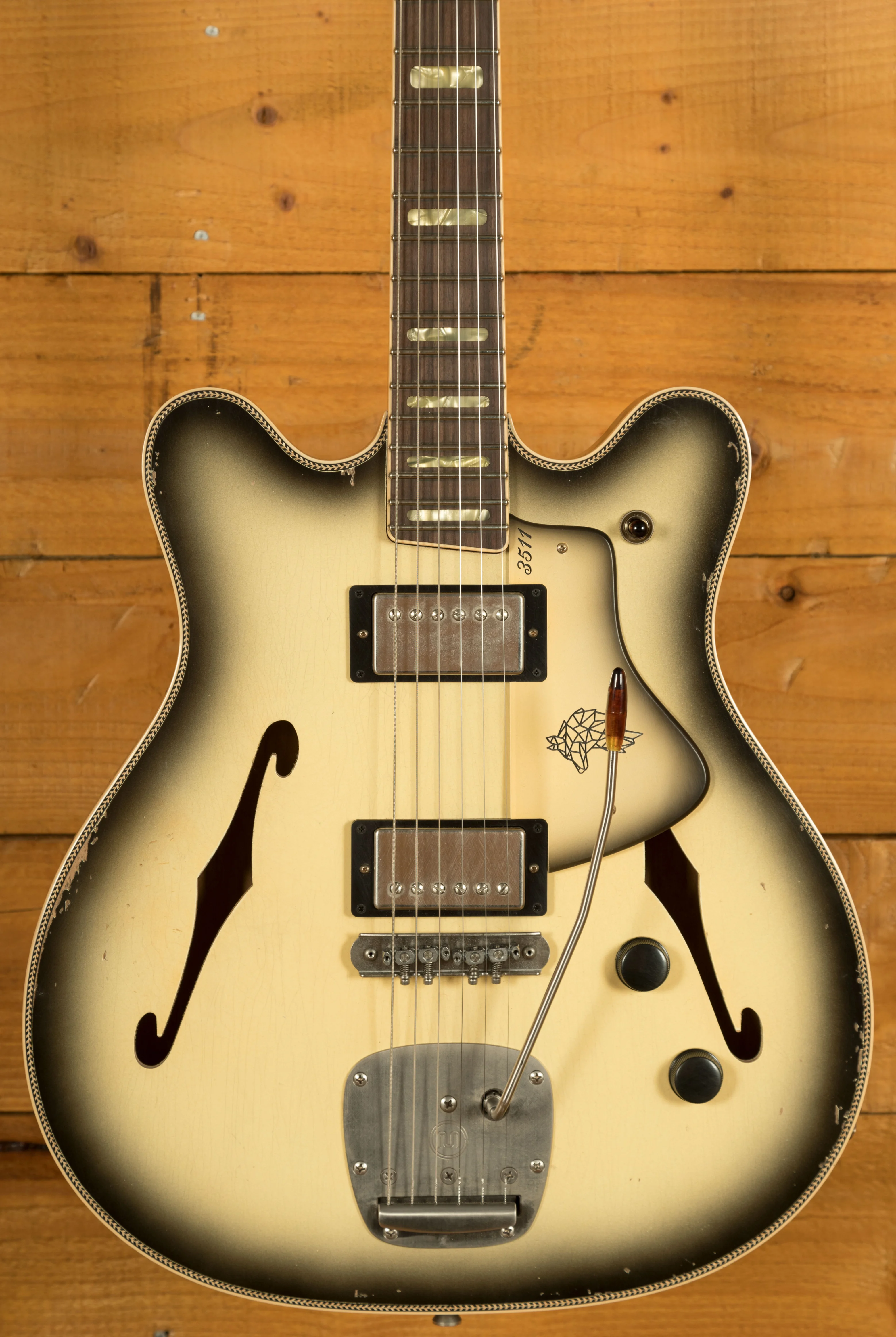 Crafted with precision, the 3511 Lobo Semi-Hollow features an Alder body with an Alder top finished in Aged Antigua. The Double Cream binding with Herringbone purfling really ties it all together. This masterpiece boasts a Mastery bridge and tremolo whilst the matching Antigua Lobo pickguard adds the final touch to its aesthetic.