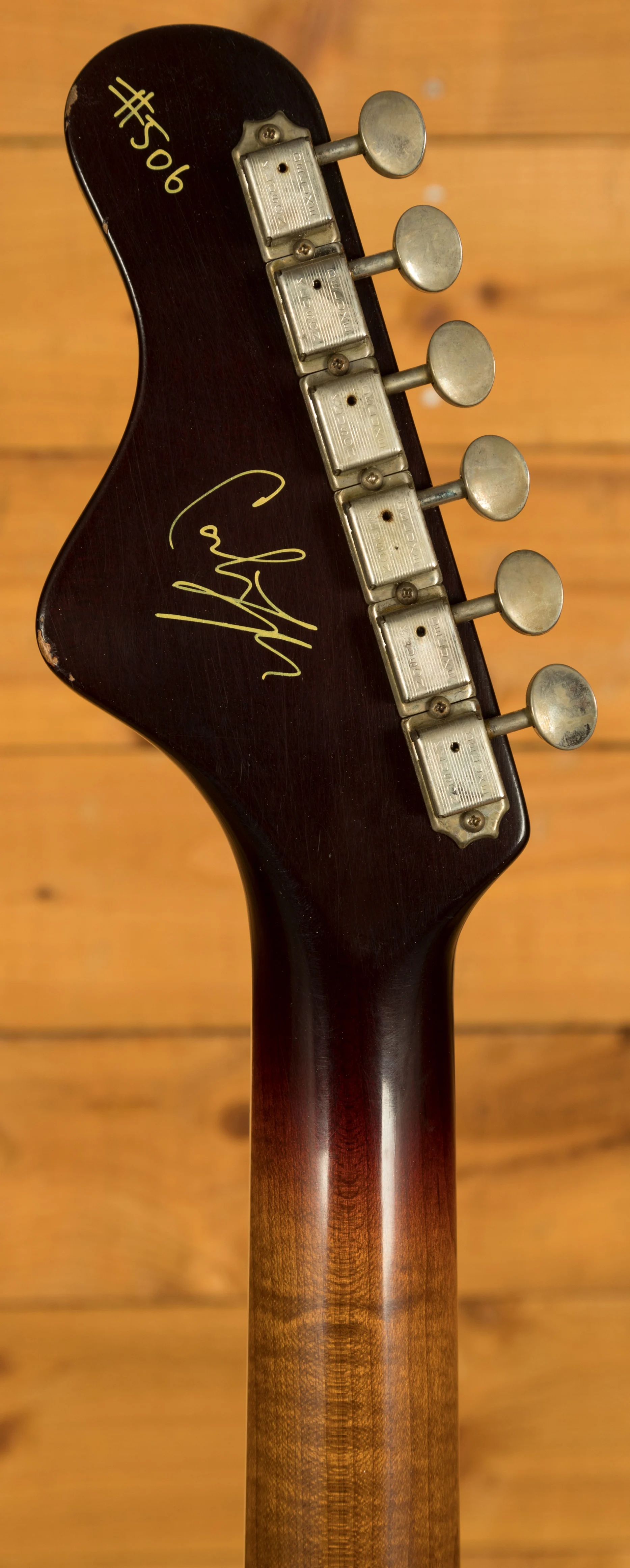 The neck is constructed from Quarter Sawn Roasted Maple, boasting a "V" profile with a Dark Mole Tint finish and a Rosewood Fretboard. Additional features include Kluson Tuners, 21 Jescar Frets, a 25.5" Scale Length, 12" Radius, Nut Width of 1.65", Block inlays, Cream bound neck, and a Bone Nut.