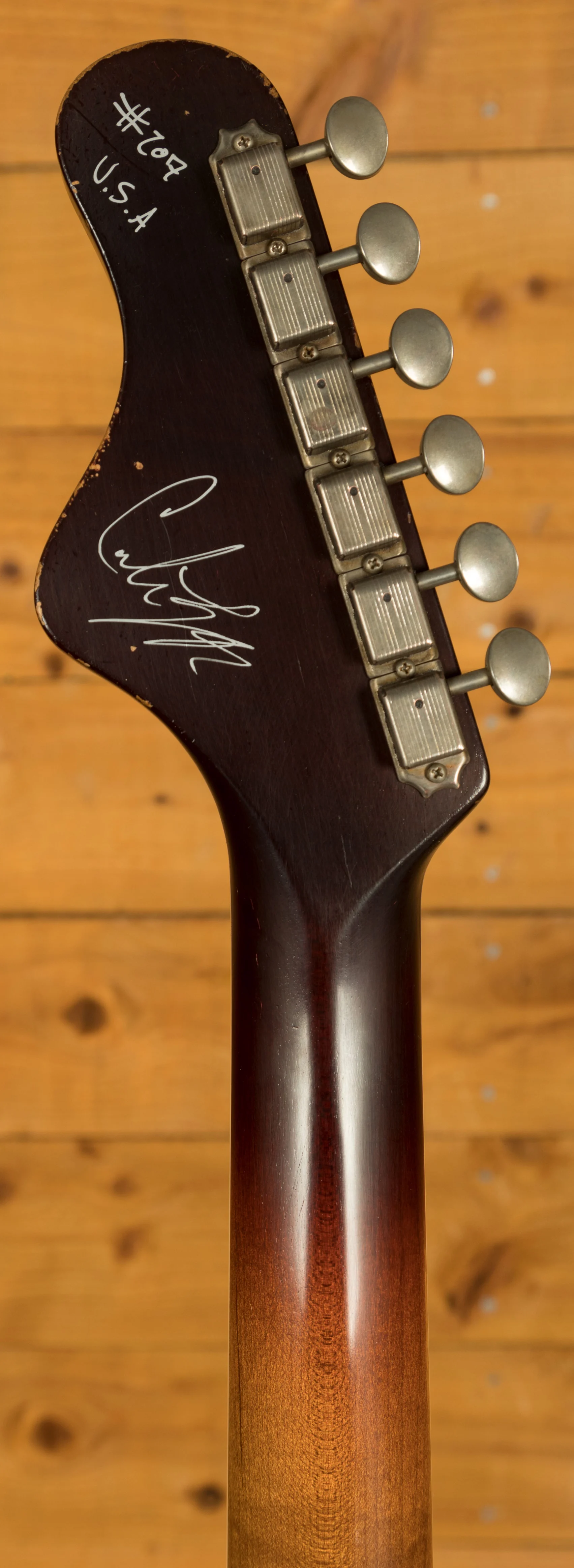 The neck is constructed from Quarter Sawn Roasted Maple, boasting a "Medium V" profile with a Dark Mole Tint finish and a Rosewood Fretboard. Additional features include Kluson Tuners, 21 Jescar Frets, a 27" Scale Length, 12" Radius, Nut Width of 1.725, Cream Neck Binding, Block inlays, and a Bone Nut.