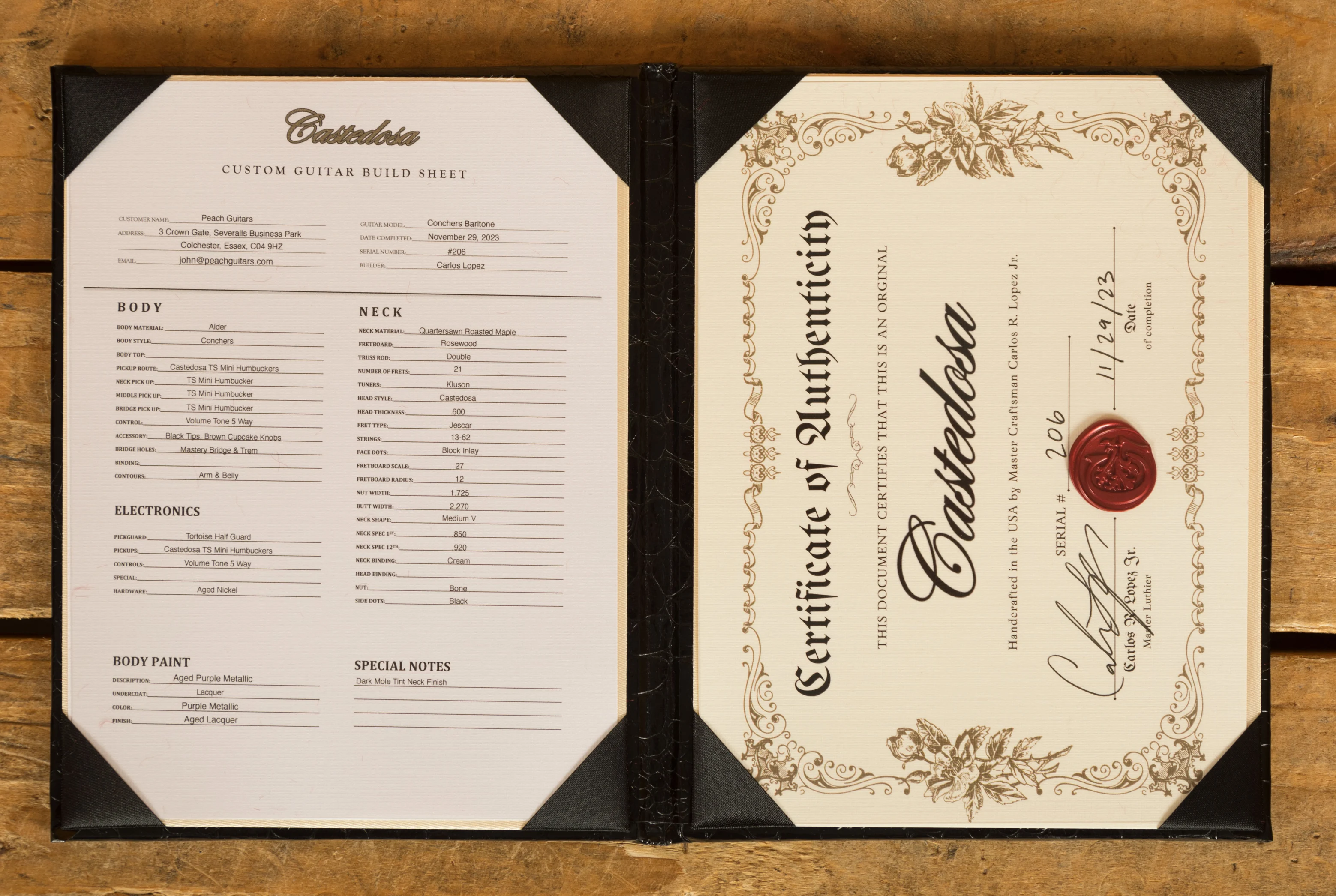Delivering a powerful sonic experience, the Conchers Baritone is equipped with 3 Custom Castedosa Hand Wound TS Mini Humbuckers. Control is at your fingertips with Volume and Tone controls, a 5-Way Switchcraft pickup selector, CTS Pots, and Aged Nickel Hardware. Experience the meticulous craftsmanship and attention to detail that sets the Castedosa Conchers Baritone apart, delivering exceptional tone and playability for musicians who demand the best.