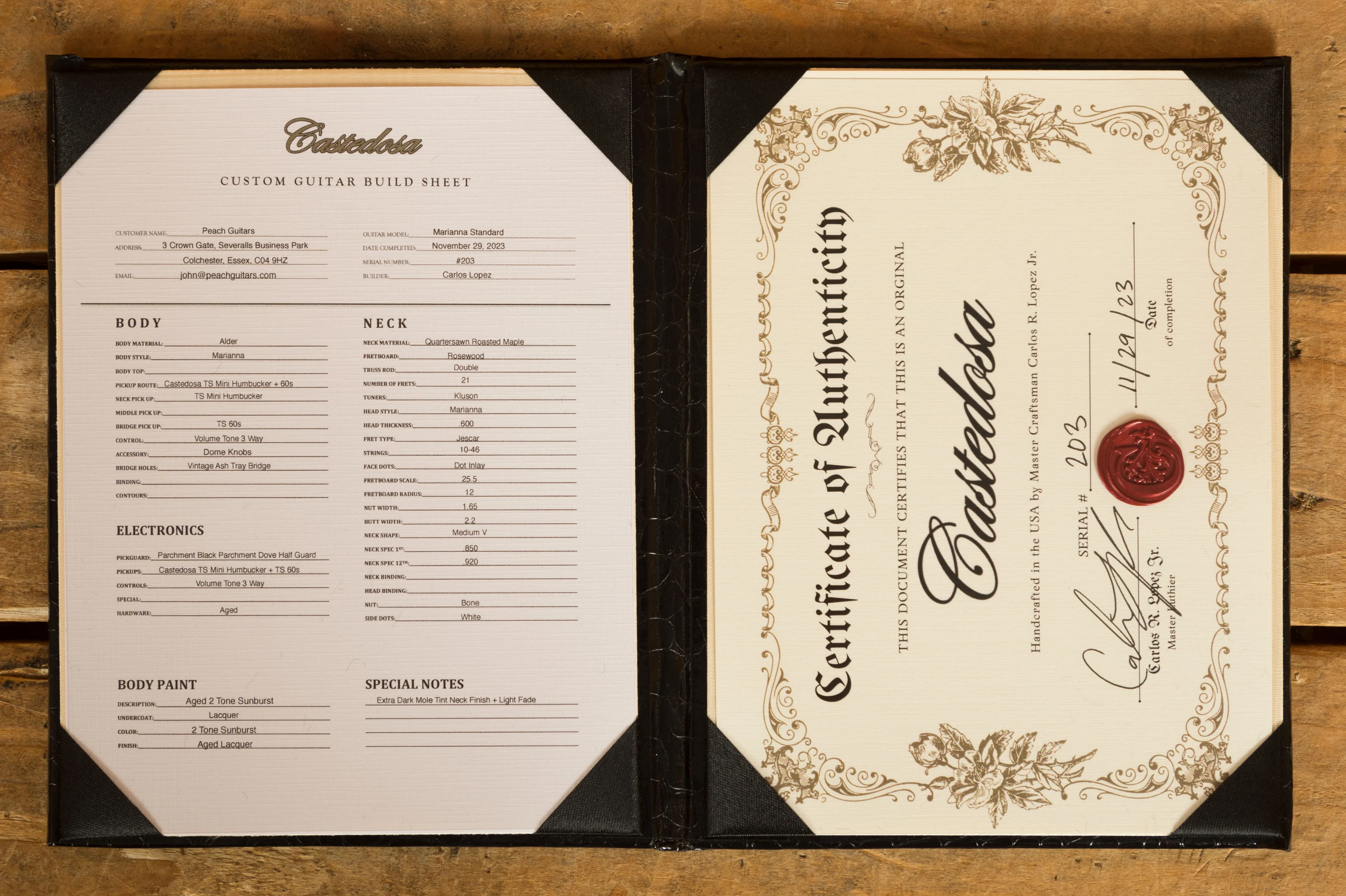 Delivering a powerful sonic experience, the Marianna Standard is equipped with a Custom Castedosa Hand Wound TS Mini Humbucker in neck and TS 60s in bridge. Control is at your fingertips with Volume and Tone controls, a 3-Way Switchcraft pickup selector, CTS Pots, and Aged Hardware. Experience the meticulous craftsmanship and attention to detail that sets the Castedosa Marianna Standard apart, delivering exceptional tone and playability for musicians who demand the best.