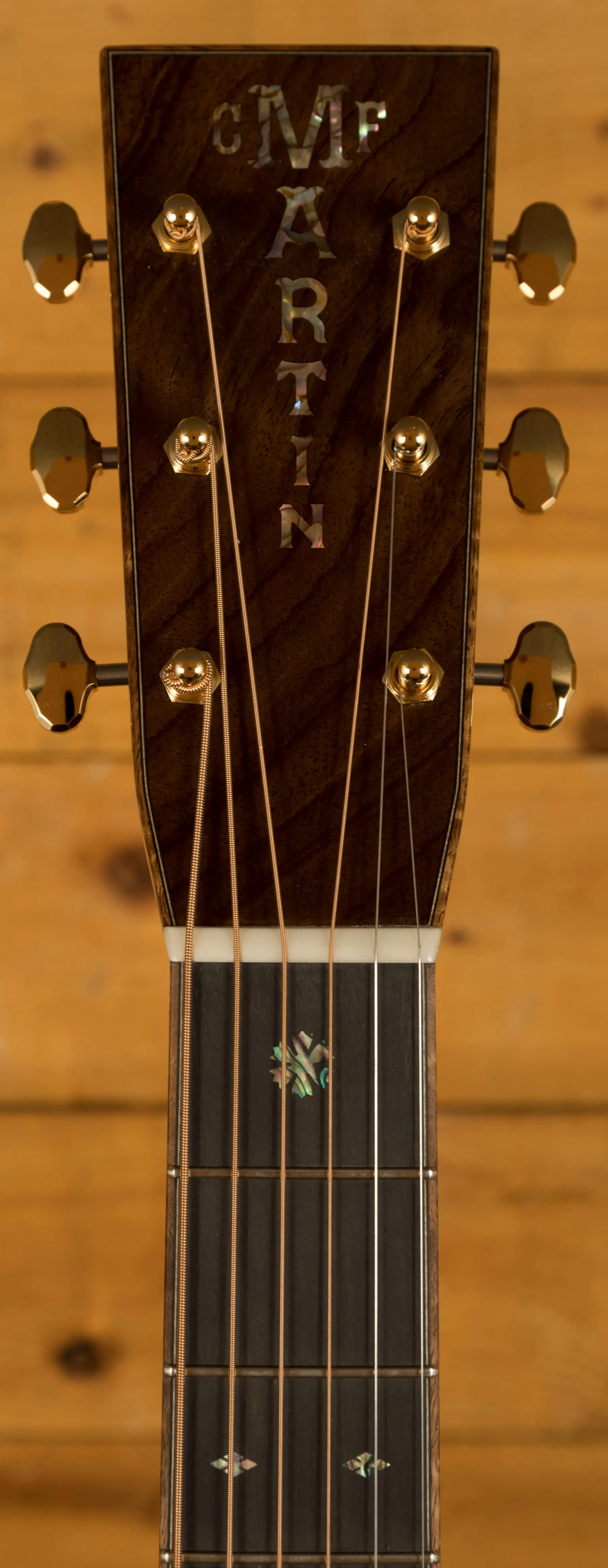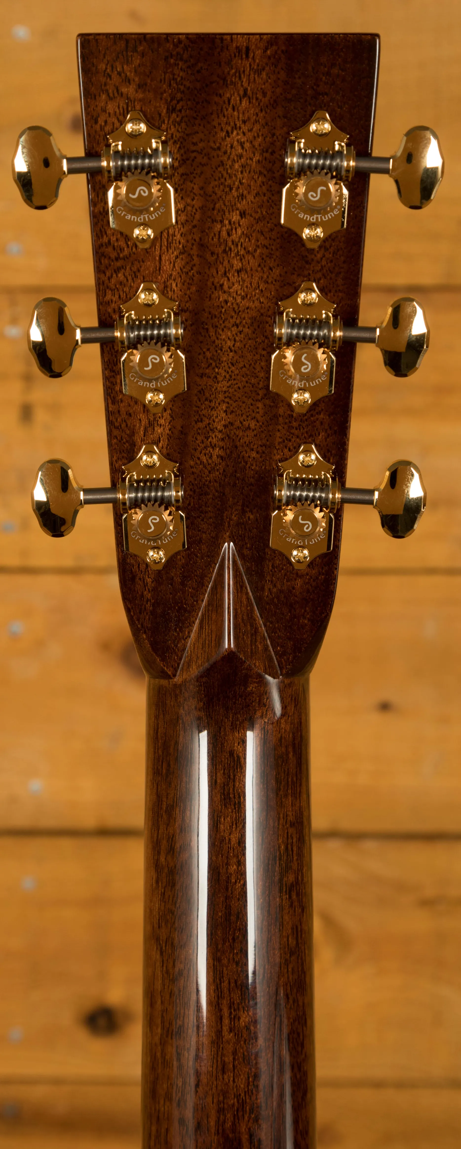 The neck is an absolute dream to play. With a Modified Low Oval neck shape, 16" radius, 24.9" scale length and a 1 3/4" nut width, this Martin is supremely comfortable and smooth underhand. The Black Ebony fingerboard is the perfect partner for this neck; beautifully crafted it’s a real treat to play. The CMF Abalone block inlay, style 45 snowflake fingerboard inlays and gold Schaller tuners really do set this guitar apart.