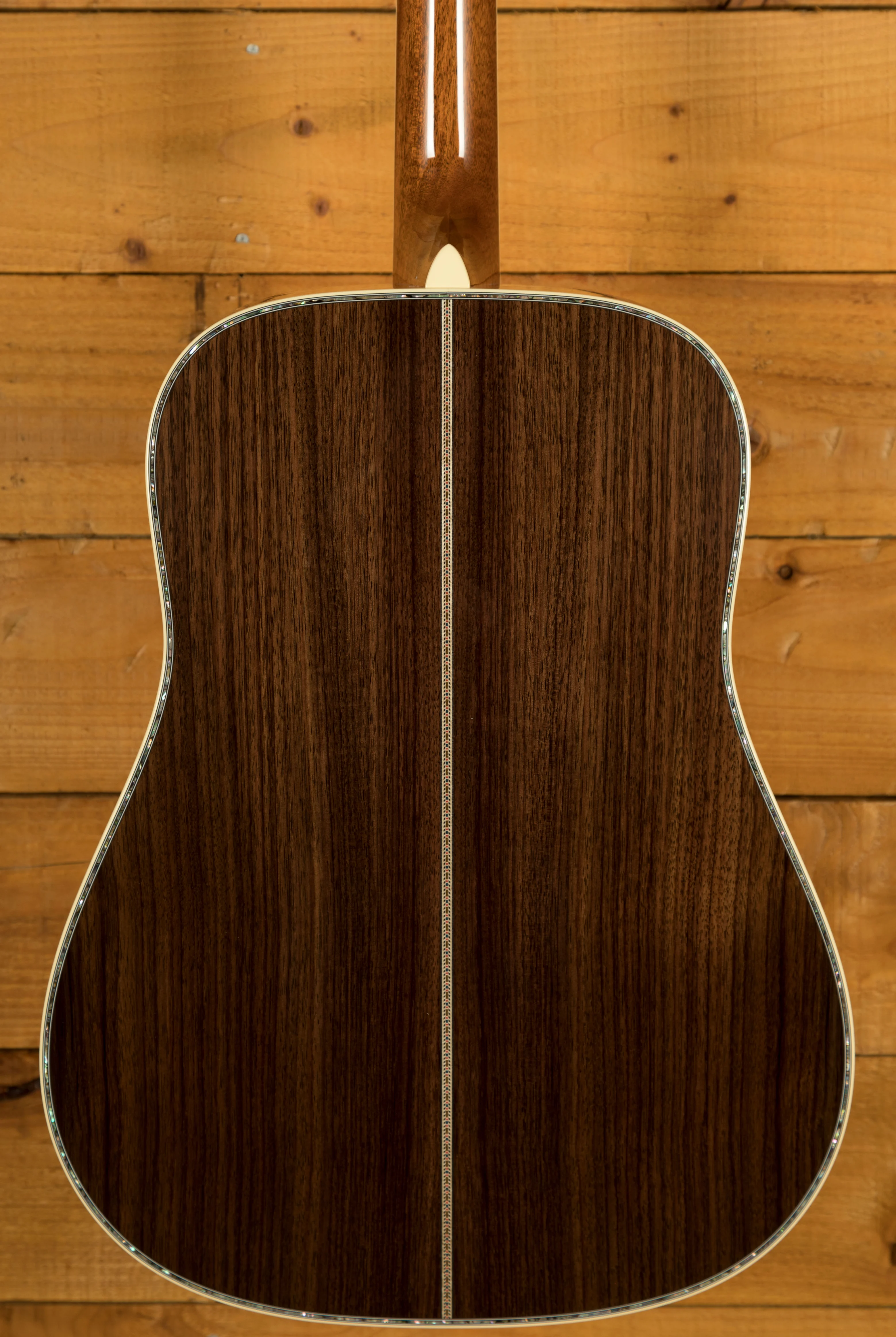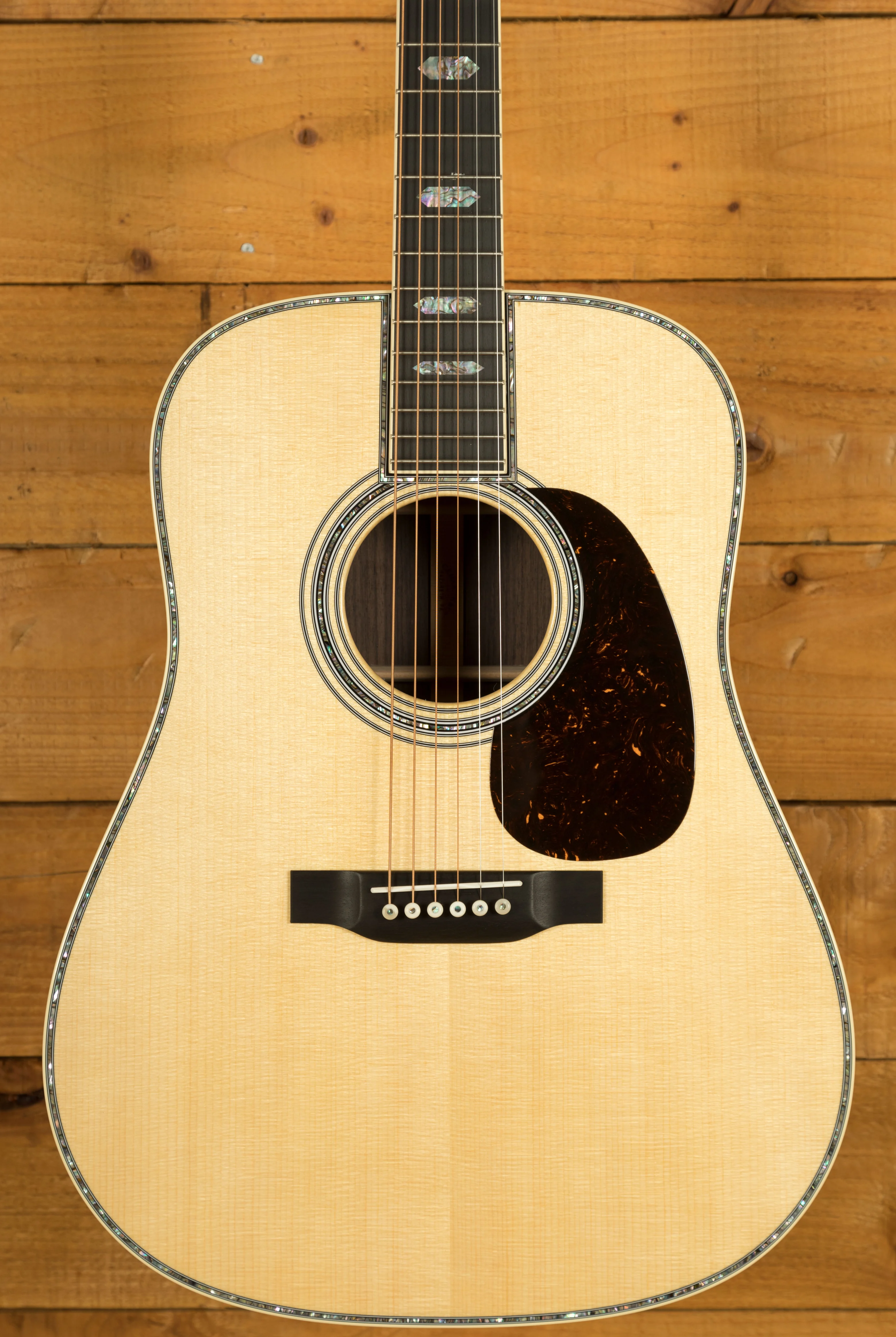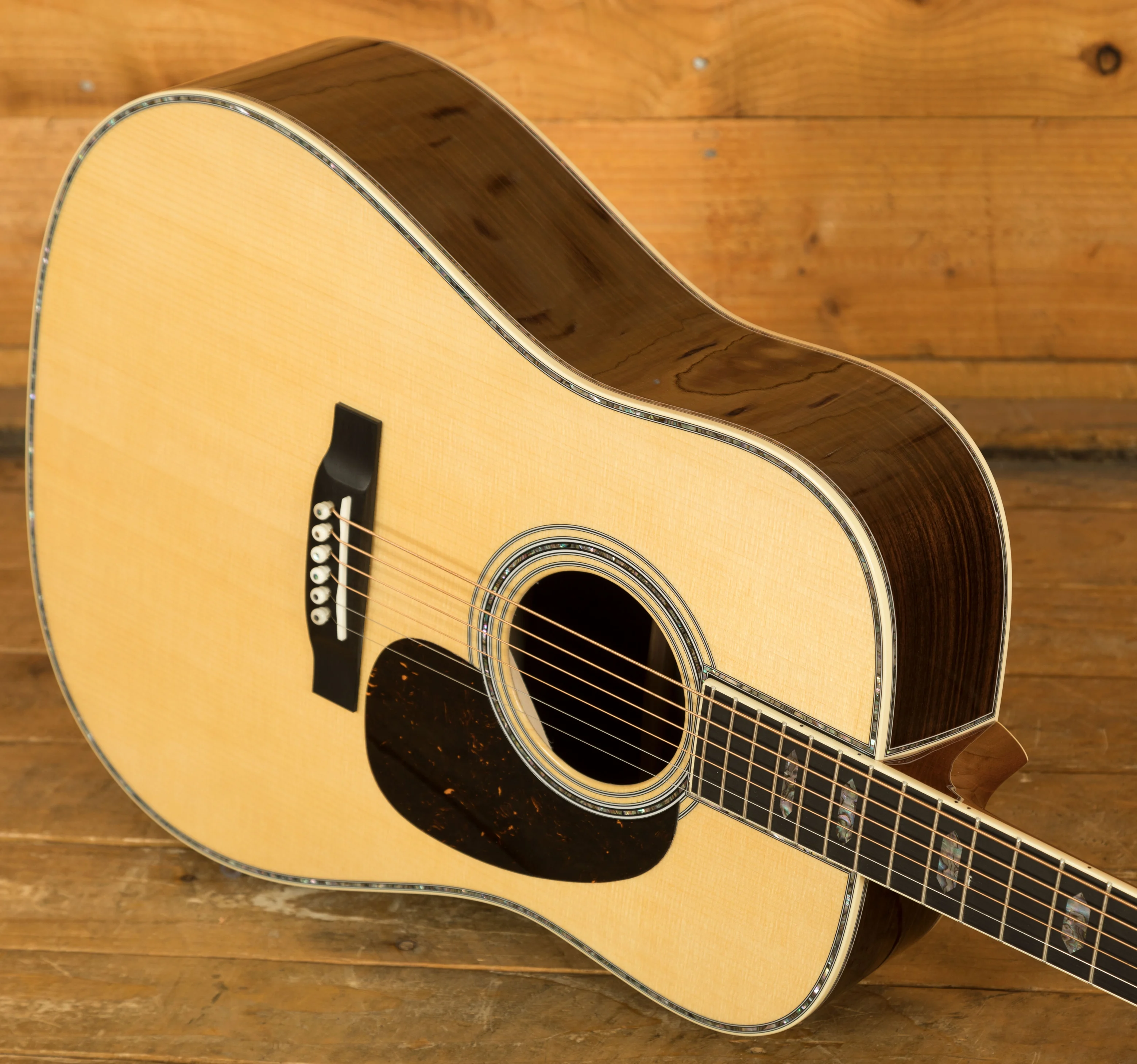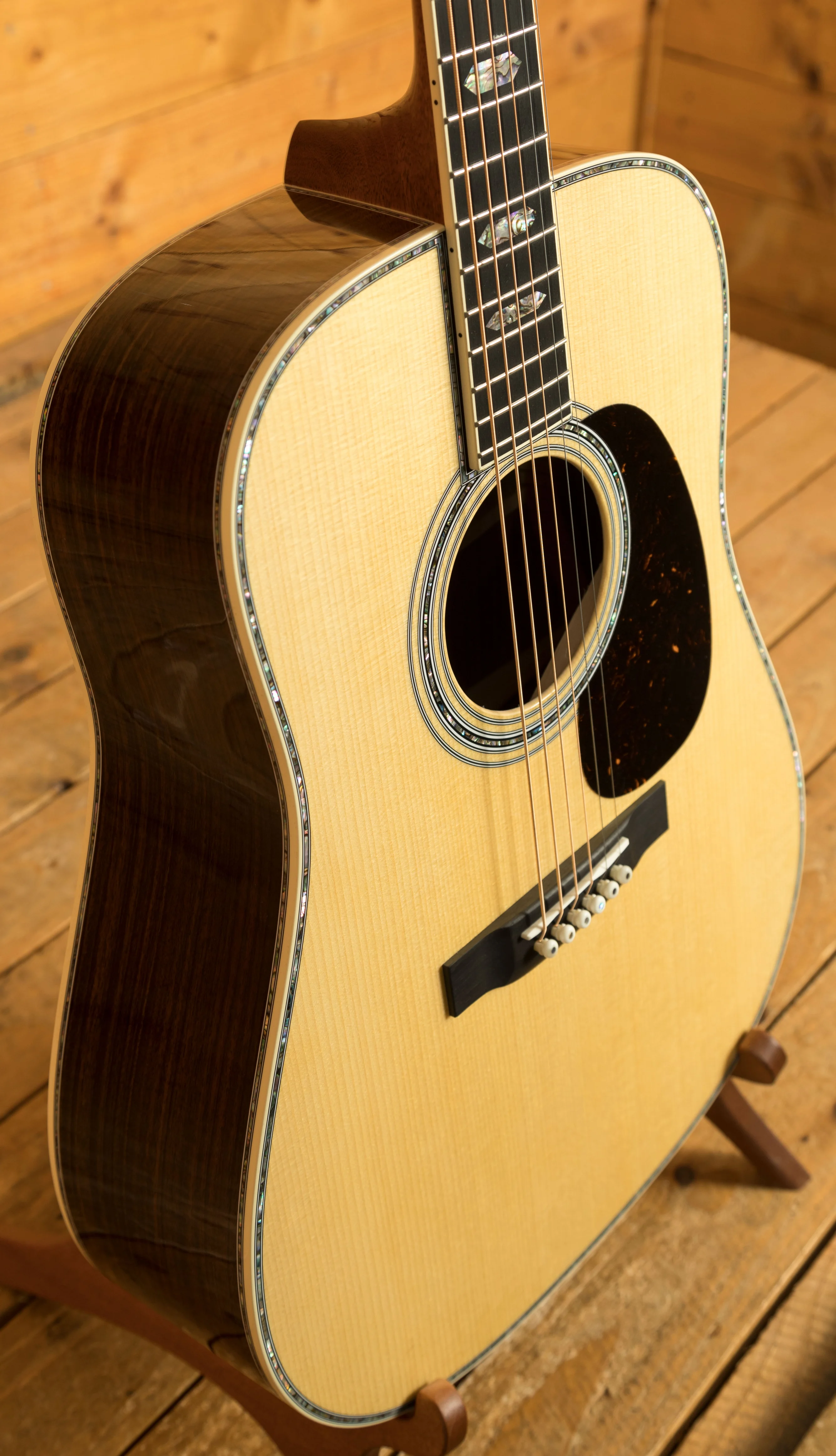 The Dreadnought body size of the Martin D-45 is renowned for producing a bold, balanced sound with powerful bass, clear trebles, and rich overtones. The solid spruce top, paired with solid East Indian rosewood back and sides, ensures the guitar delivers a resonant and dynamic sound. Whether you're strumming chords or playing intricate fingerpicking patterns, the D-45's tone remains full and expressive, making it suitable for a variety of playing styles. This combination of materials and design results in a guitar with remarkable projection and tonal clarity.