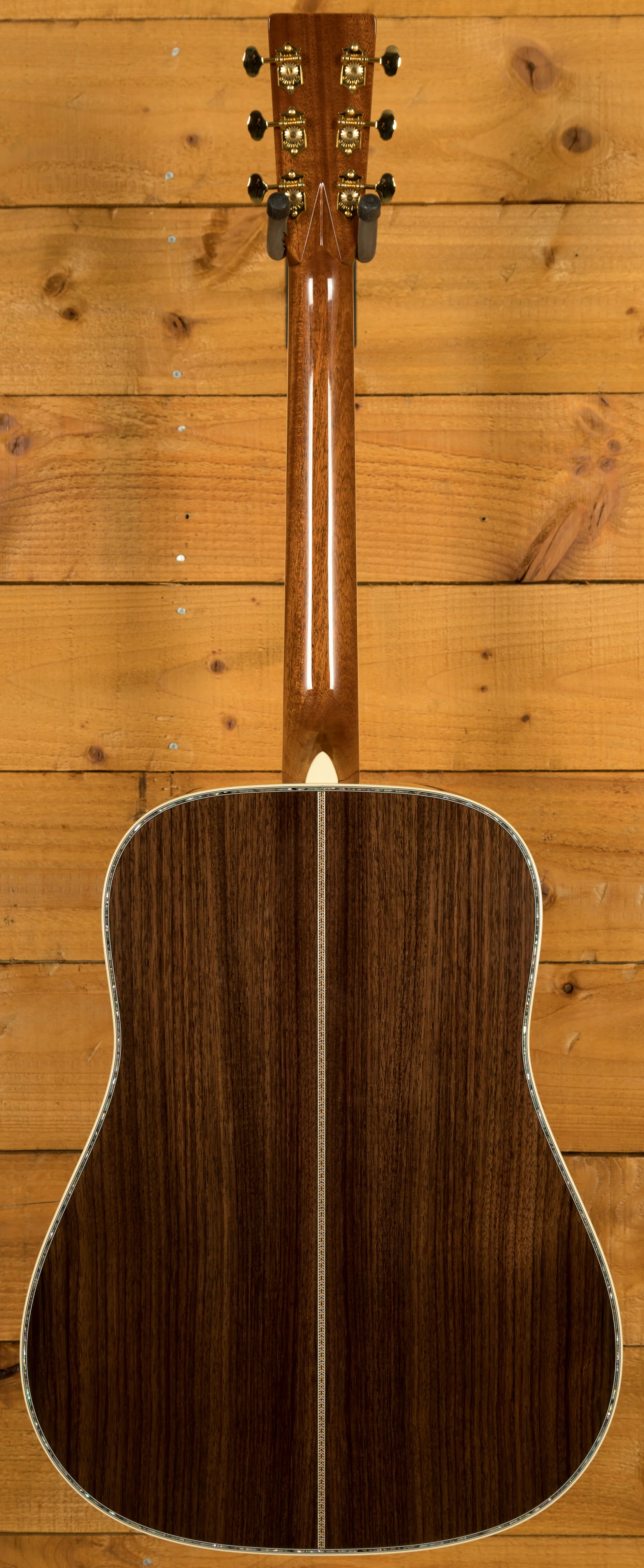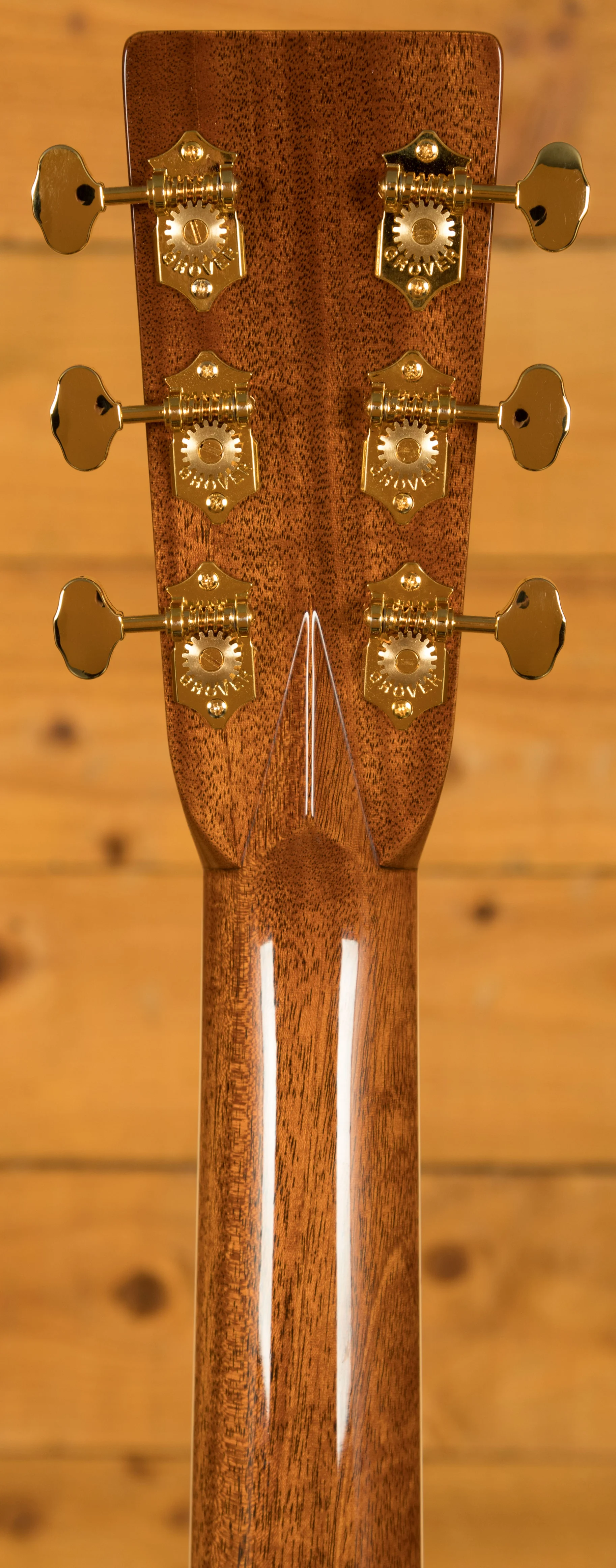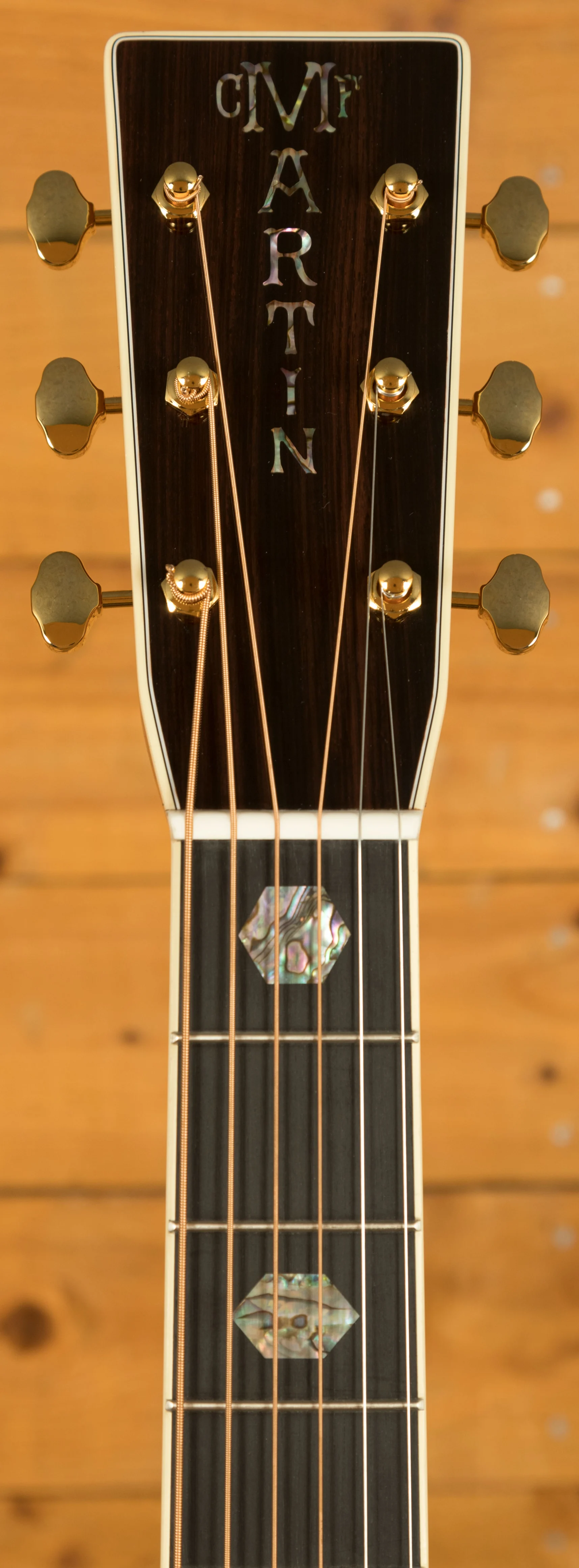 The neck of the Martin D-45 is crafted from genuine mahogany, featuring a Golden Era (GE) Modified Low Oval profile with a high-performance taper. This provides a comfortable playing experience, especially for those who prefer a more traditional neck shape. The 25.4" scale length ensures smooth string action and intonation across the entire fretboard. Additionally, the ebony fingerboard with hexagon inlays and the ebony bridge with bone pins contribute to both the playability and aesthetic appeal of the instrument. The antique white binding and gold open gear tuners further enhance its luxurious appearance.