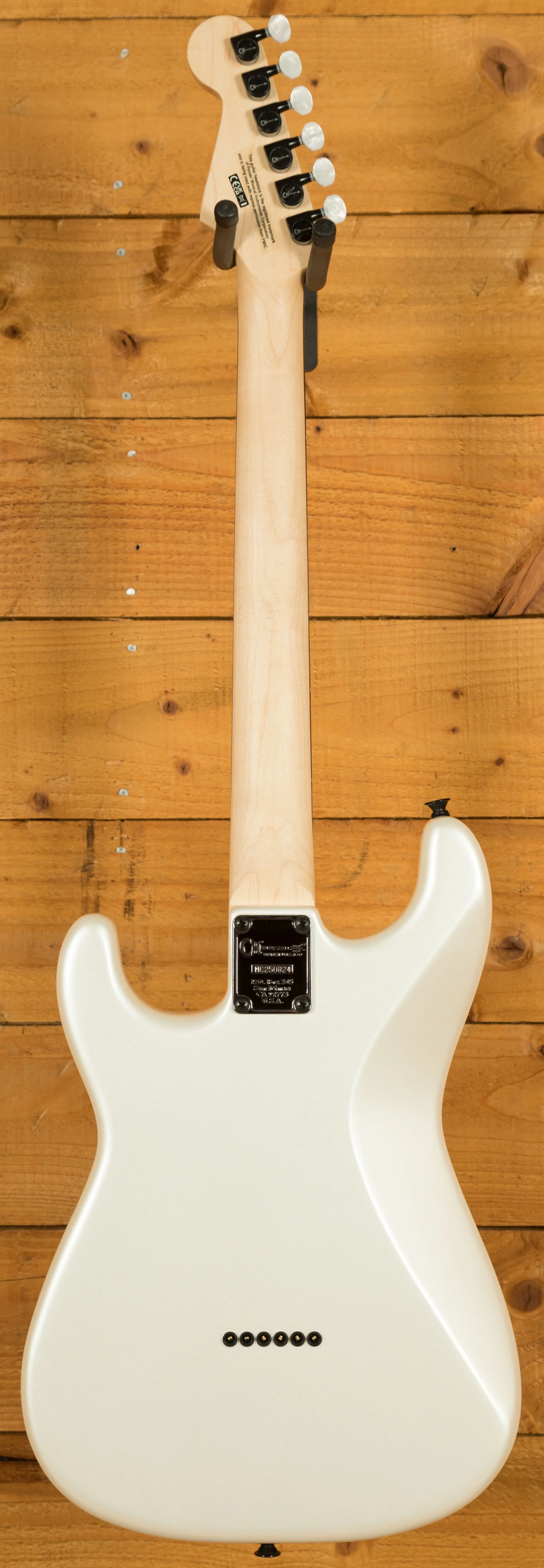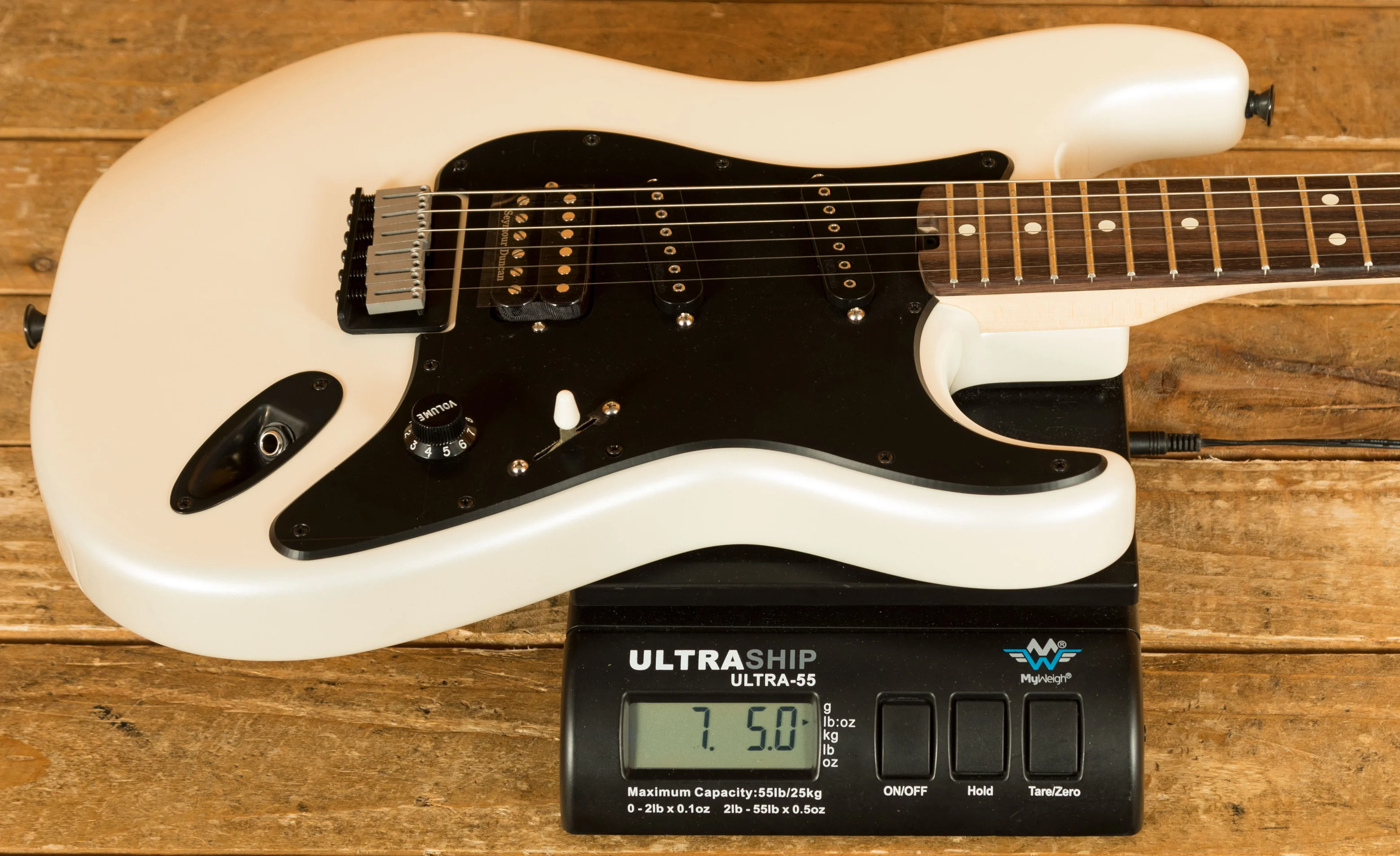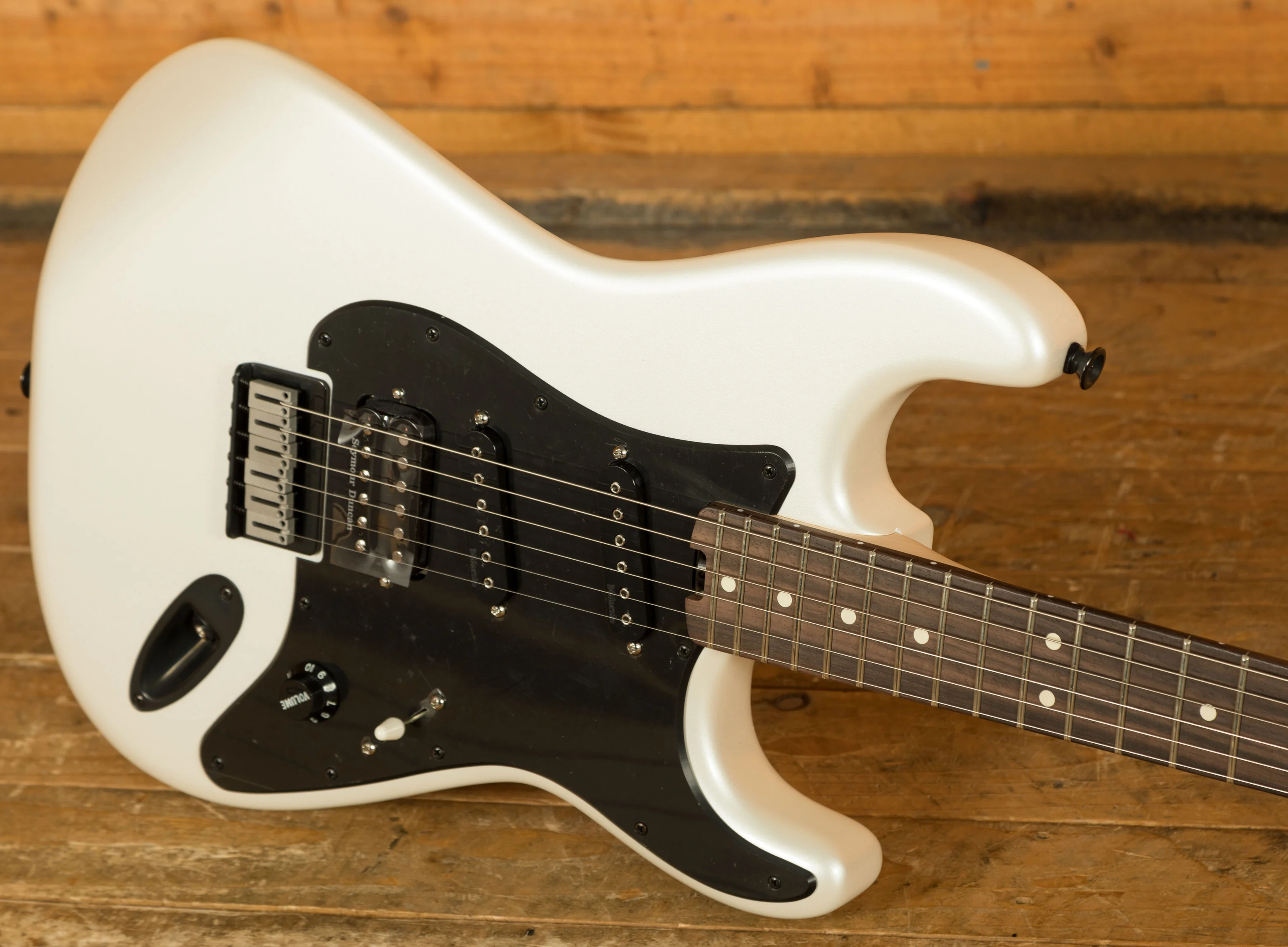 - Pearl White finish with black pickguard and hardware, providing a striking aesthetic.