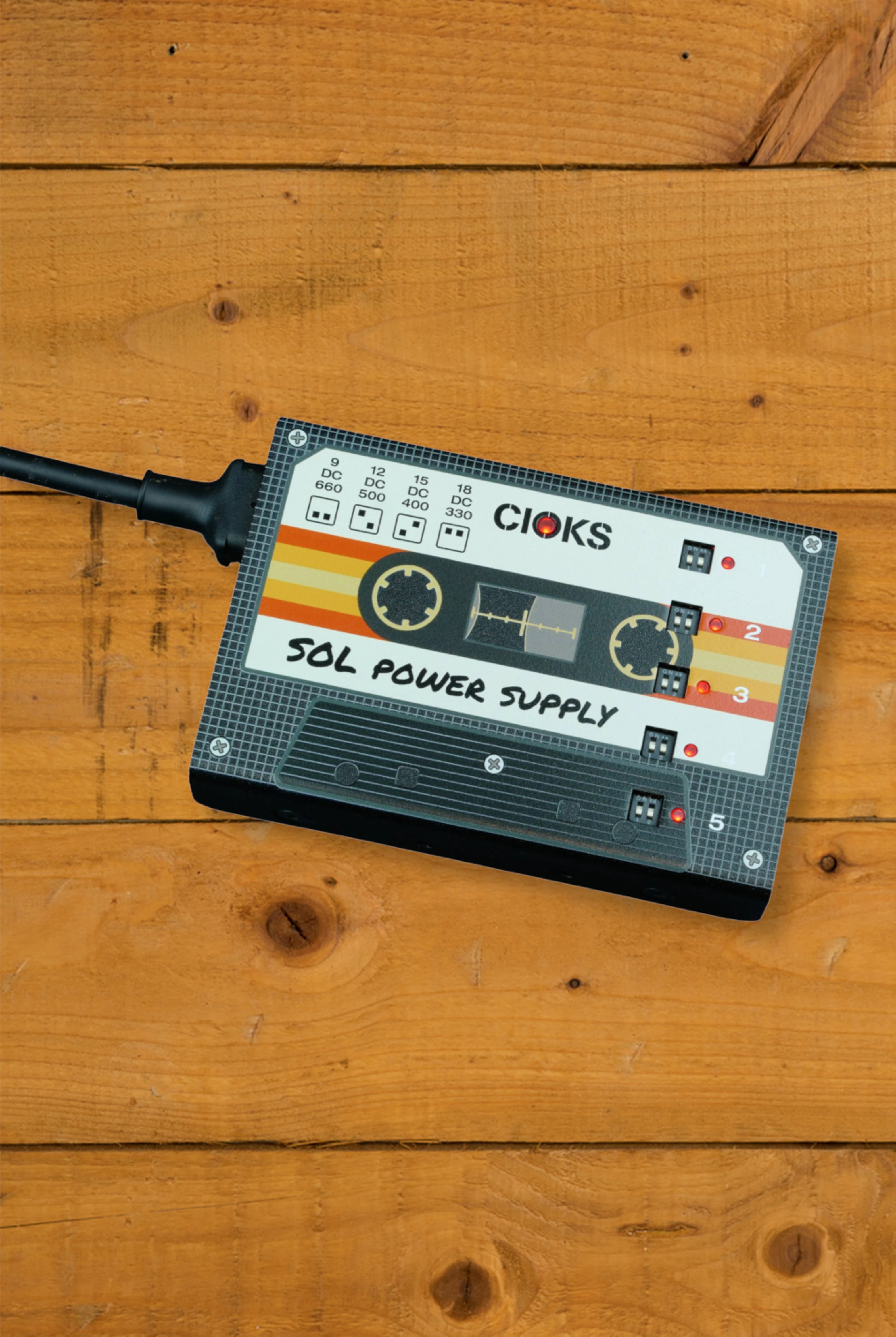 The CIOKS SOL Cassette is a limited edition version of the SOL power supply, dressed in vibrant 80s cassette-tape graphics that bring instant personality to any pedalboard. Designed for small to medium-sized rigs, SOL Cassette delivers exceptional power, ultra-low-noise performance and the same selectable-voltage flexibility found in the flagship DC7, all in an incredibly compact 2.5 cm profile.