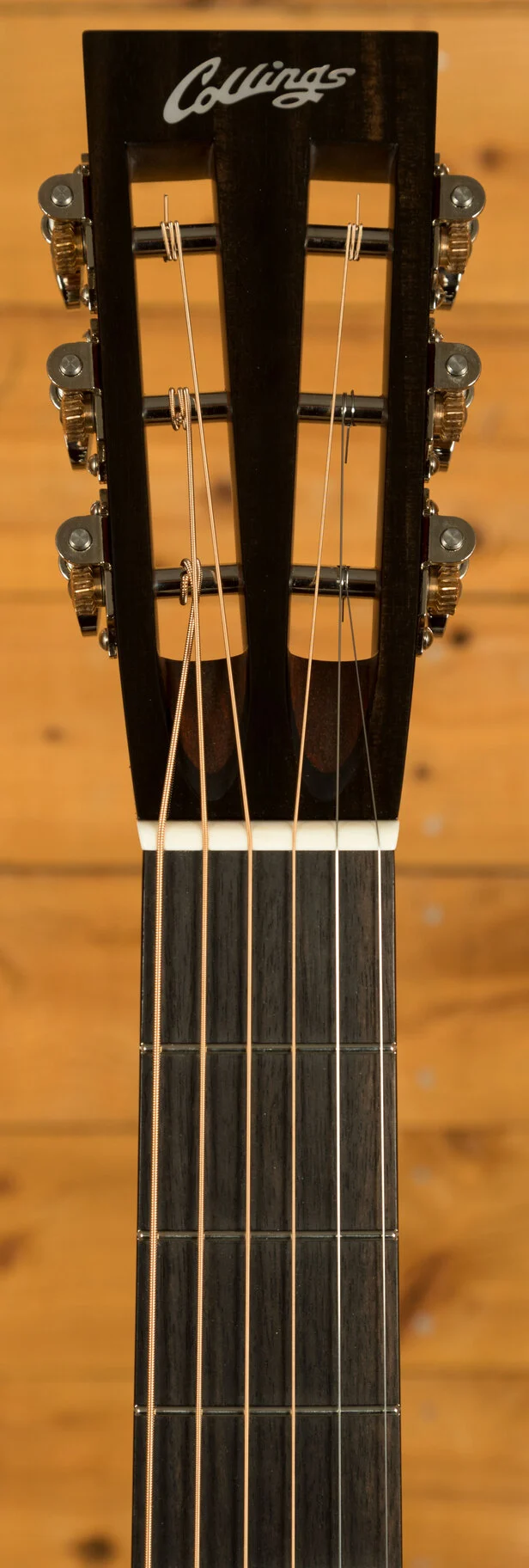 The Honduran mahogany neck features a comfortable modified V profile with a smooth, high-gloss polyester resin finish, offering excellent playability. The ebony fingerboard, with its 14"–26" compound radius and medium nickel-silver frets, ensures effortless fretting across the entire scale. Elegant details like the mother-of-pearl inlays and the ebony peghead veneer with the Collings logo highlight the guitar’s premium craftsmanship.