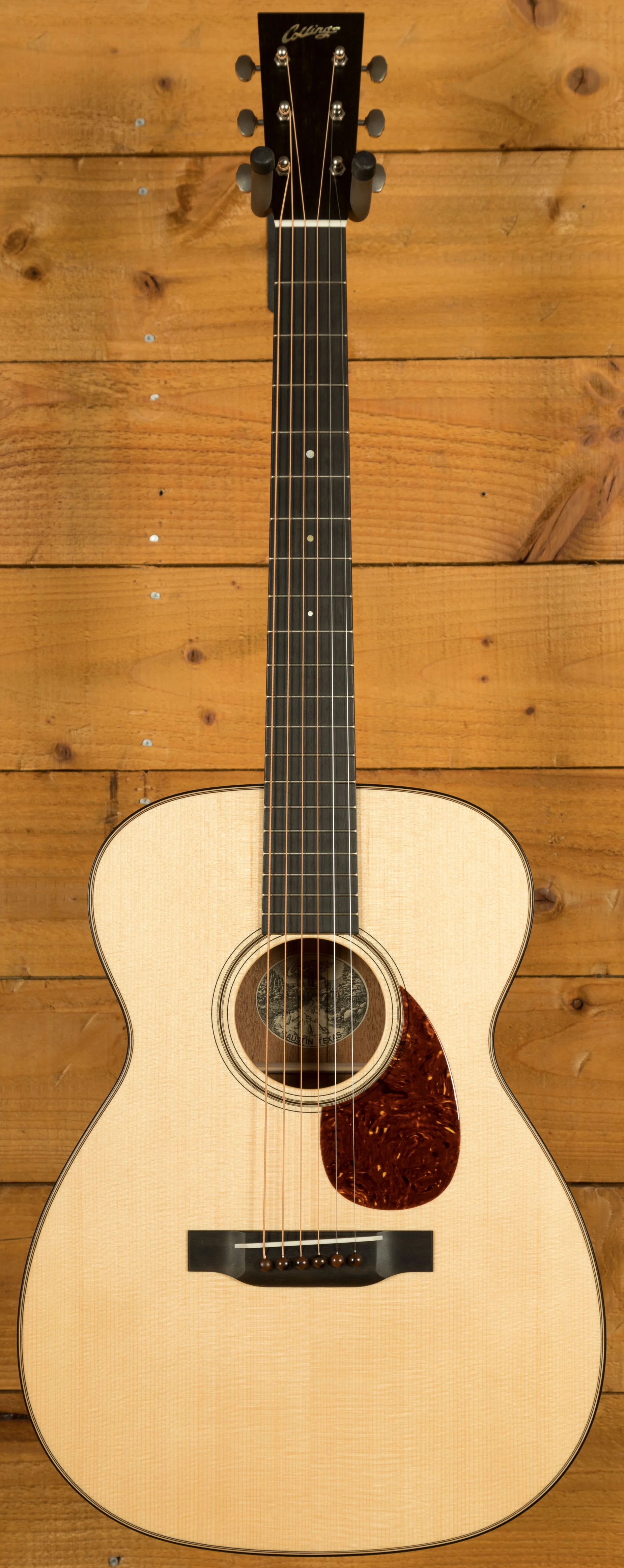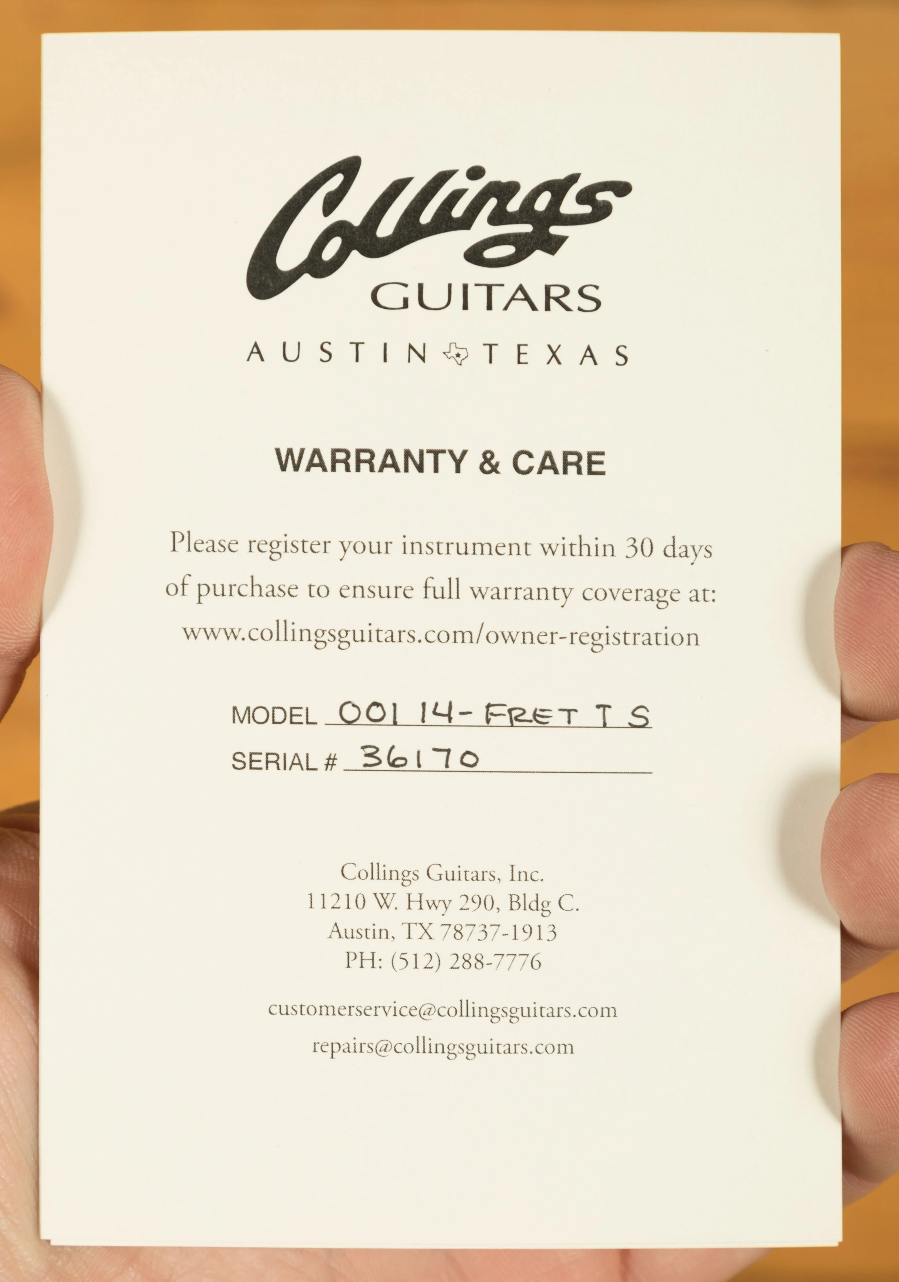 Discover the vintage charm of this Collings 001 T 14-Fret, handcrafted at Collings' Austin, Texas workshop. Part of the Traditional Series, this small-bodied guitar features a 14-fret neck joint and a 24 7/8" scale length for a balanced, precise tone with a quick attack and strong projection - distinct from the brighter standard Collings voice. The solid Sitka spruce top, paired with Honduran mahogany back and sides, is finished in a thin nitrocellulose lacquer, enhancing its resonant, "broken-in" feel, while the slotted headstock and tortoise binding add a touch of pre-war elegance. In lovely condition, this guitar shows minimal signs of wear, preserving its pristine appearance and rich tonal character.