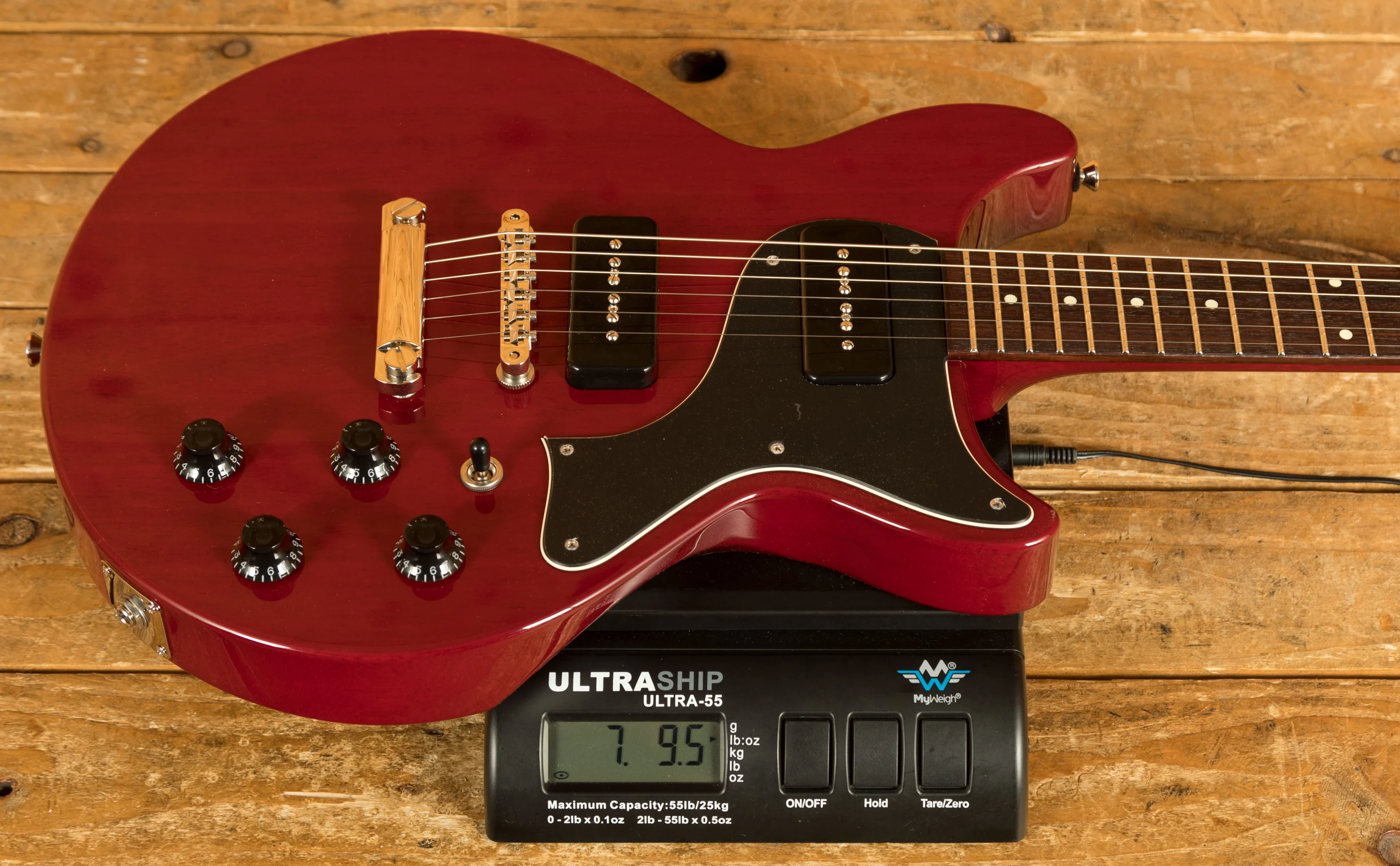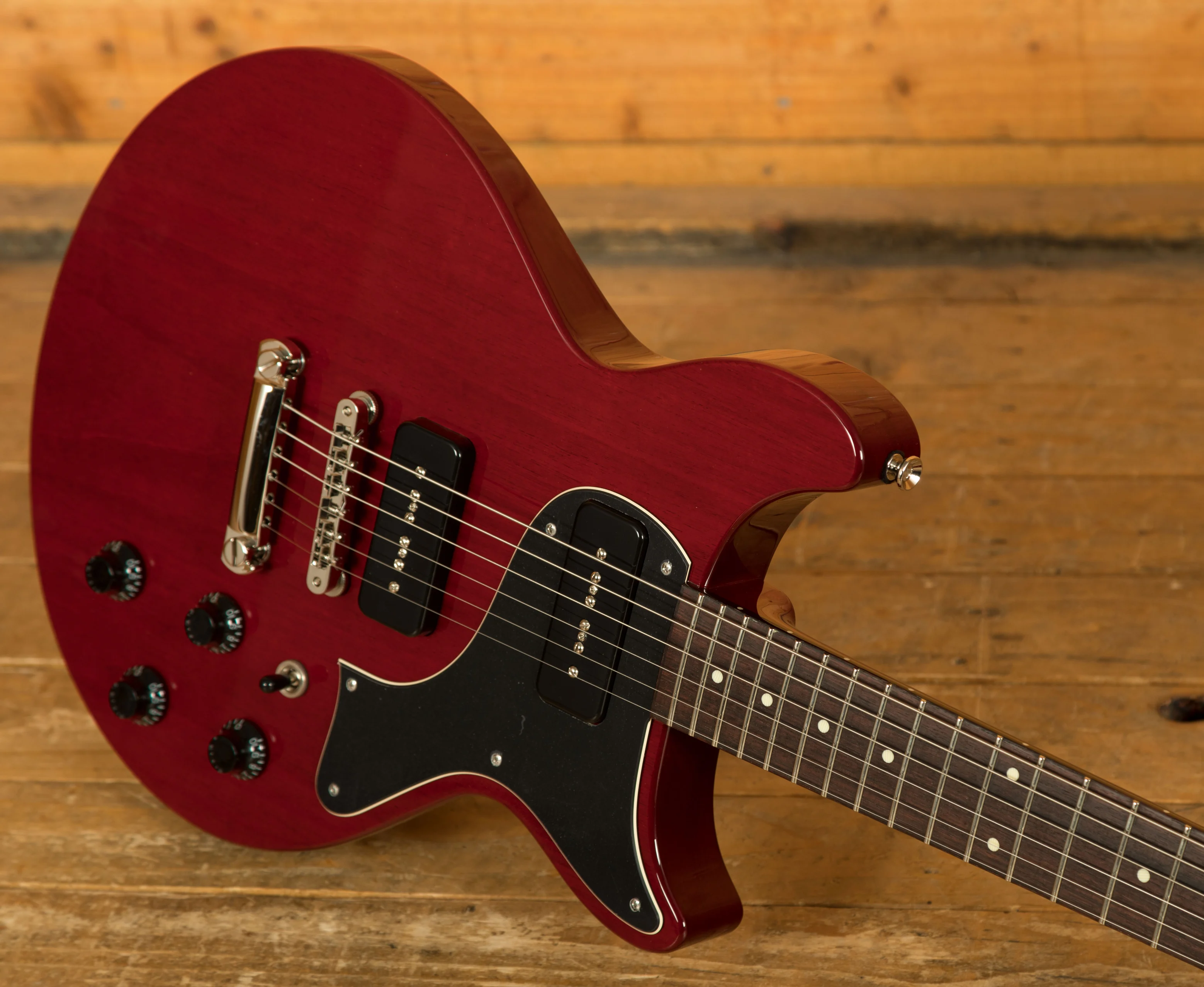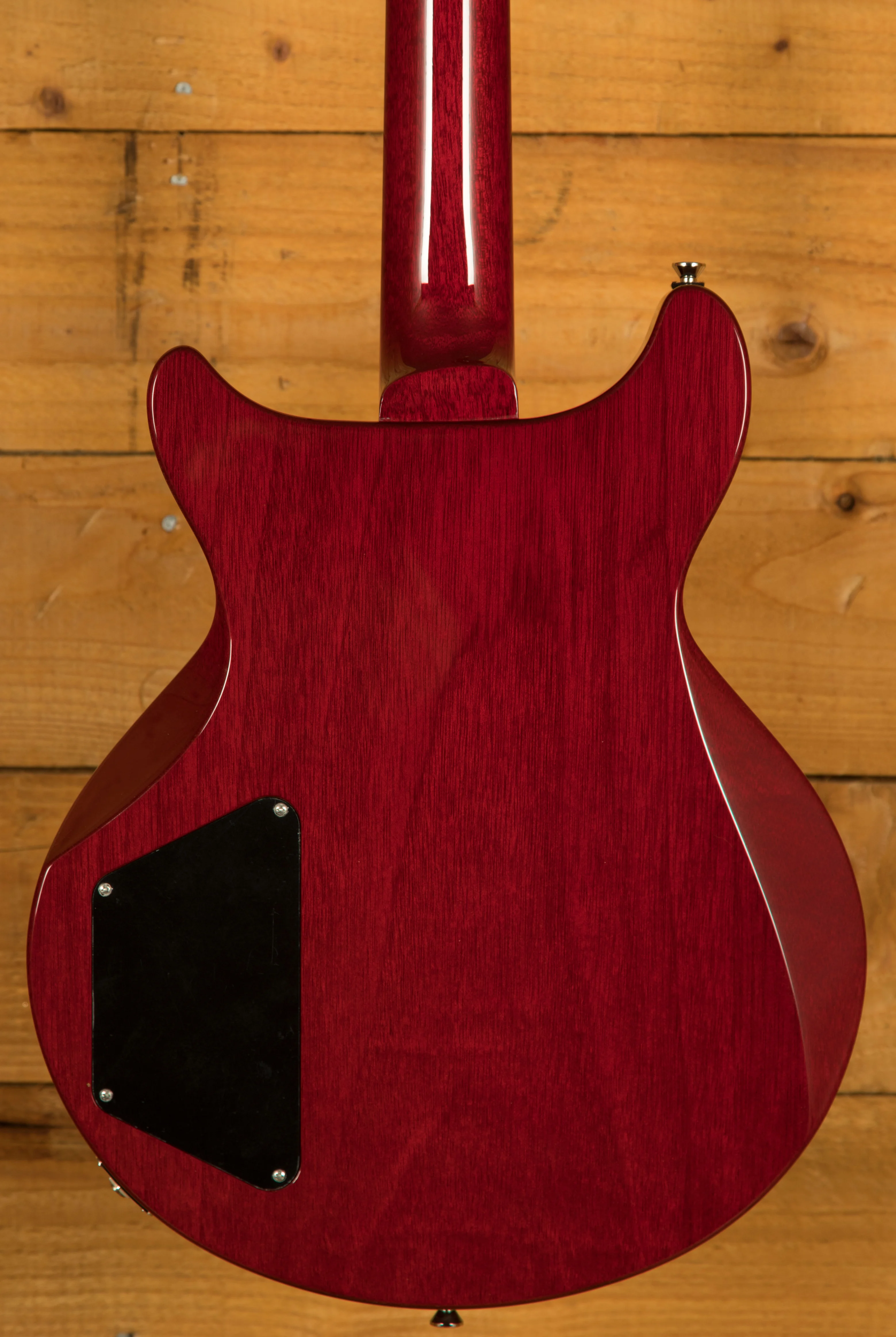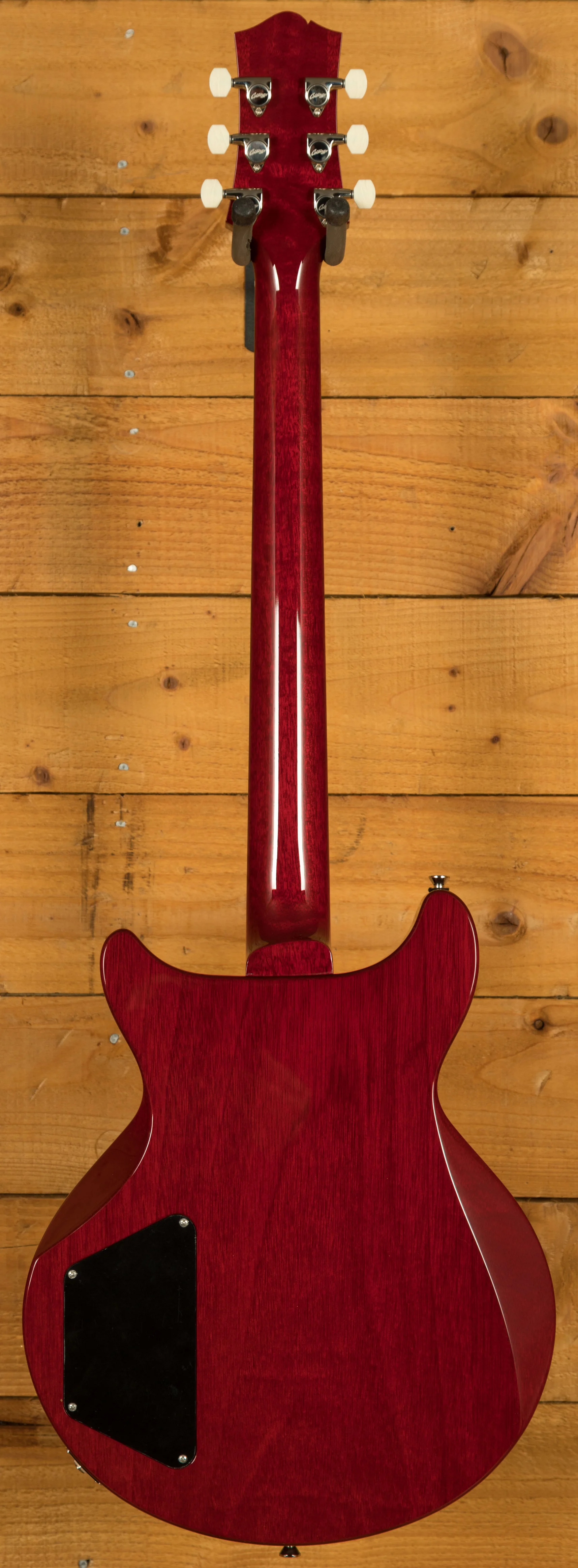With a Honduran Mahogany solid body double cutaway design, finished in the incredible Crimson, this is a serious guitar with a seriously cool look. Equipped with a Kluson ABR-1 bridge and tailpiece, this guitar offers great sustain and resonance with improved intonation whilst keeping the vintage aesthetic.