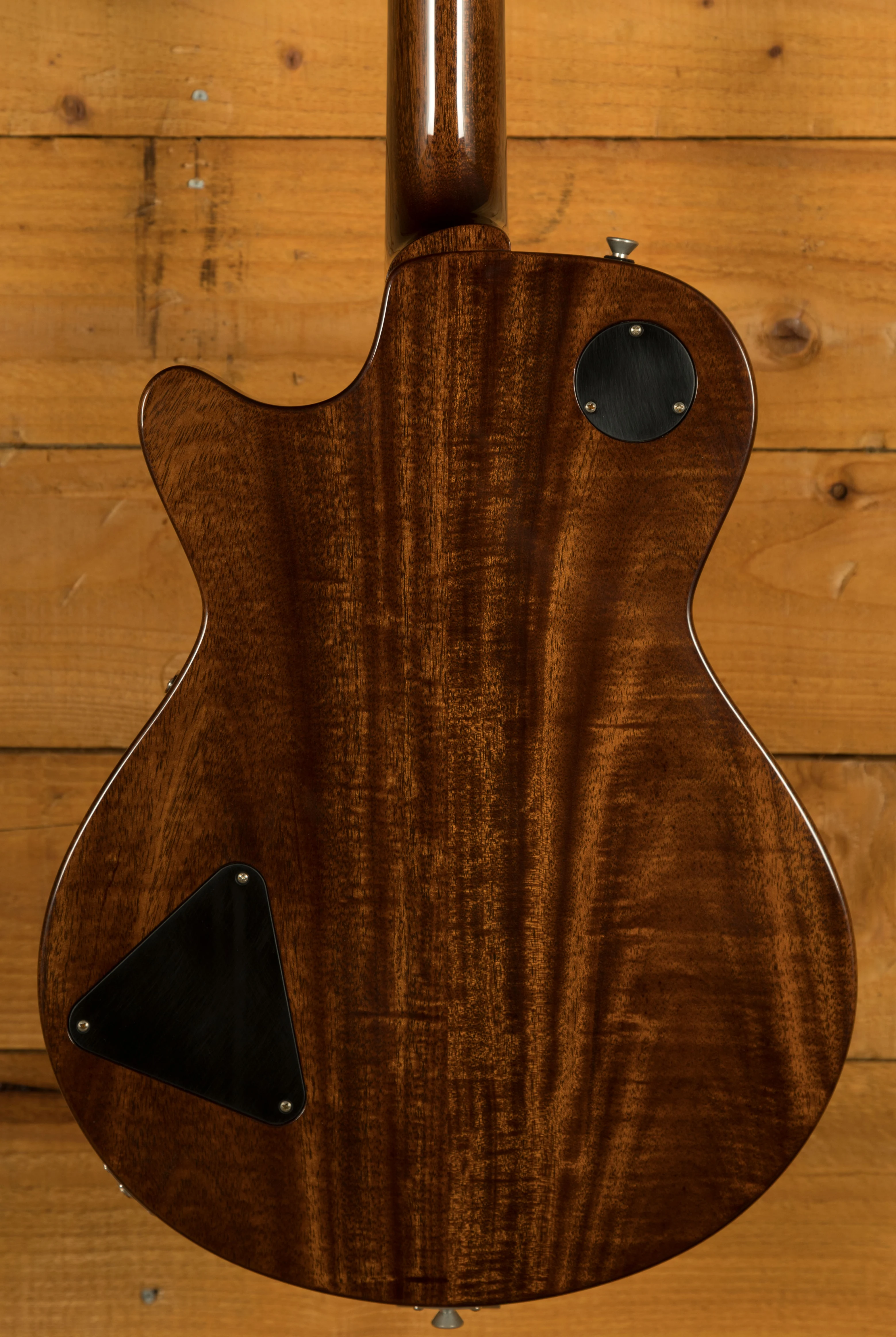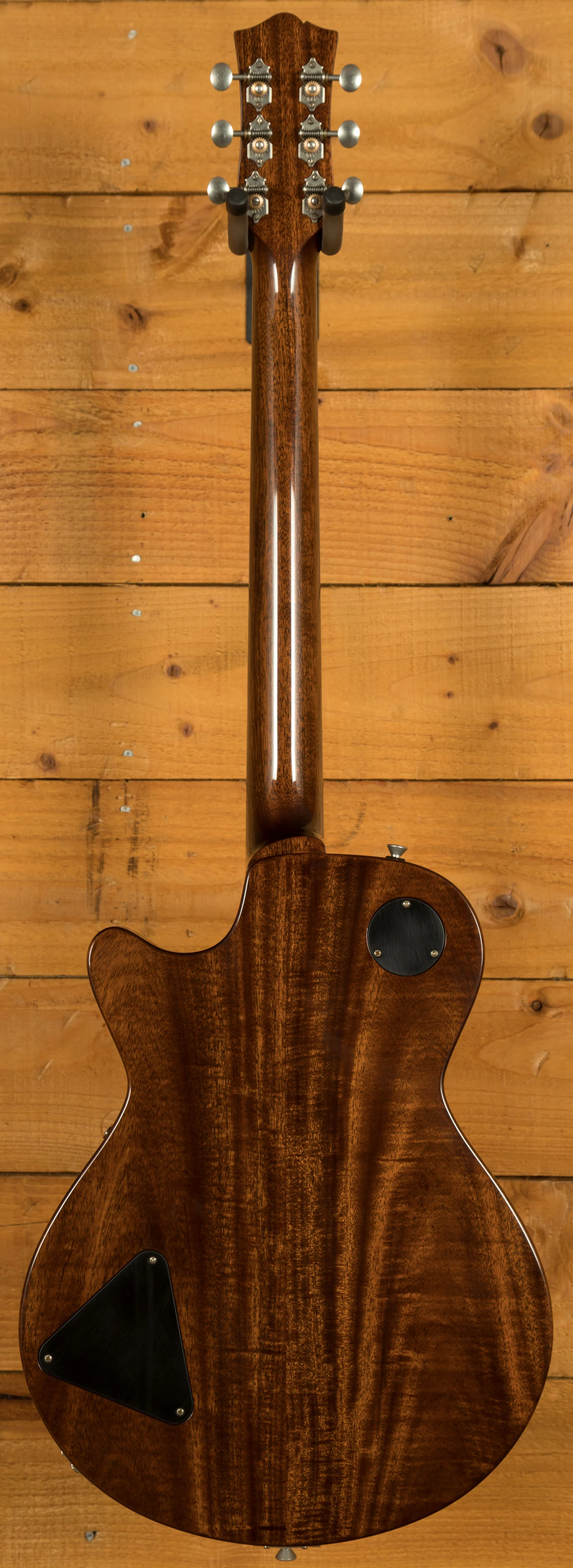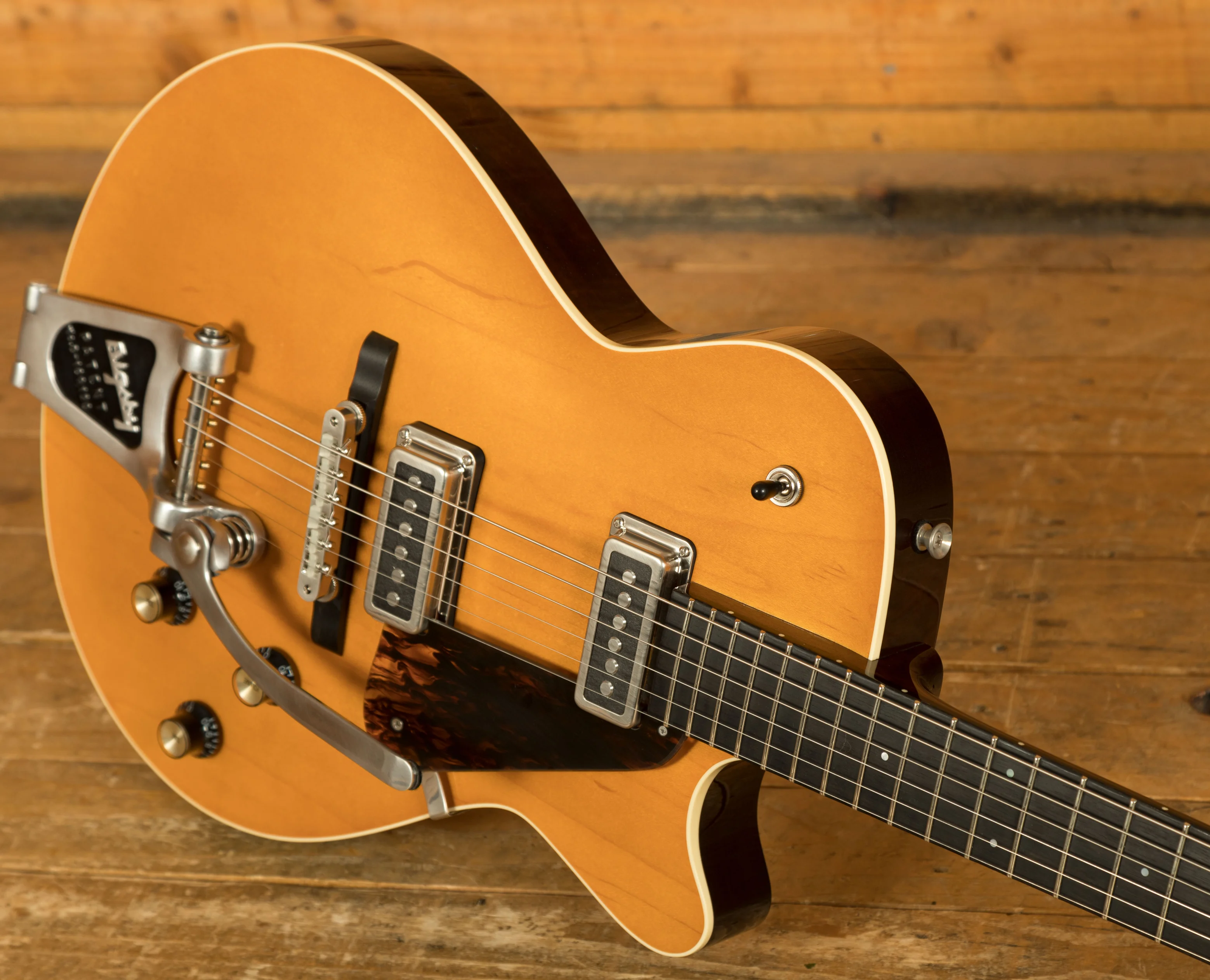 With a Fully hollow trestle block body design built with Solid Mahogany and a Maple Laminate top, this allows for the resonance of a hollowbody but keeping the feedback resistance associated with solid body guitars. It is well weighted and incredibly comfortable against the body. Finished in the awesome Antiqued Blonde High gloss nitrocellulose lacquer.