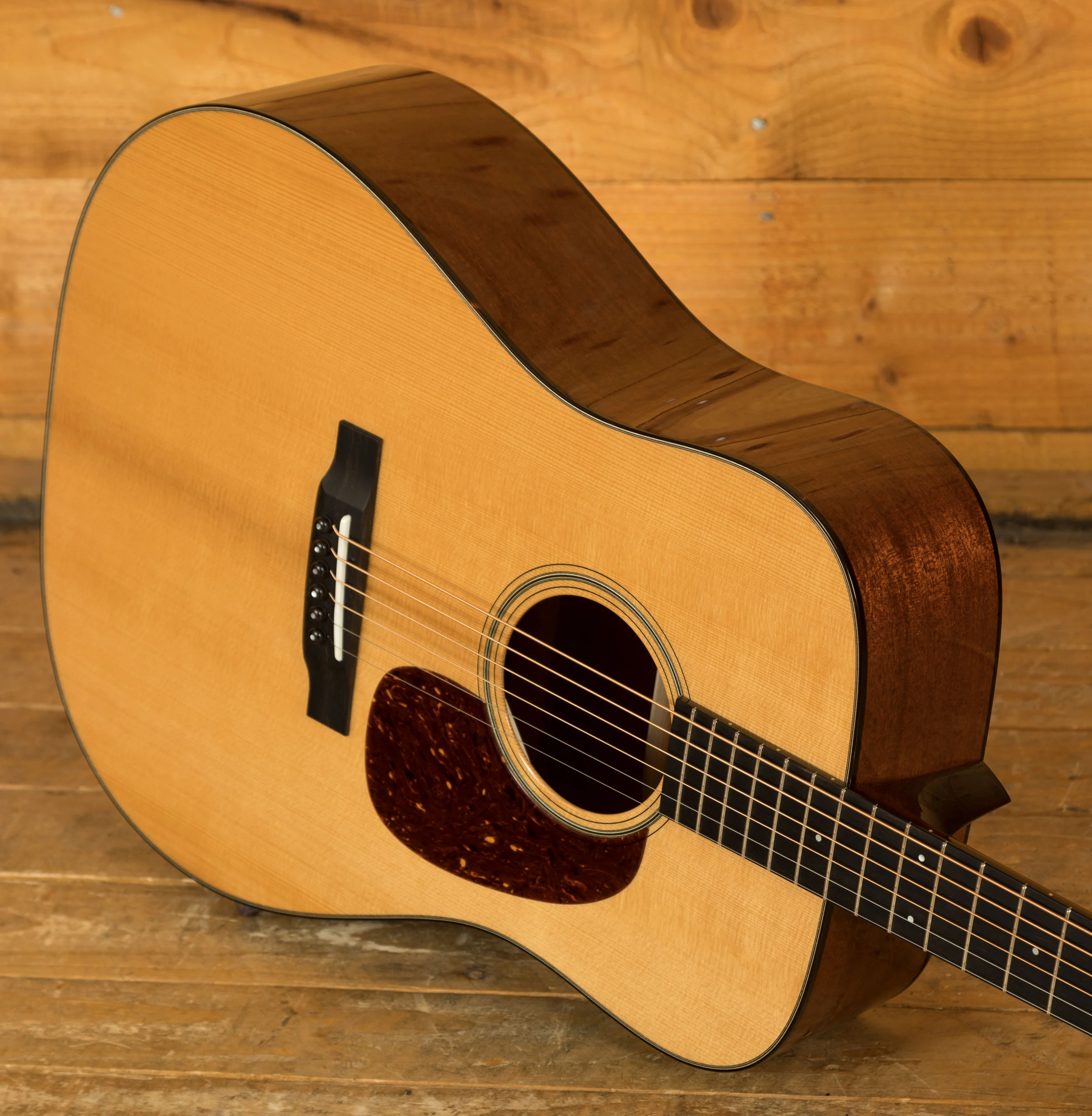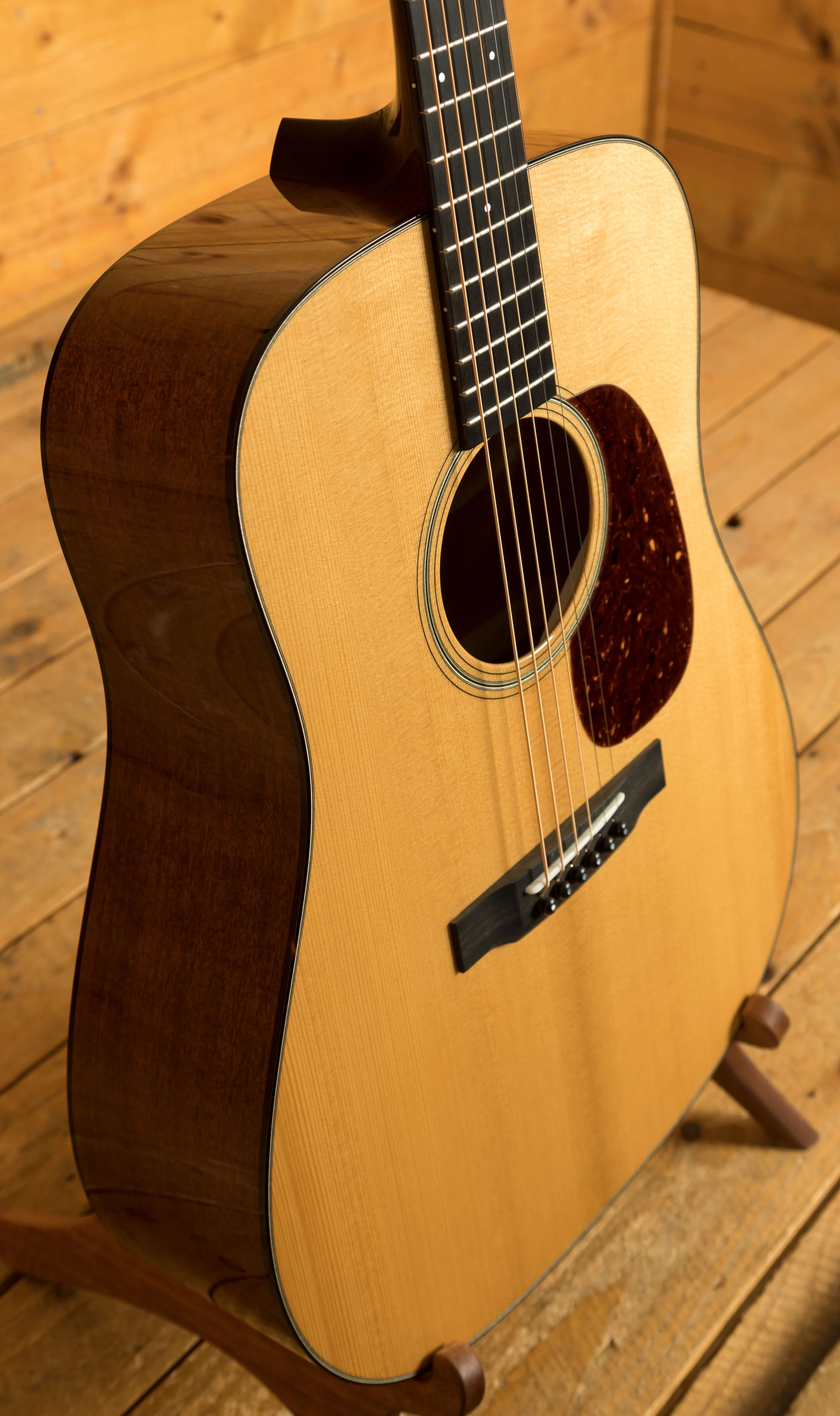The Collings D1 features a powerful combination of torrefied Adirondack spruce top and Honduran mahogany back and sides, delivering a guitar with crisp articulation, warm tones, and a beautiful balance. The Adirondack spruce scalloped X-brace further emphasizes these qualities. The Modified V Honduran mahogany neck, along with a compound radius Ebony fingerboard, ensures excellent playability and a smooth fret feel.