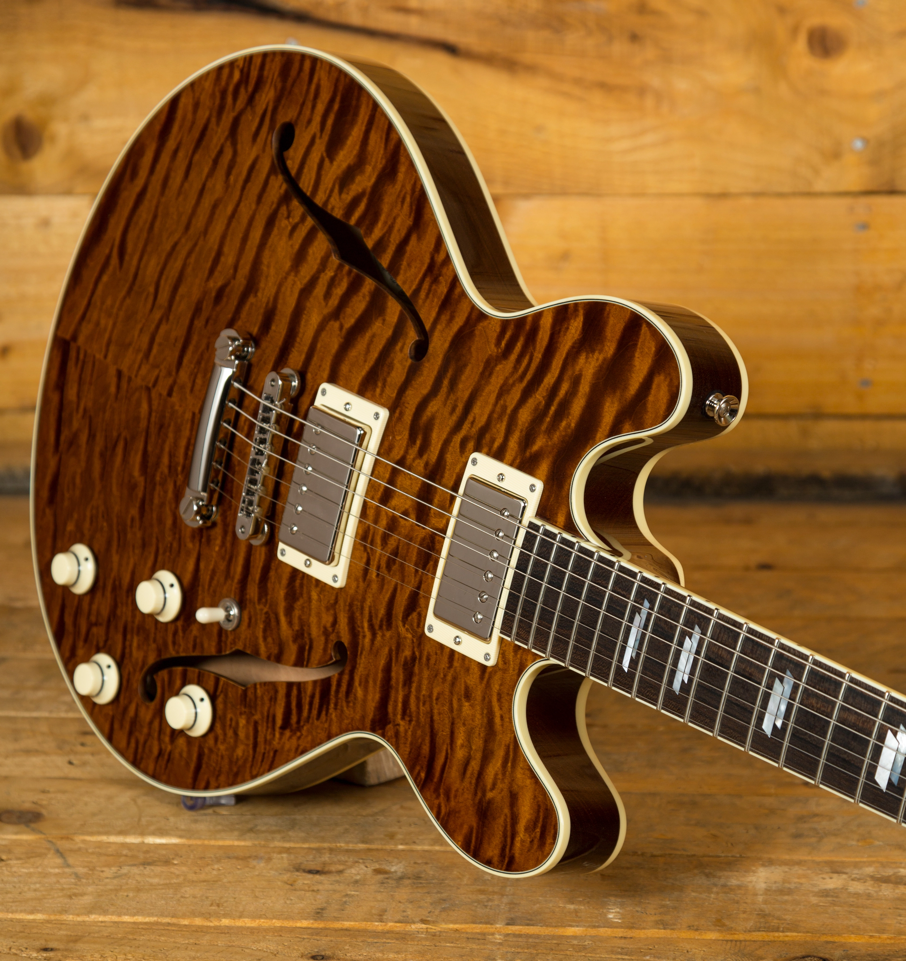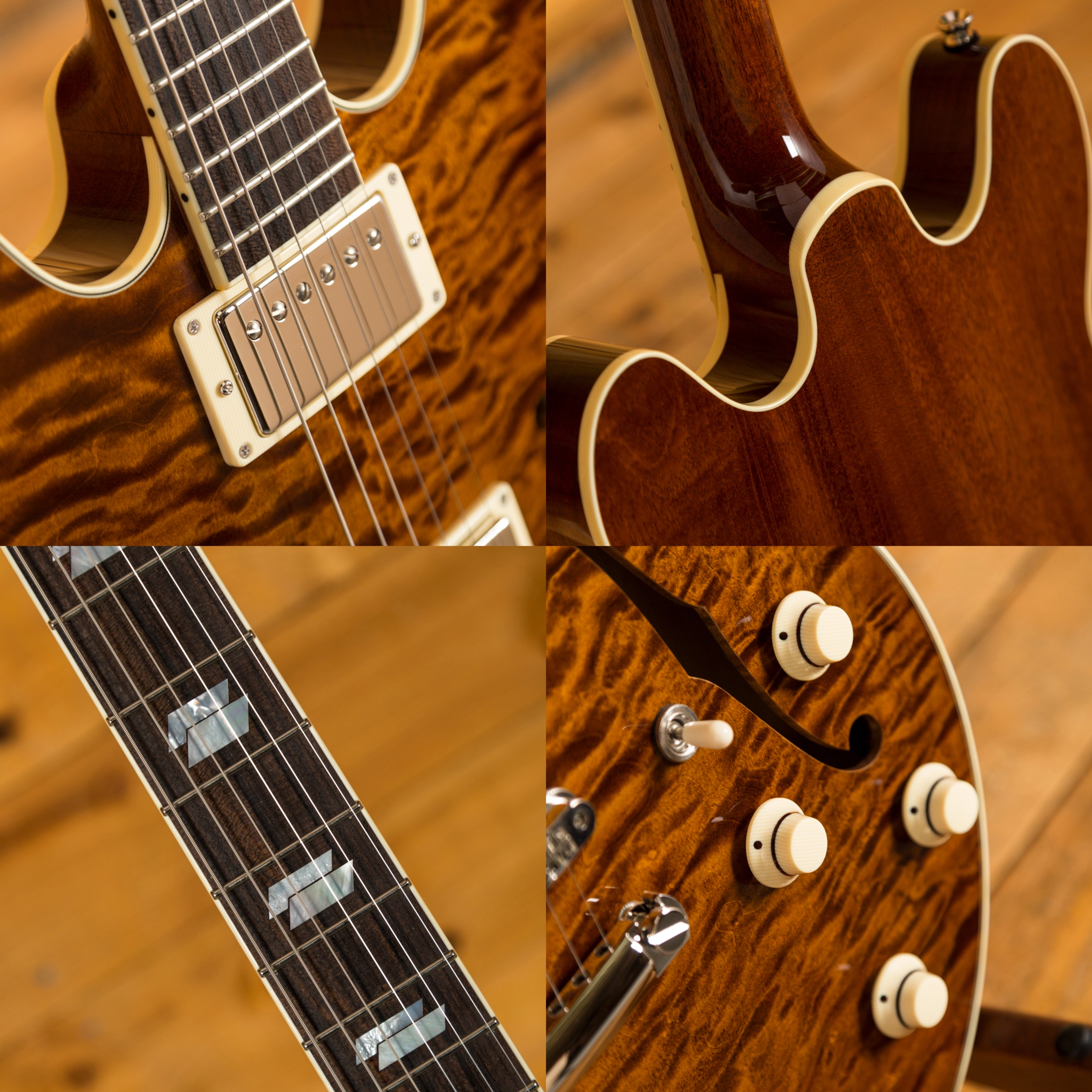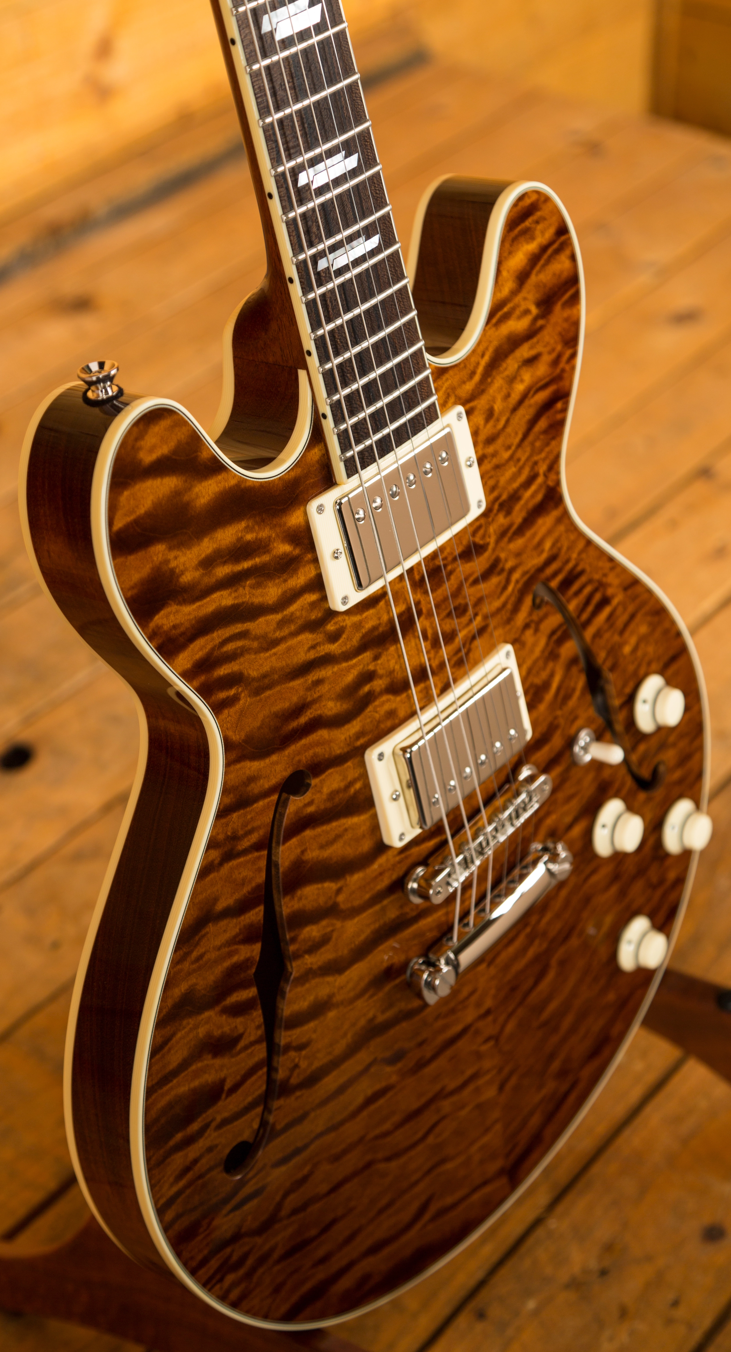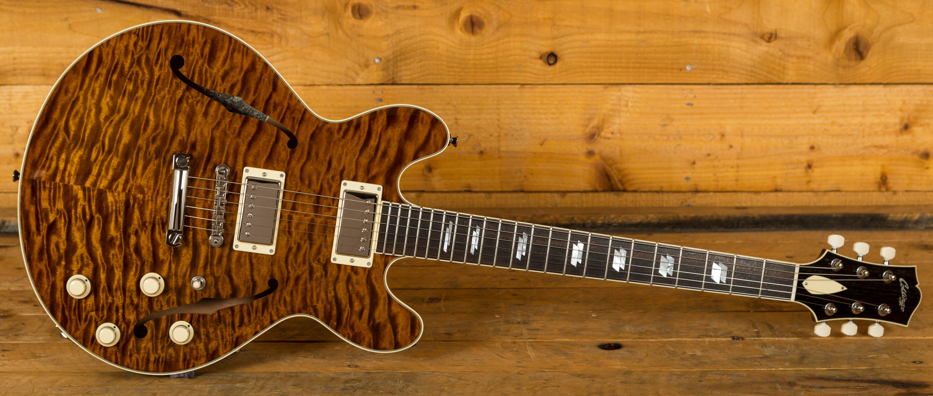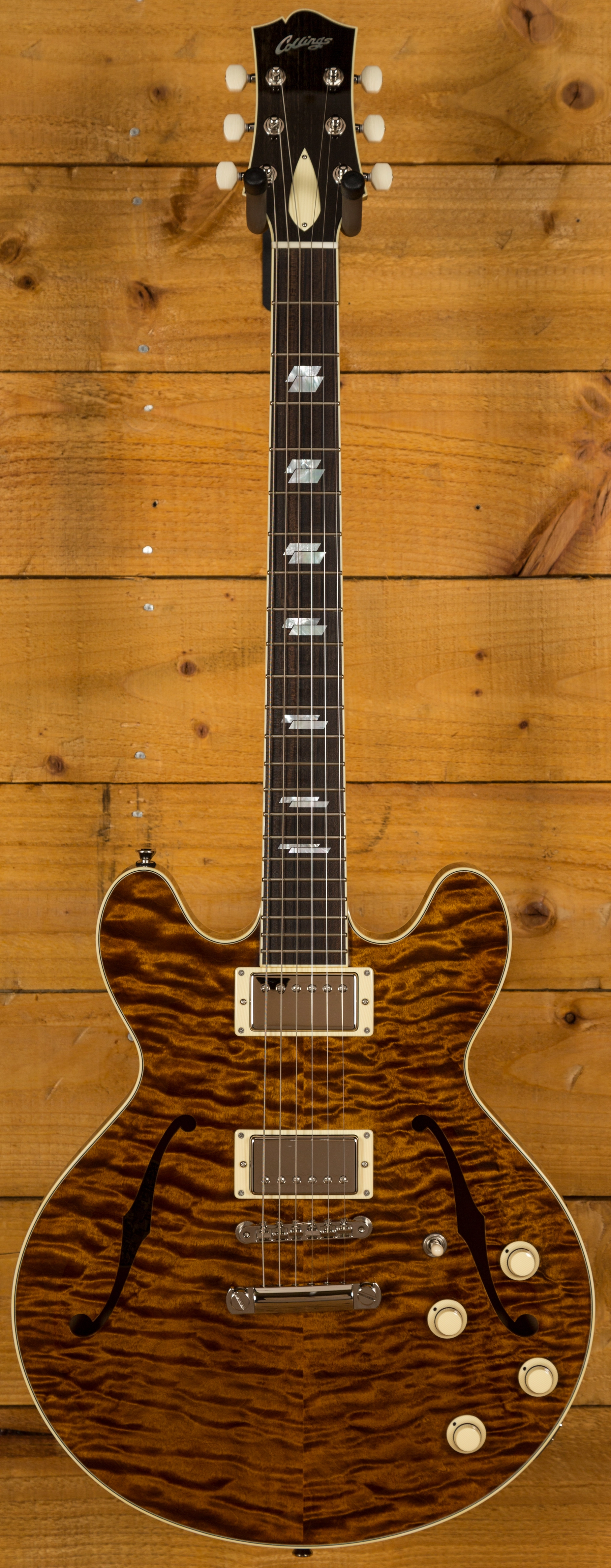 With a Honduran Mahogany body with a premium Flame Maple top, finished in the Collings Caramel finish, this is a serious guitar with a seriously cool look. Each Deluxe model is constructed using premium hand selected tone woods that are rich in tone, precise in response and deliver that signature Collings vibe. Equipped with a Kluson ABR-1 bridge and stop tailpiece, this guitar offers incredible intonation and a beautifully smooth playing action.