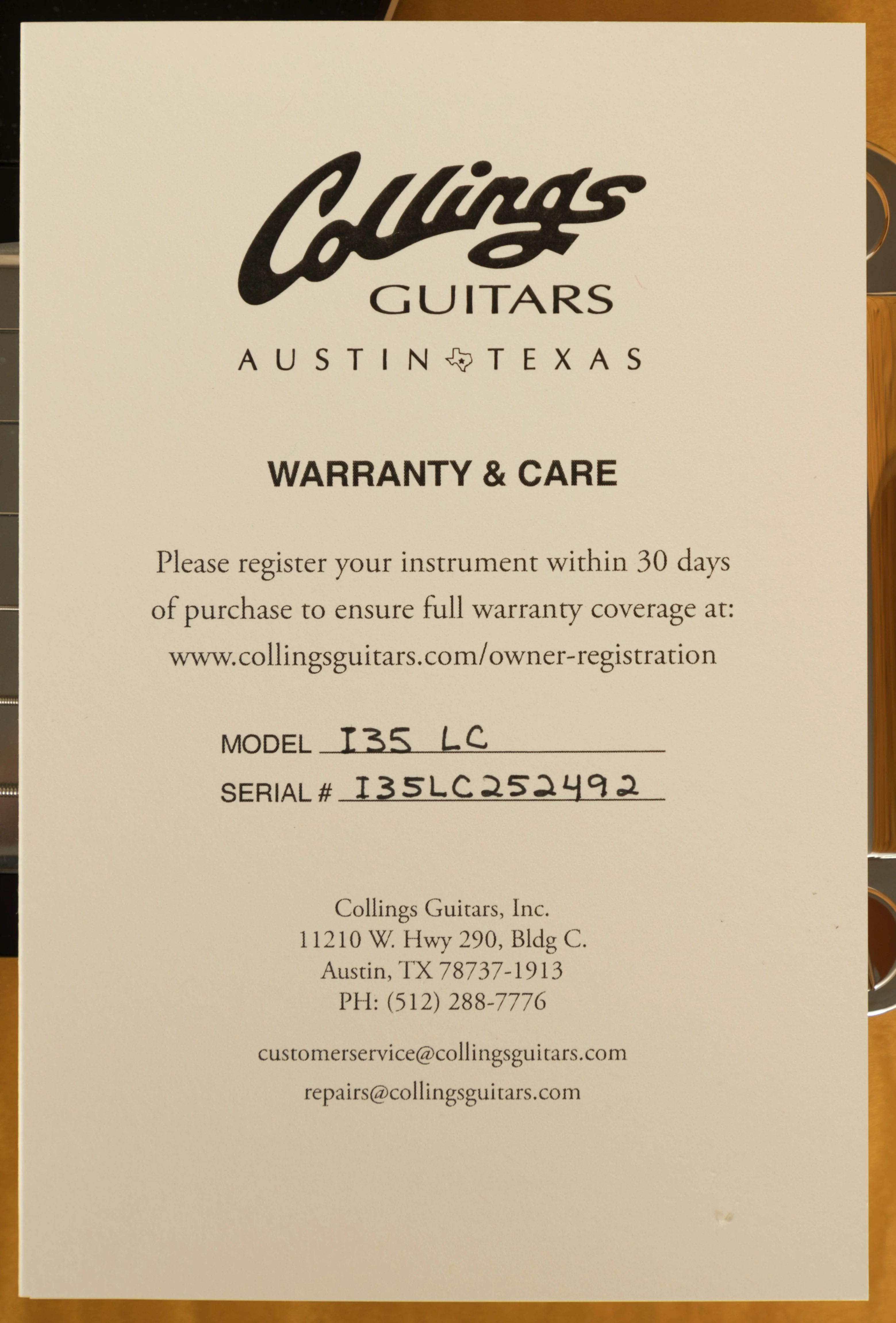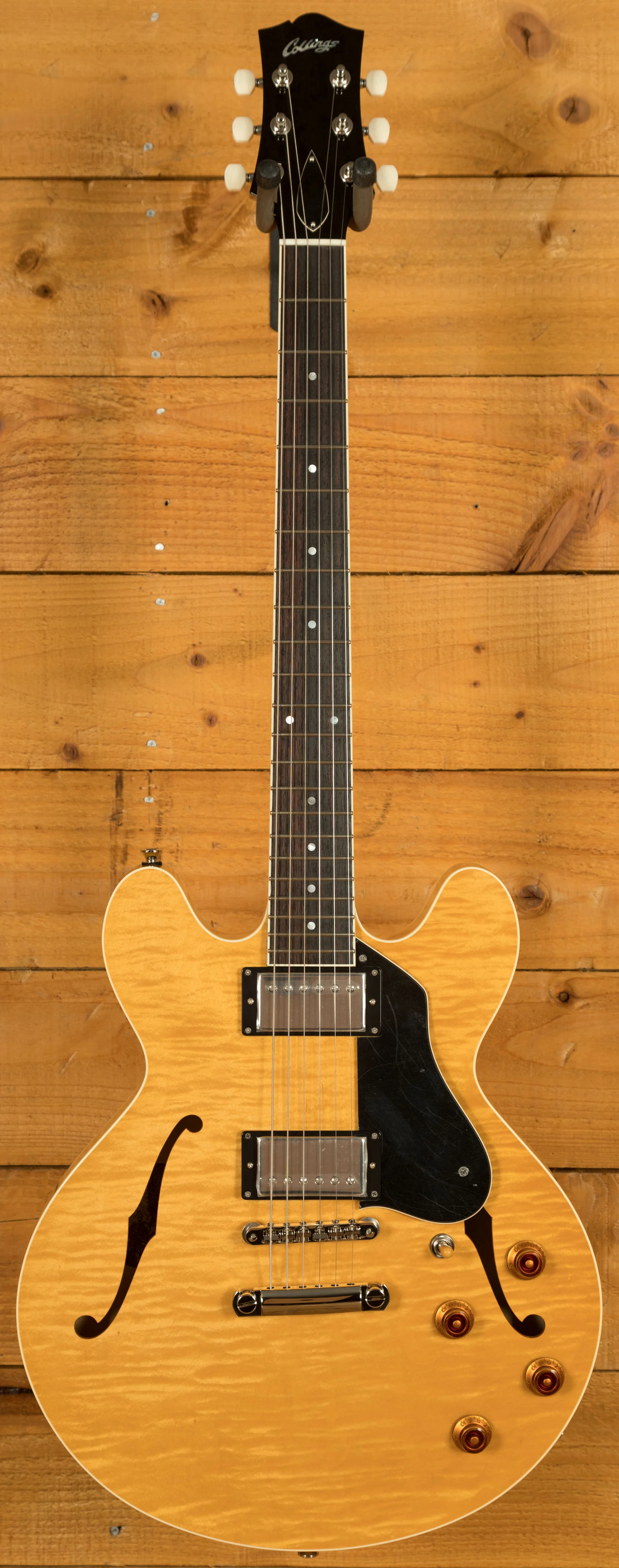 With a Laminate Maple body with a Maple centre block, finished in the Collings Blonde, this is a serious guitar with a seriously cool look. Each laminate model is constructed using a combination of different density woods that are rich in tone, precise in response and deliver that premier Collings vibe. Equipped with a Kluson ABR-1 bridge and stop tailpiece, this guitar offers incredible intonation and a beautifully smooth playing action.
