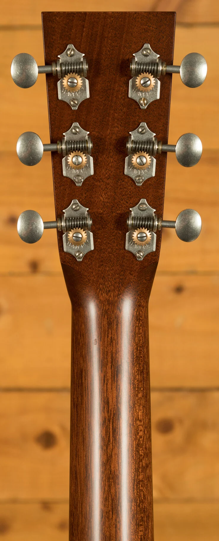 A Honduran Mahogany neck boasts an Ebony fingerboard with a profile modelled after Lage's 1939 Martin 000-18. Featuring a 25.5" scale length. 14-26" Compound Radius, Medium Nickel frets, 1 11/16" width Bone Nut, and of course gold Mother of Pearl dot inlays. It is supremely comfortable underhand, it's an absolute joy to play, beautifully well balanced and incredibly high quality.