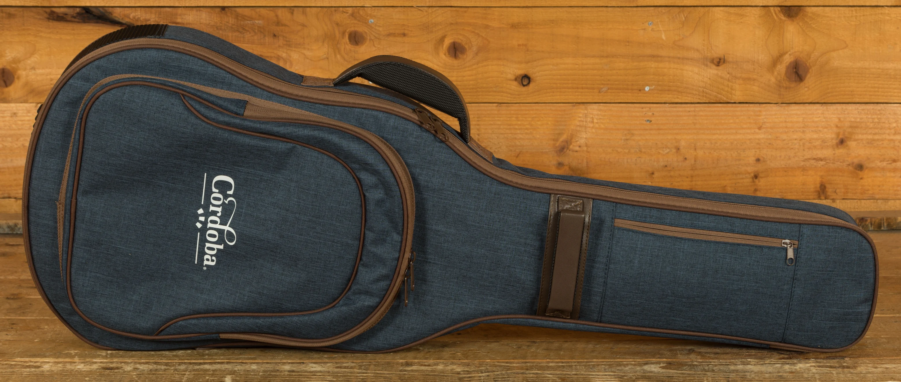 The Cordoba Stage Guitar includes an eye-catching and comfortable navy and brown, economically-made gigbag. Built from a durable shell of recycled post-consumer nylon, such as discarded fishing nets and mircoplastics. It will carry your tuner, cables, preamp, sheet music; everything you need to show up stage-ready.