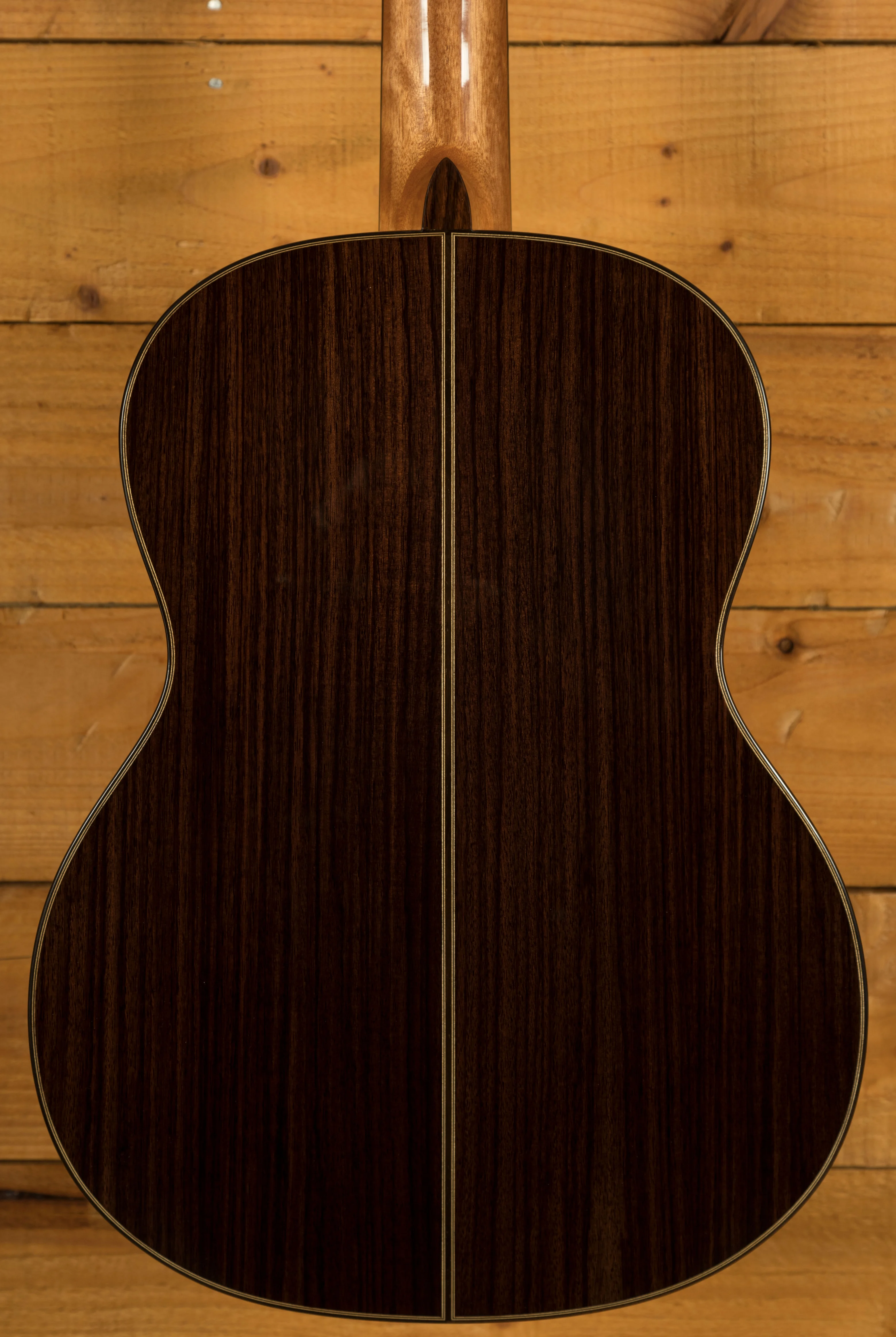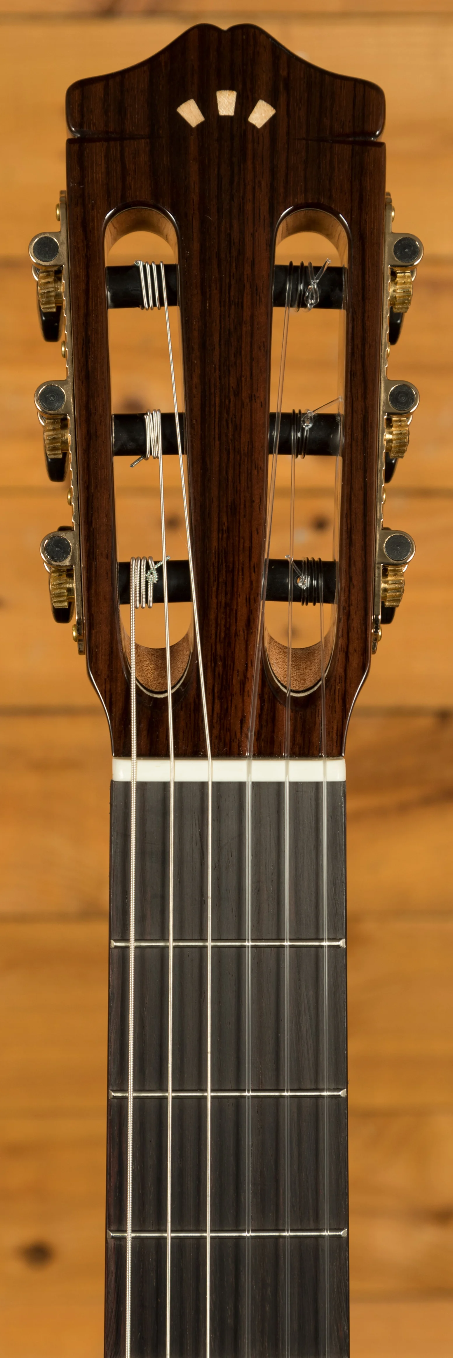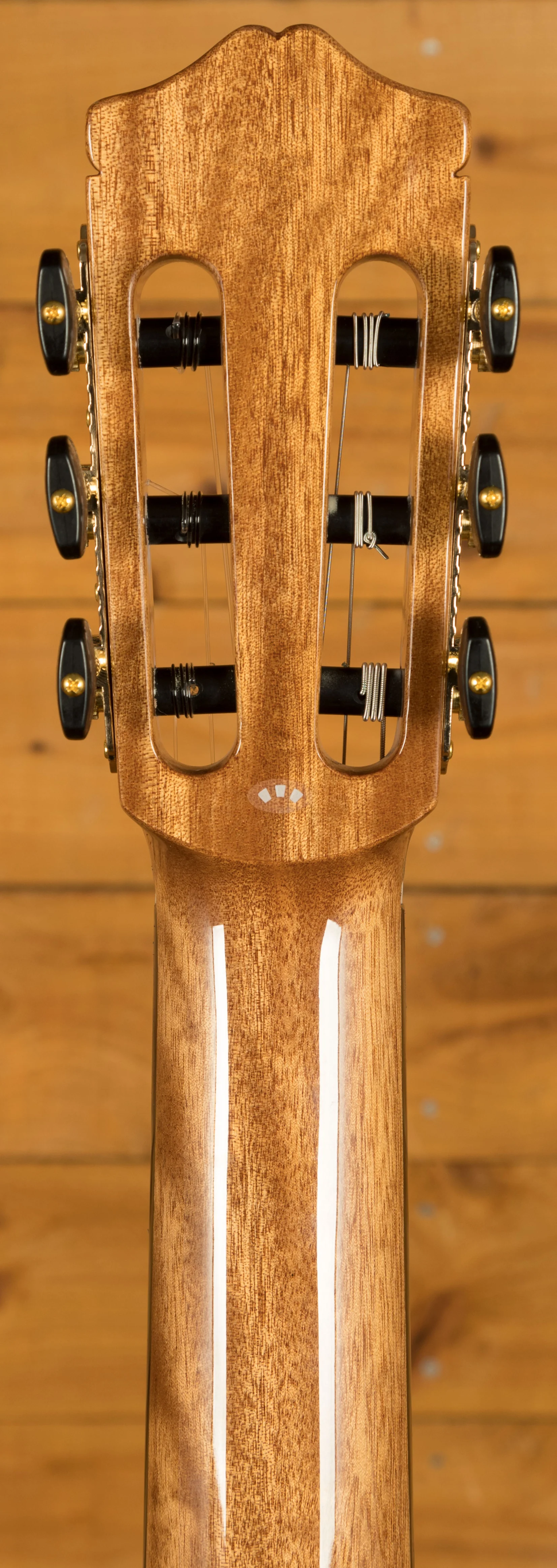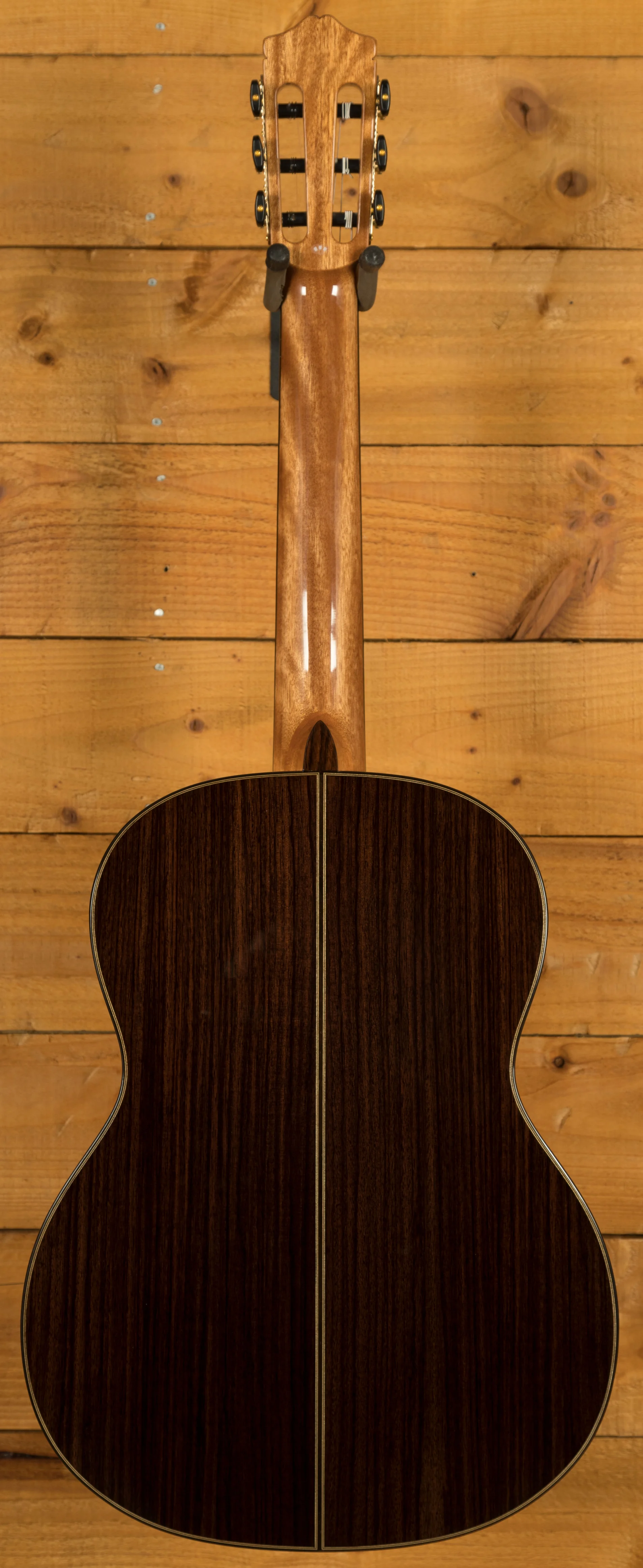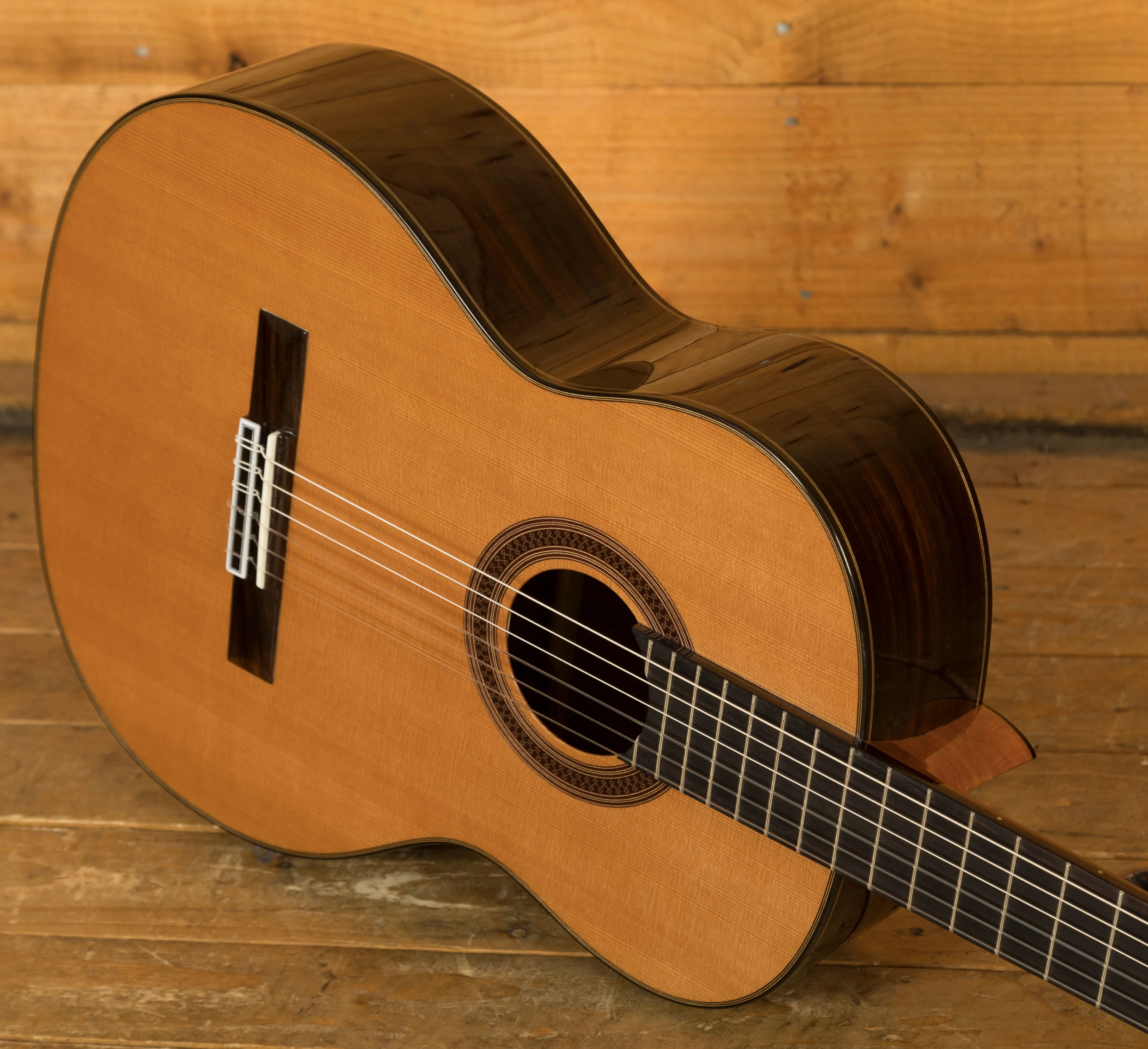 The top of the guitar is made from solid cedar and is complimented with rosewood back and sides. This is a classic choice for nylon-strung guitars and with good reason - it sounds great! The top is fan braced; this style of bracing (pioneered on classical guitars by Antonio de Torres Jurado) gives a far superior bass response and dynamics when compared to a ladder-braced classical.
