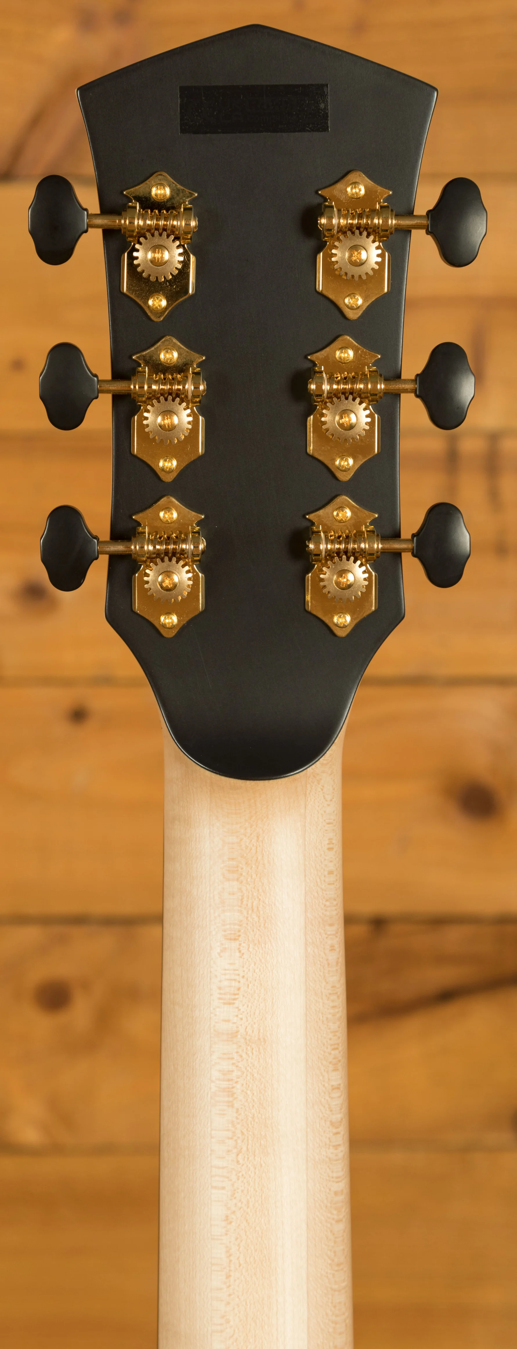 The maple neck provides a brighter punchier tone than the conventional neck materials such as mahogany, and the ebony fretboard provides a crisp and responsive sound in conjunction with the body's acoustic resonance.