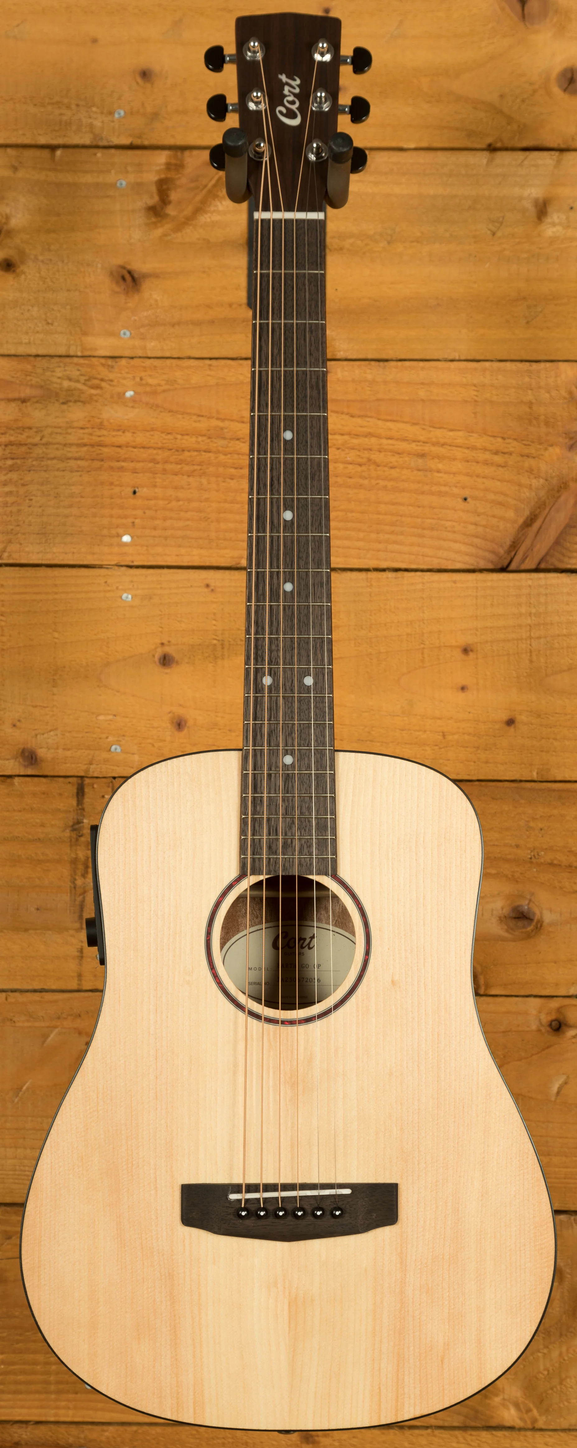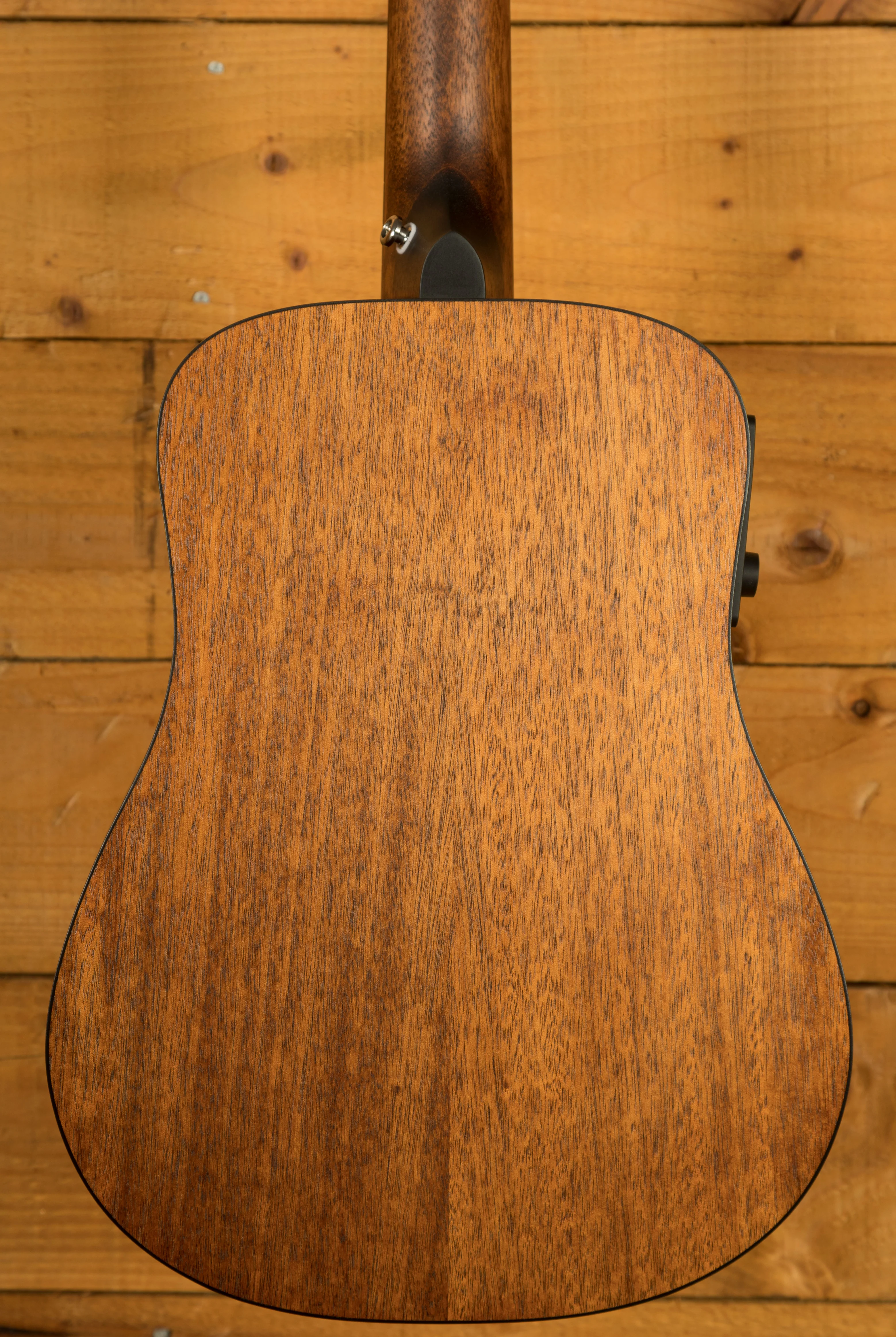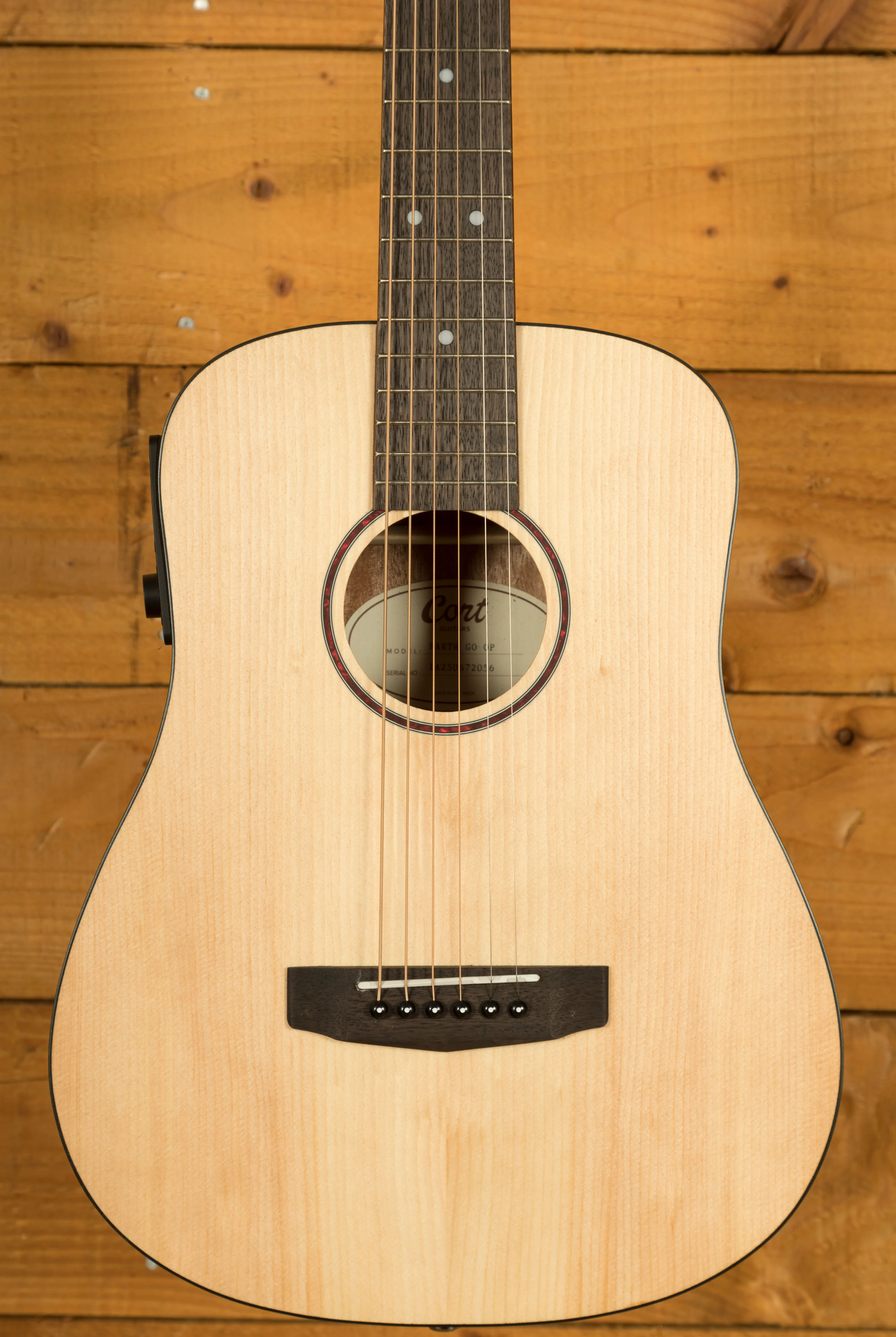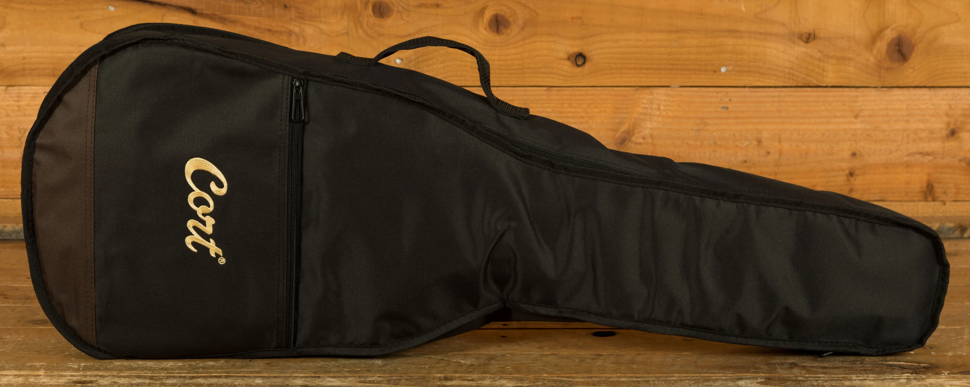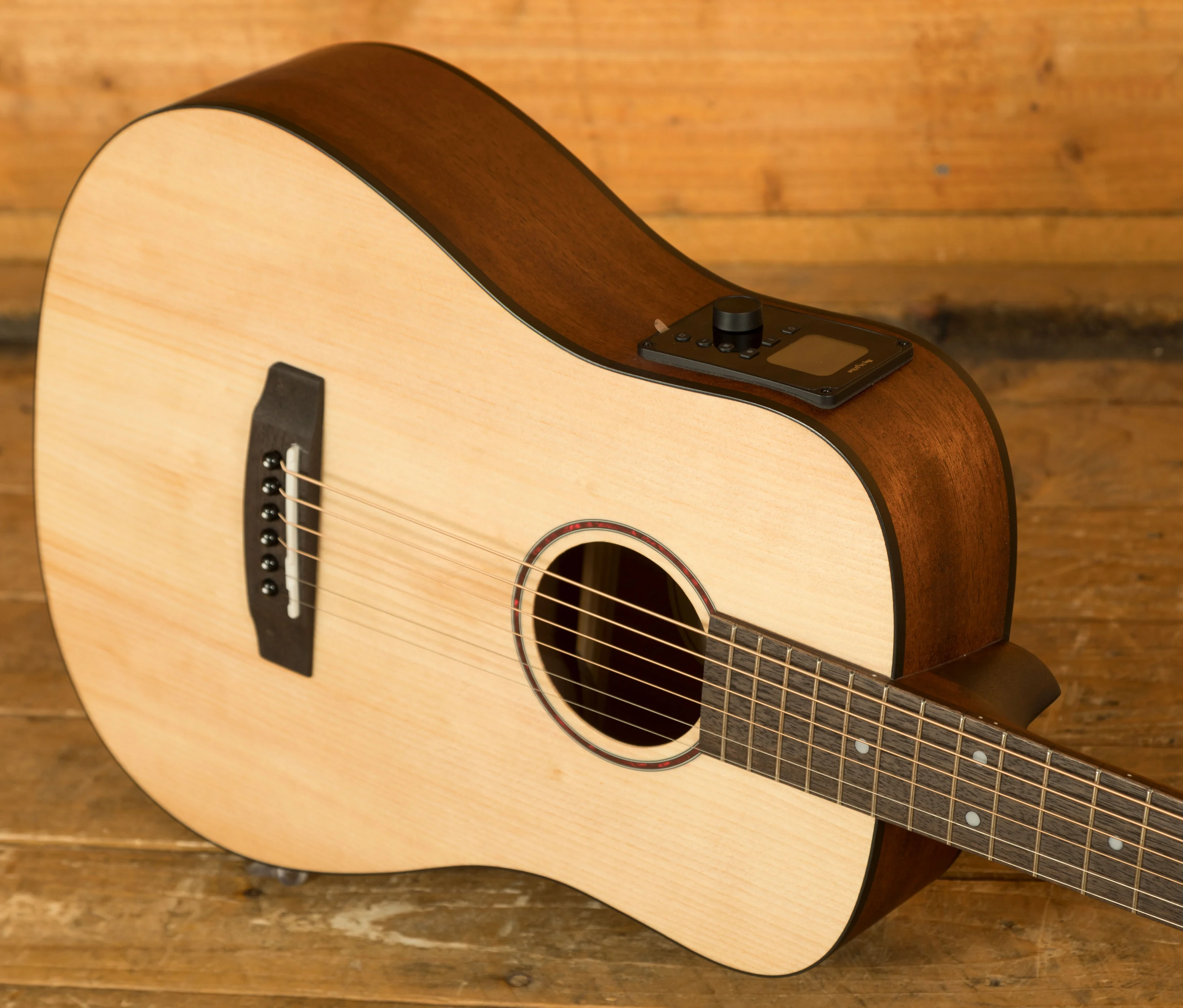 The Cort Earth GO is a 3/4 size mini dreadnought acoustic guitar designed for portability and comfort without sacrificing quality. Its solid Sitka spruce top provides excellent projection and clarity, while the mahogany back and sides add warmth and depth to the tone, making it suitable for a wide range of playing styles. With a compact 22.8" scale length and lightweight build, it is easy to transport, making it a practical option for travel or for any players who prefer a smaller instrument.