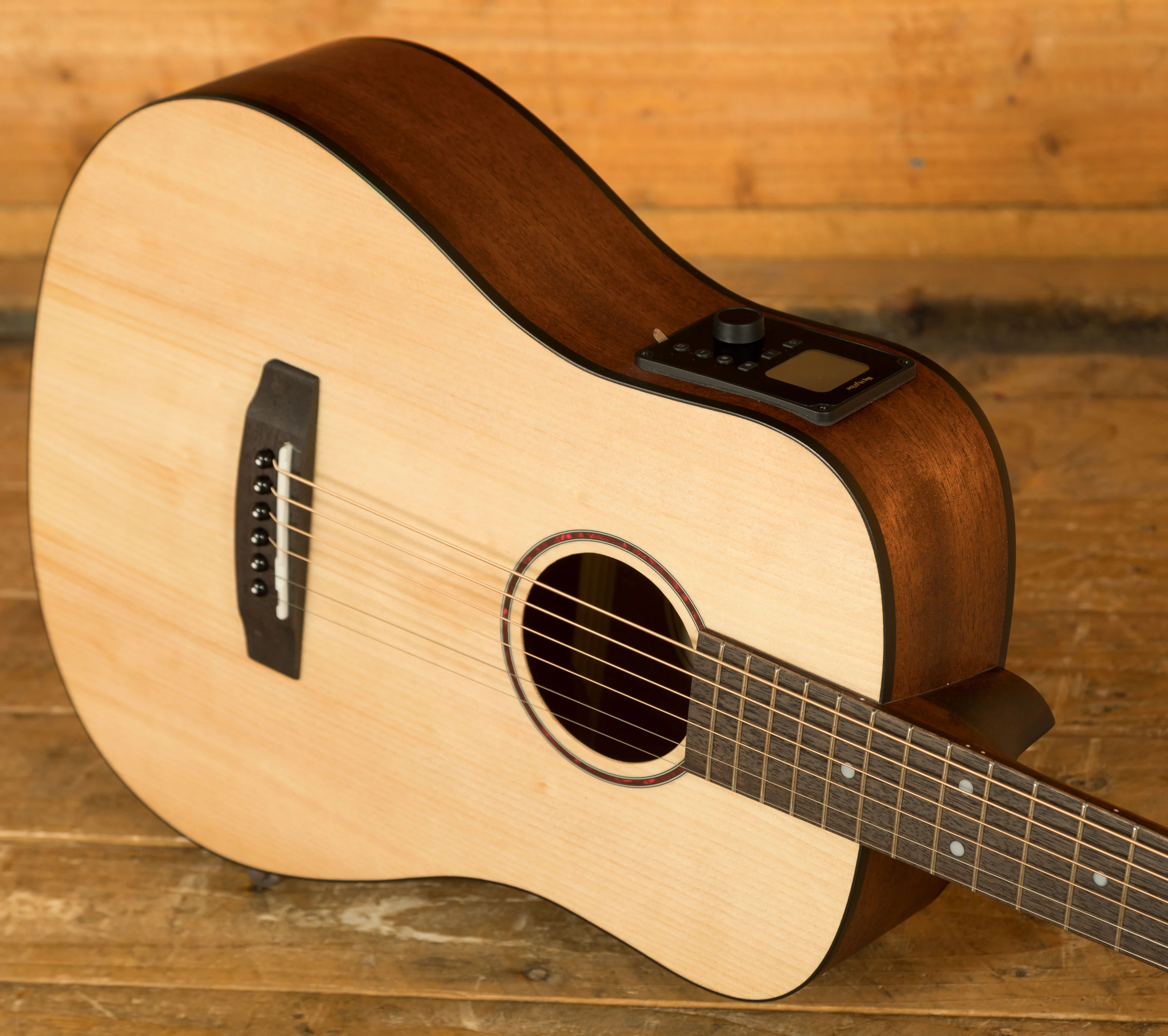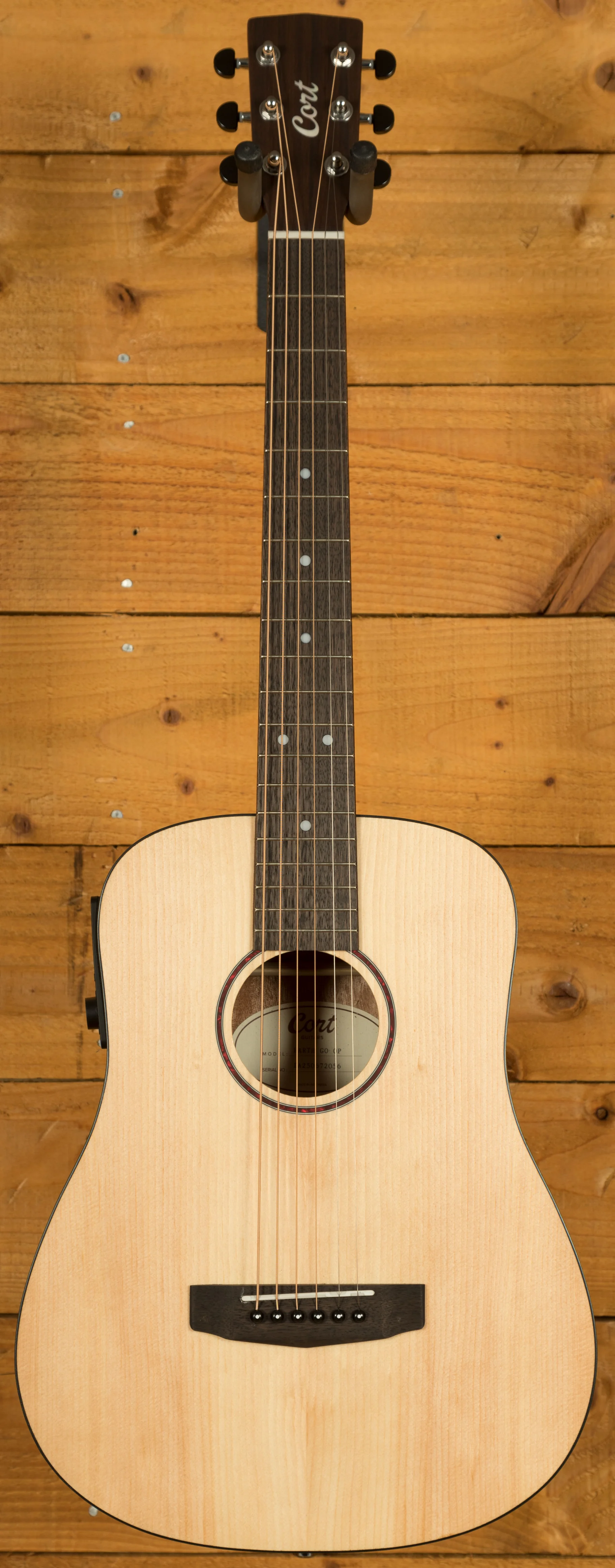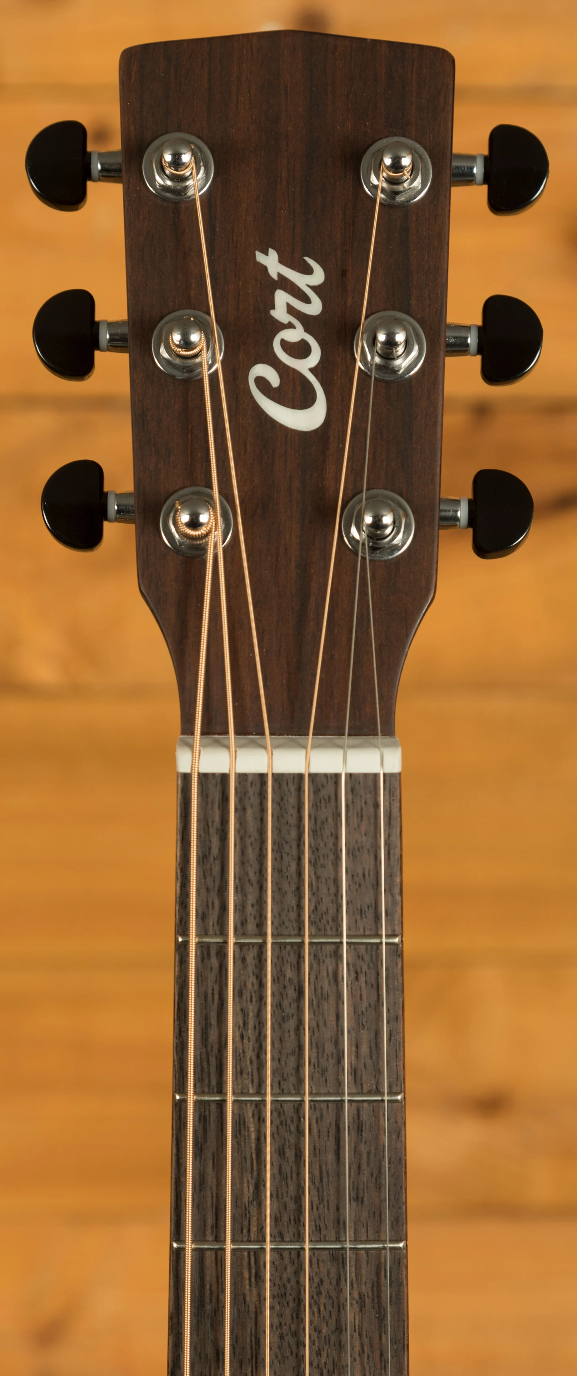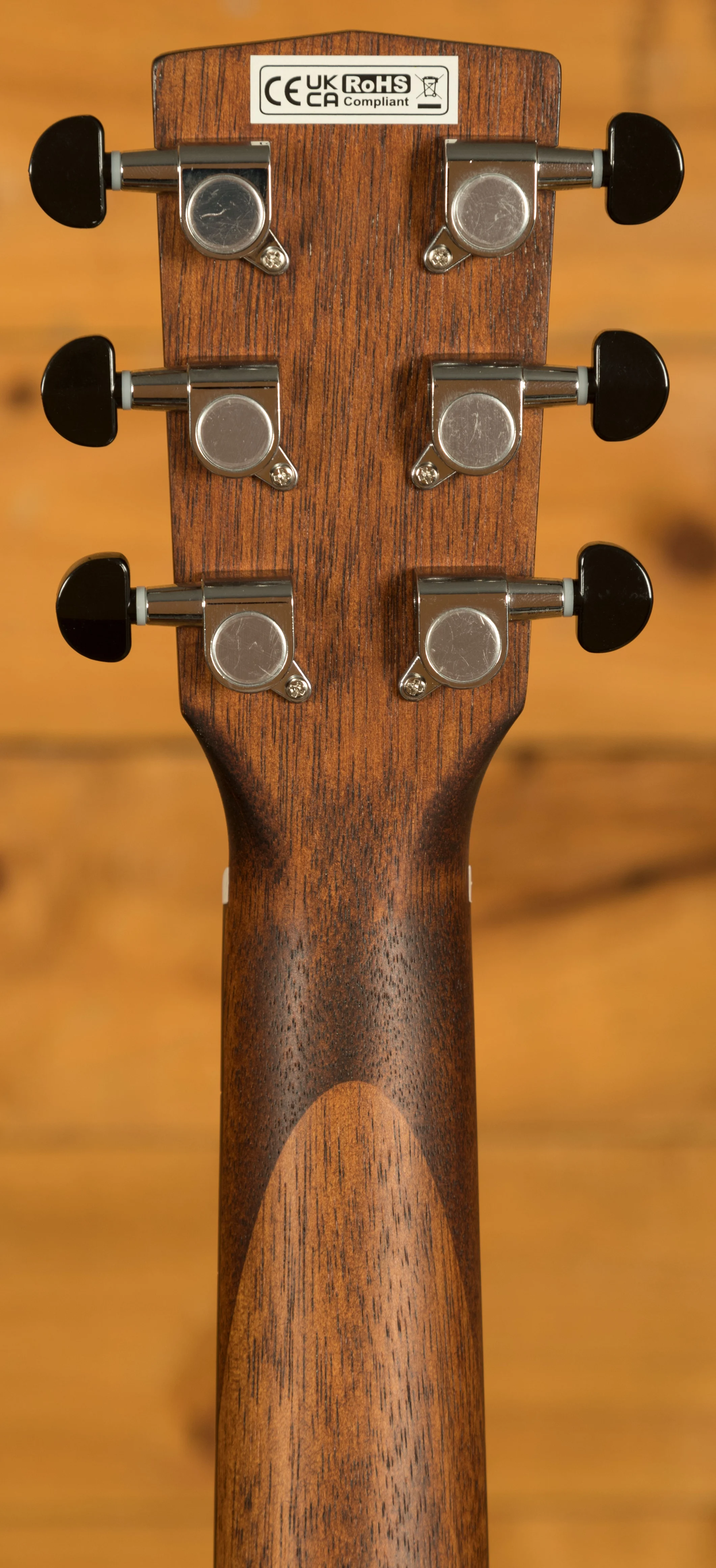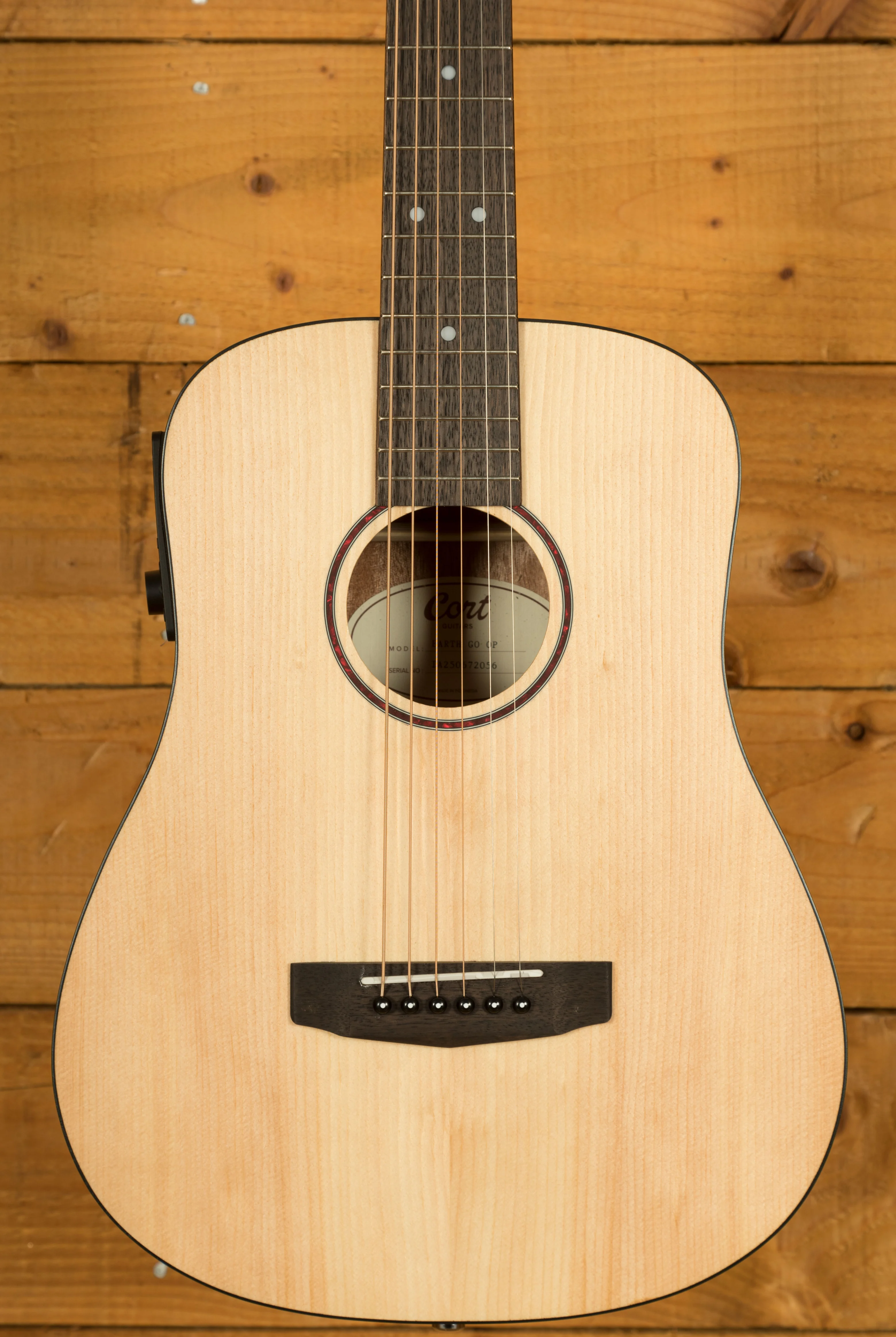 The Cort Earth GO is a 3/4 size mini dreadnought acoustic guitar designed for portability and comfort without sacrificing quality. Its solid Sitka spruce top provides excellent projection and clarity, while the mahogany back and sides add warmth and depth to the tone, making it suitable for a wide range of playing styles. With a compact 22.8" scale length and lightweight build, it is easy to transport, making it a practical option for travel or for any players who prefer a smaller instrument.
