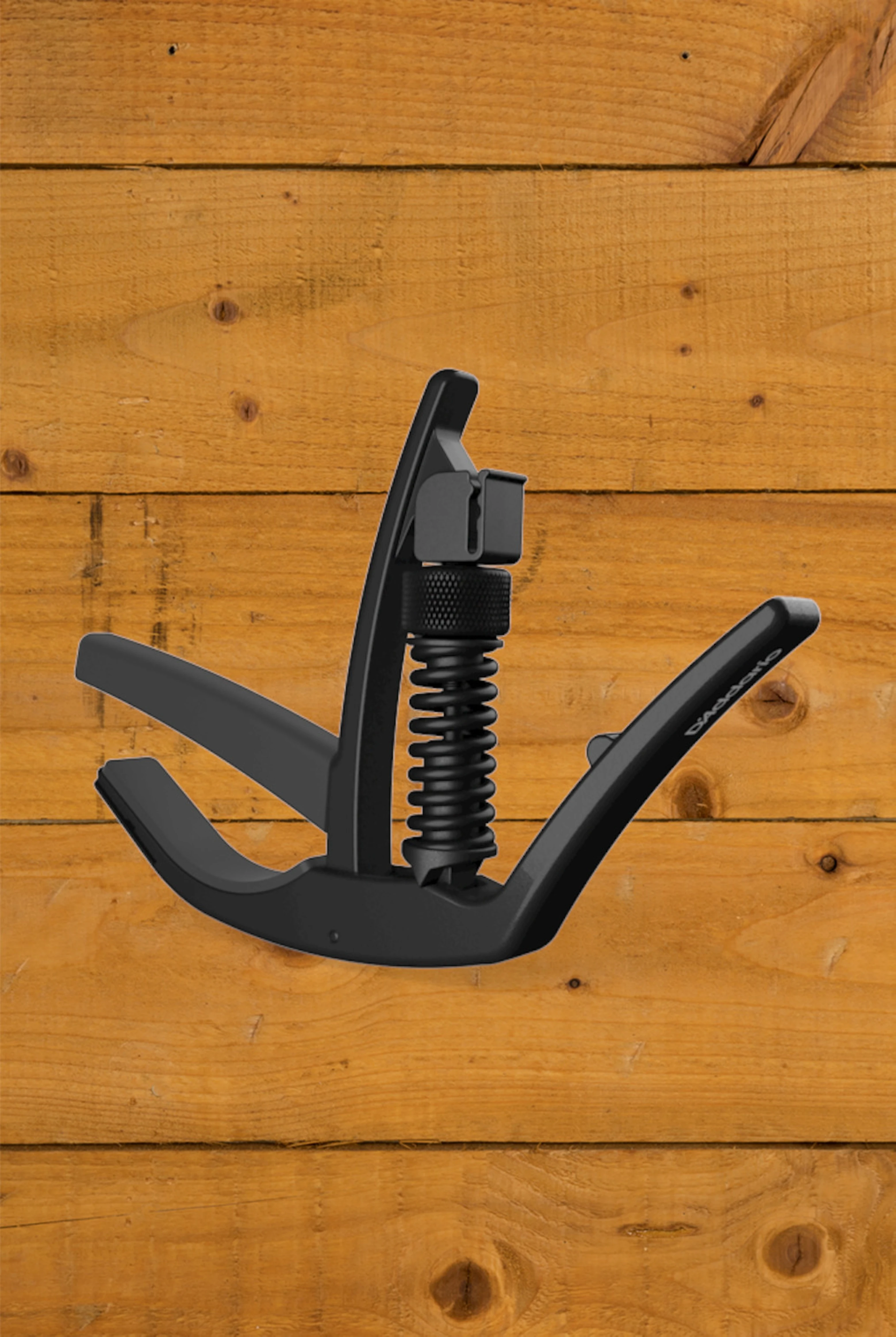 The Artist Capo utilises a patented trigger geometry reducing the force required to open and close the capo while applying even tension regardless of neck profile. Combined with the micrometer tension adjustment and direct horizontal pressure, the Artist Capo virtually eliminates pulling the strings side to side and the need to retune during use. Additionally, the trigger design and lightweight aluminium construction adds no obstruction or noticeable weight to the neck of the instrument. The Artist Capo includes a Micro Tuner mounting bracket, allowing you to add tuning capabilities to the capo.
