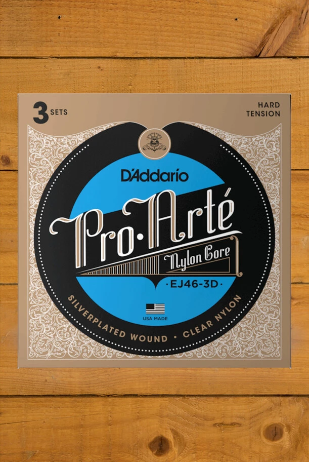 Rooted in generations of D'Addario string making expertise, Pro-Arte' Nylon is their archetypal classical set. The bass strings are made with a multifilament nylon core and wound with silver-plated copper, for an exceptionally warm and consistent response. Coupled with clear nylon treble strings, which deliver sweet, mellow highs, Pro-Arte' Nylon gives you the sound and feel that has come to define classical guitar. Hard tension strings provides rich, bold tone and strong projection.