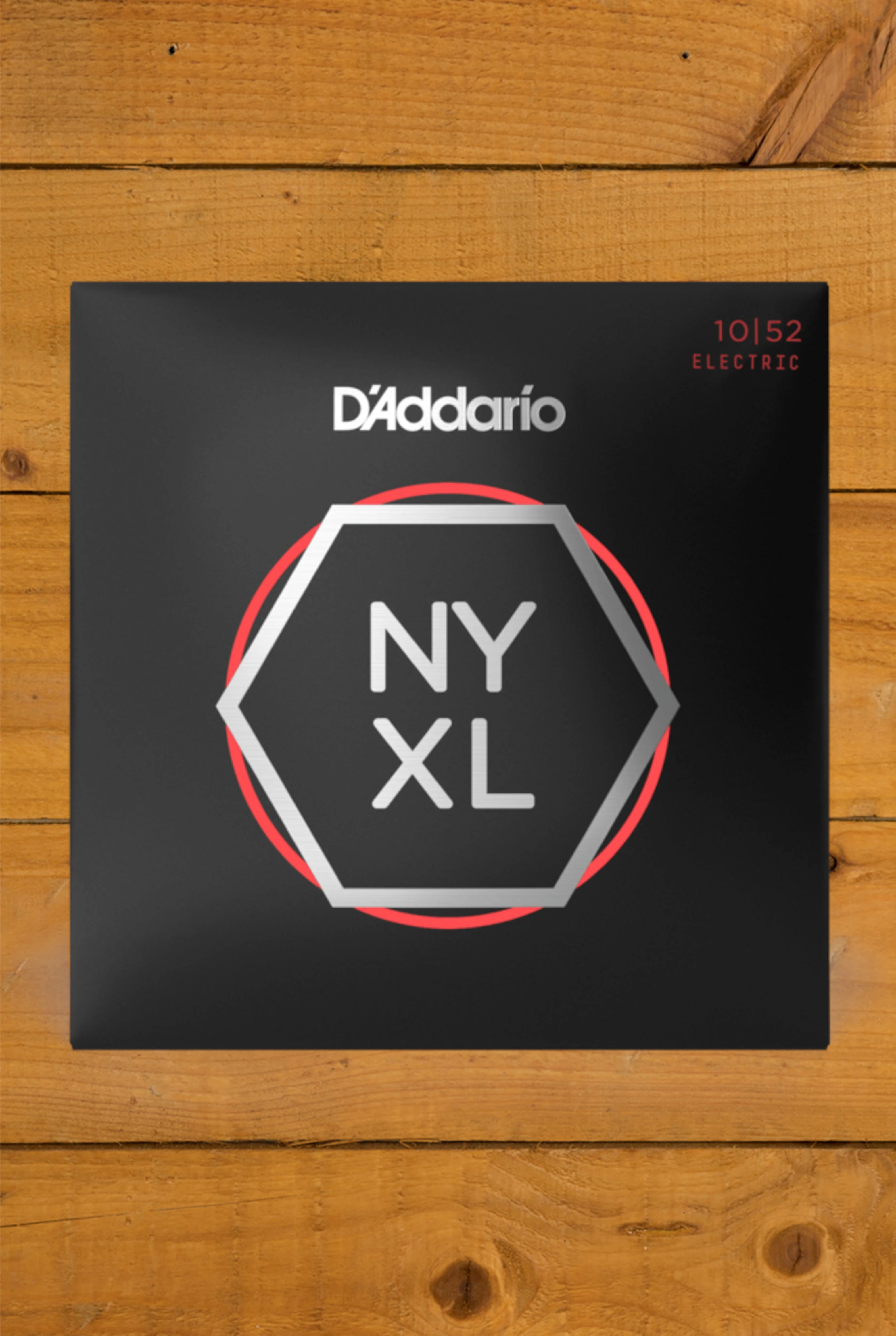 NYXL's will bend farther, sing louder, and stay in tune better than any string you've played before. As D'Addario's premium uncoated electric string, NYXLs offer higher break strength, enhanced tuning stability, and accentuated mid-range frequency response, providing more presence and crunch to cut through the mix. Made with a NY Steel core, premium nickel-plated steel wrap wire, and Fusion Twist technology, NYXL electric guitar strings are tough enough and versatile enough to handle anything. 10-52 Light Top/Heavy Bottom gauge strings have a deeper low-end than Regular Lights, balanced with comfortable playability.