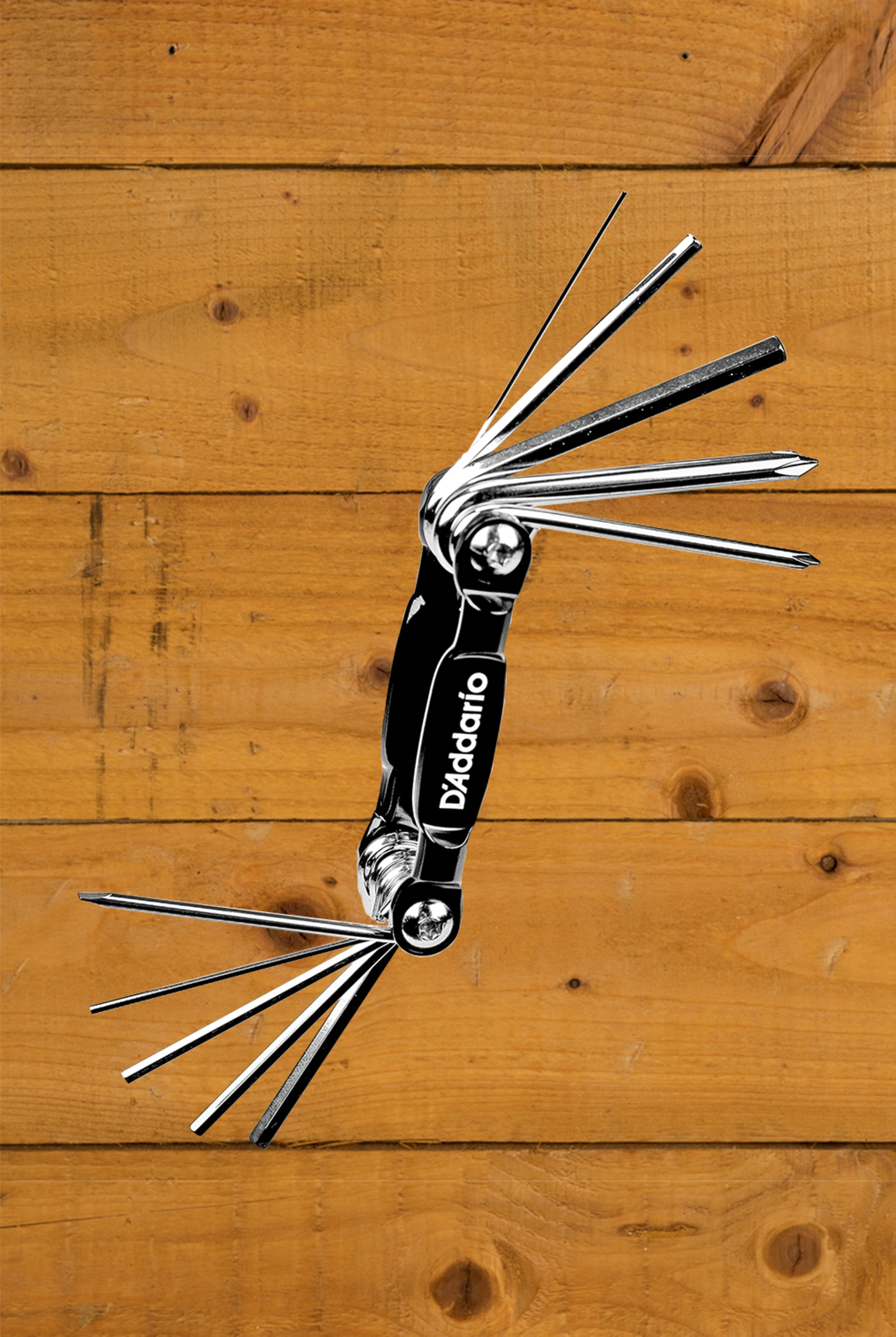 The D'Addario Multi-Tool provides the tools needed for most standard adjustments on your guitar and bass. The multi-tool features US and metric-sized keys made of long-lasting, heat-treated S2 steel in a compact design. At home, in the studio, or on the road, D'Addario has the tools to keep you and your instrument playing their best.