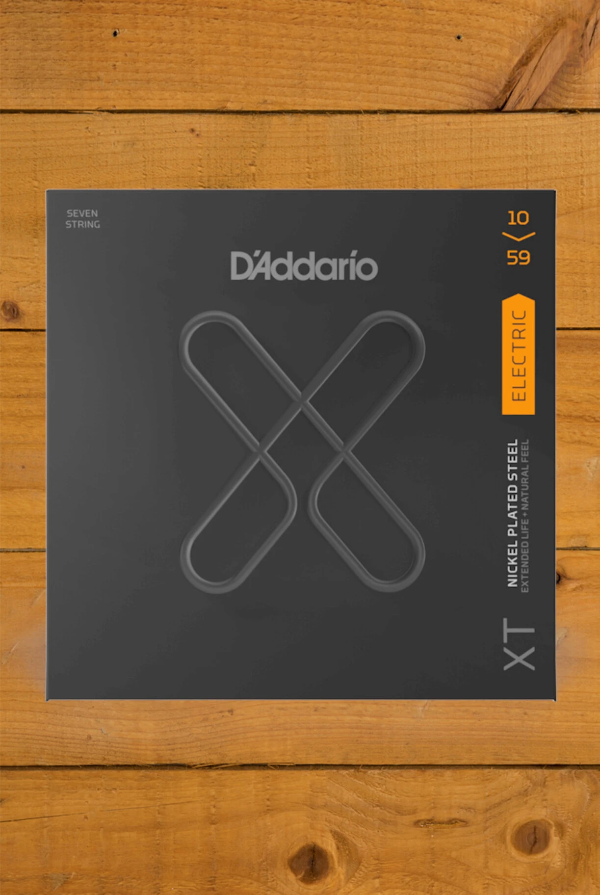 XT Nickel coated electric guitar strings offer enhanced break resistance, better pitch stability, and longer-lasting performance than standard electric strings. The XT coating, applied to each string in the set, delivers advanced corrosion resistance, while still retaining the bright tone and natural feel of the uncoated string. Beneath the coating, XT Nickel are made with a NY Steel core, nickel-plated steel wrap wire, and Fusion Twist technology, resulting in added resilience and tonal versatility, excellent for a wide range of musical styles. Made for 7-string guitars, this 10-59 Regular Light gauge set takes their most popular XT gauge and adds an additional bass string.