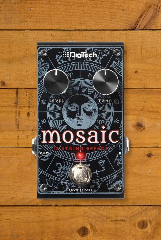 The DigiTech Mosaic Polyphonic 12-String effect pedal sets you upon the path of creating lush 12-string sounds with either 6-string electric or amplified acoustic guitars. Immediately identifiable 12-string tones are now yours with octave low strings and doubled high strings. Single notes and full chordal strums shine with polyphonic richness and celestial movement that will inspire you. The Mosaic's balanced low-end response with crisp octave shimmer produces a tone that's lush and articulate, just as with a 12-string guitar.