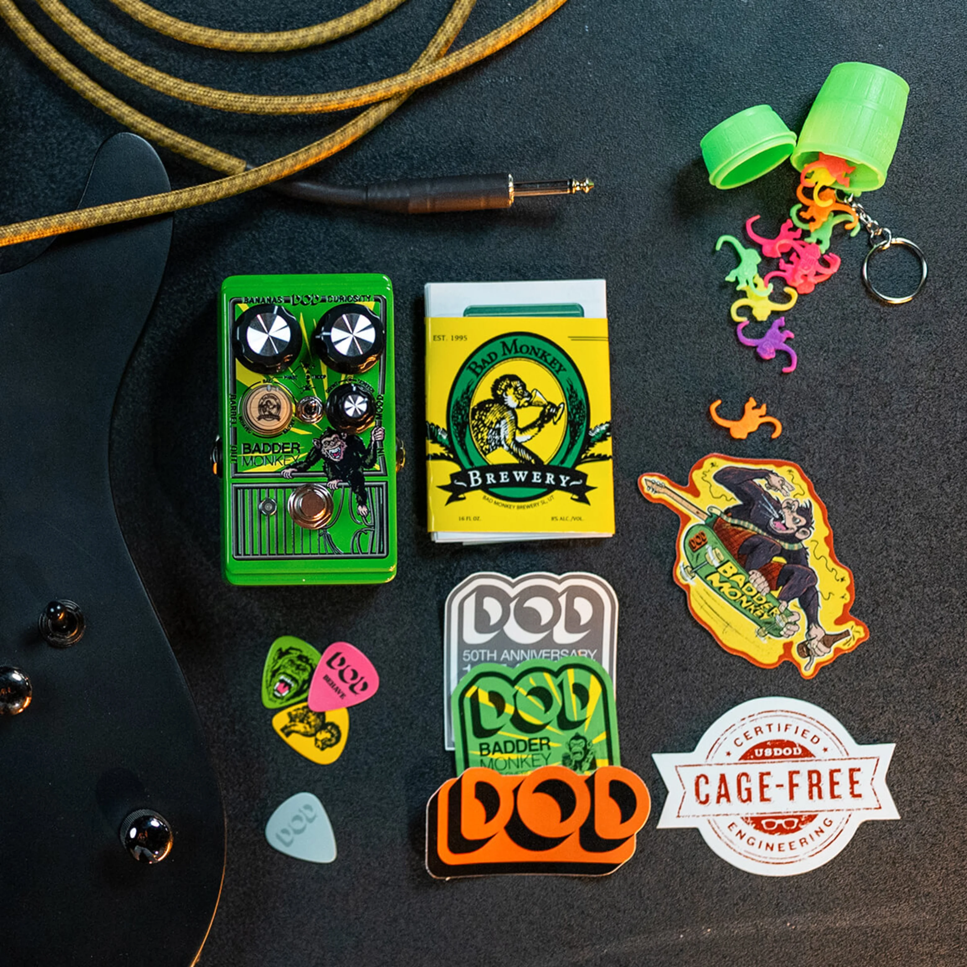 There is still more goodness to come. For a start, the pedal looks amazing, with the monkey busting through the normal DOD bars on the bottom of the pedal, the LED is tri-colour to indicate what mode you're in, it comes with stickers, picks, a Bad Monkey Brewery beer bottle label (the homebrew beer that the same designers had created), and a keychain/pick holder.