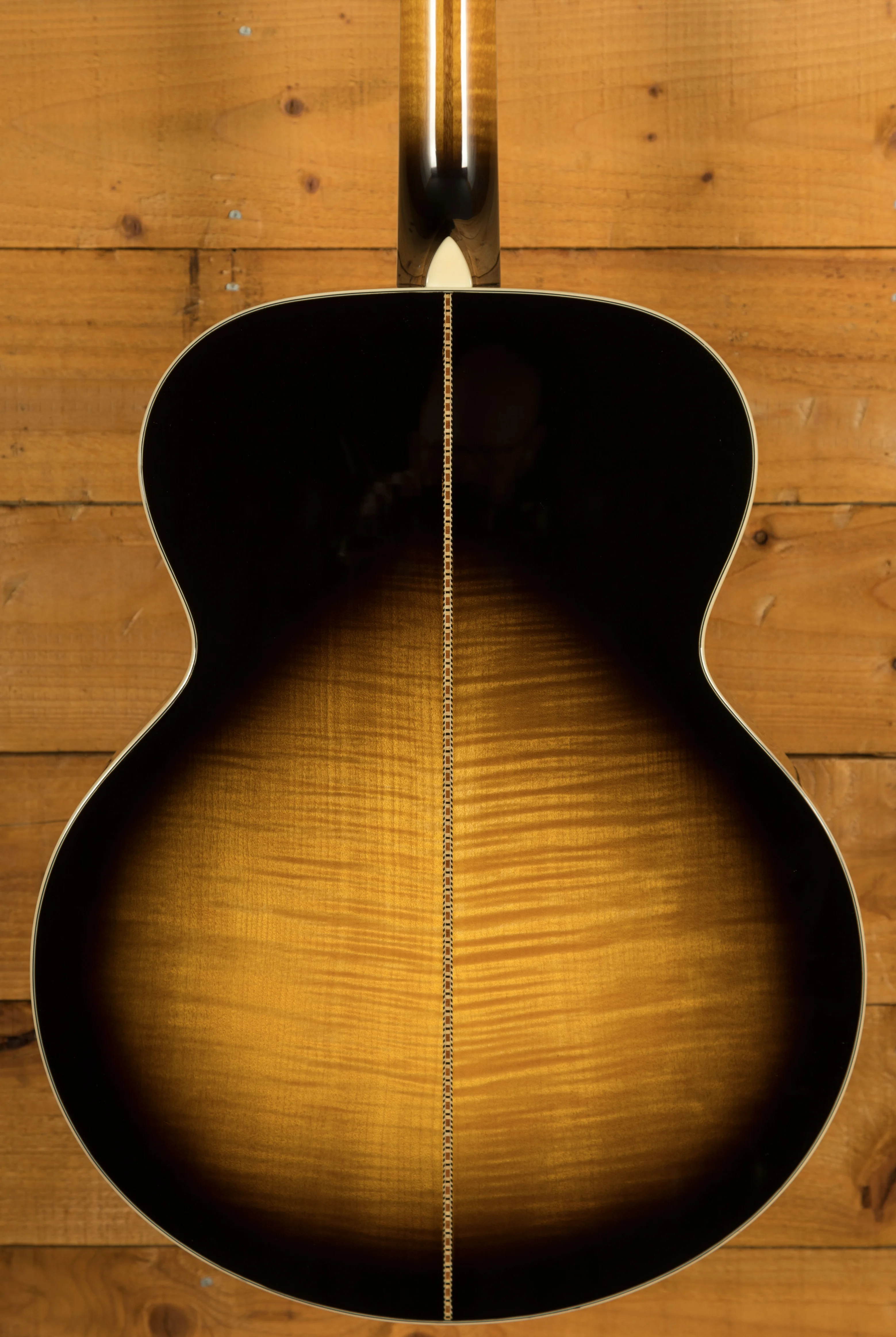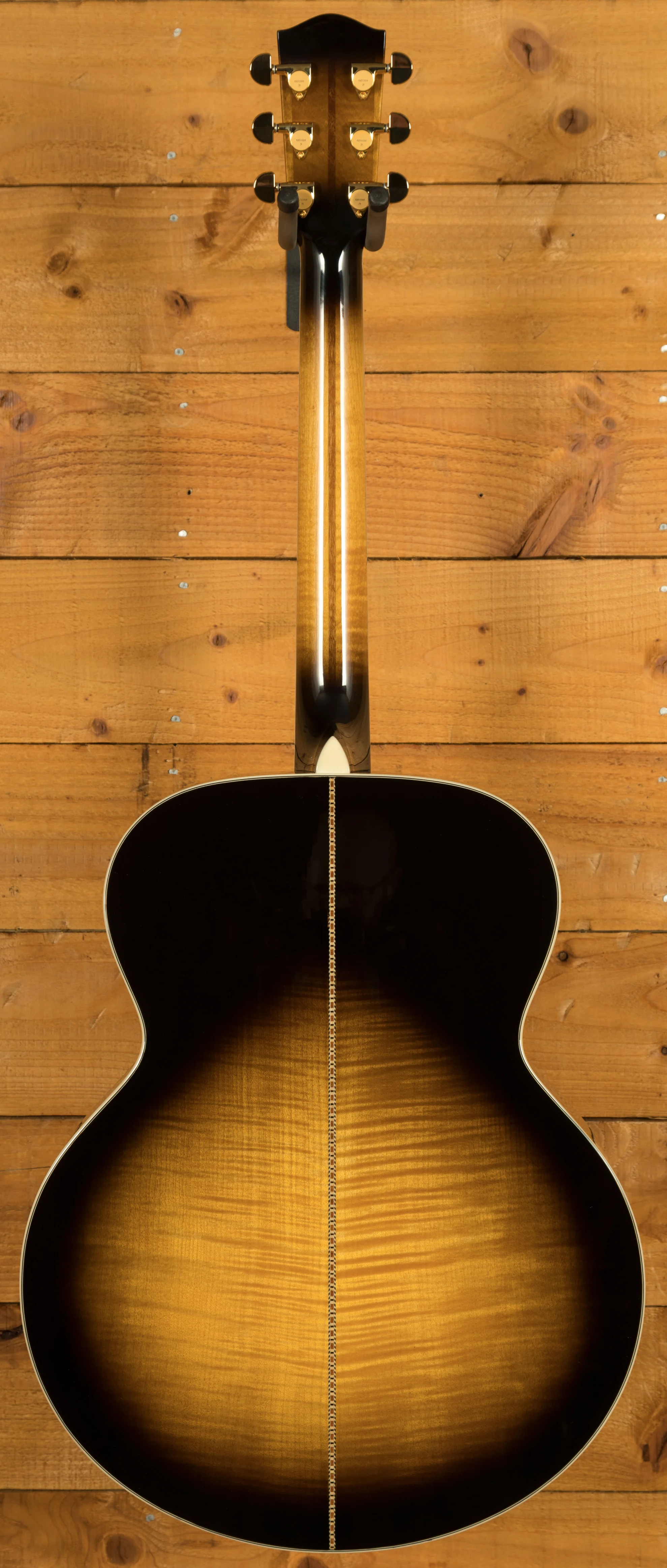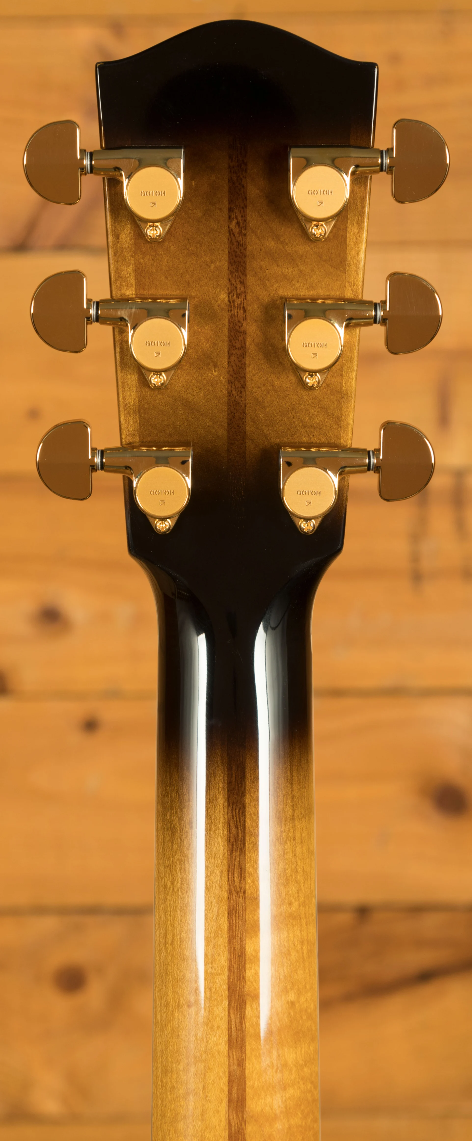 High-quality hardware and detailed craftsmanship further enhance the AC630's performance. The ebony bridge and bone saddle, with 2 5/32" string spacing, promote precise intonation and strong resonance transfer. Gotoh SG301-20GG tuners provide smooth, accurate tuning stability, while figured maple binding and pearl/abalone inlays highlight the instrument's high-end build quality. The dual-acting truss rod allows fine control over neck relief, ensuring long-term playability. The AC630 comes strung with D'Addario XS Phosphor Bronze (.012–.053) strings for a balanced, durable tone, and each guitar is professionally set up for optimal action and response before shipping.