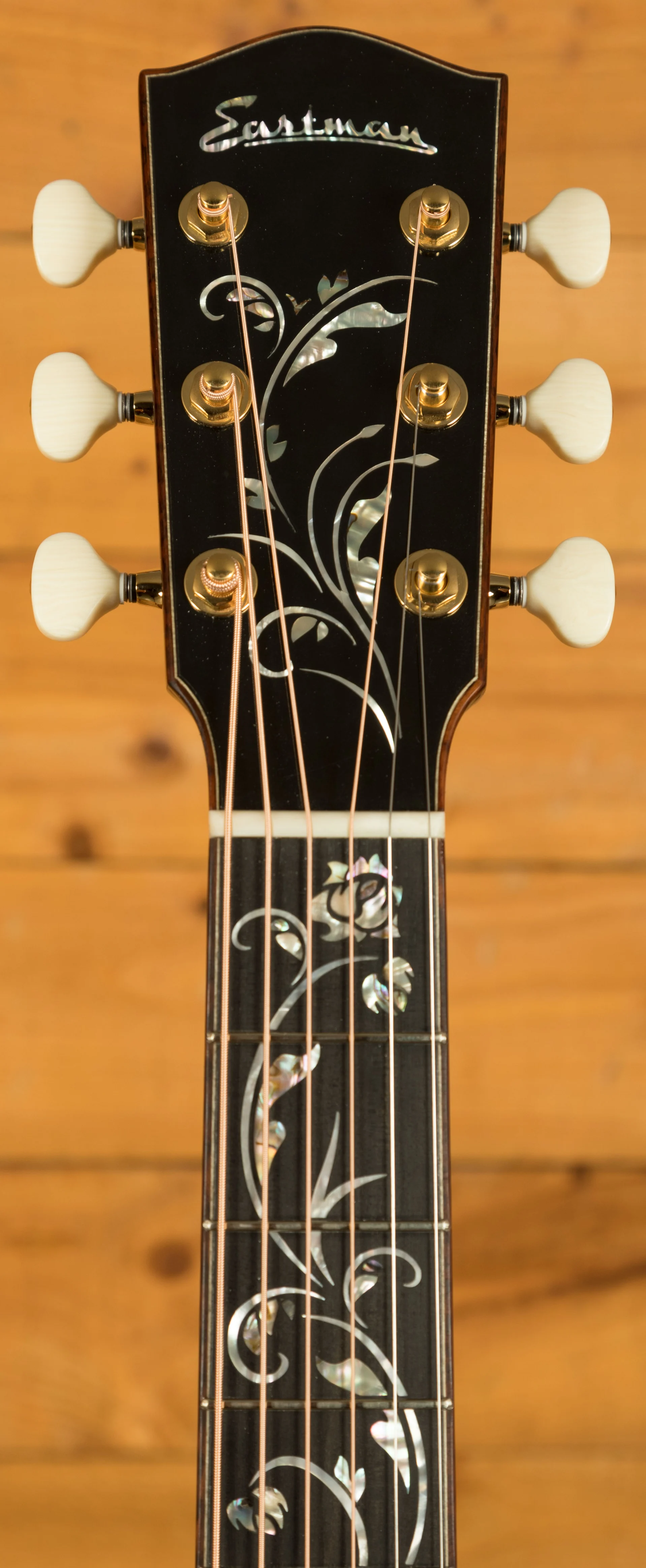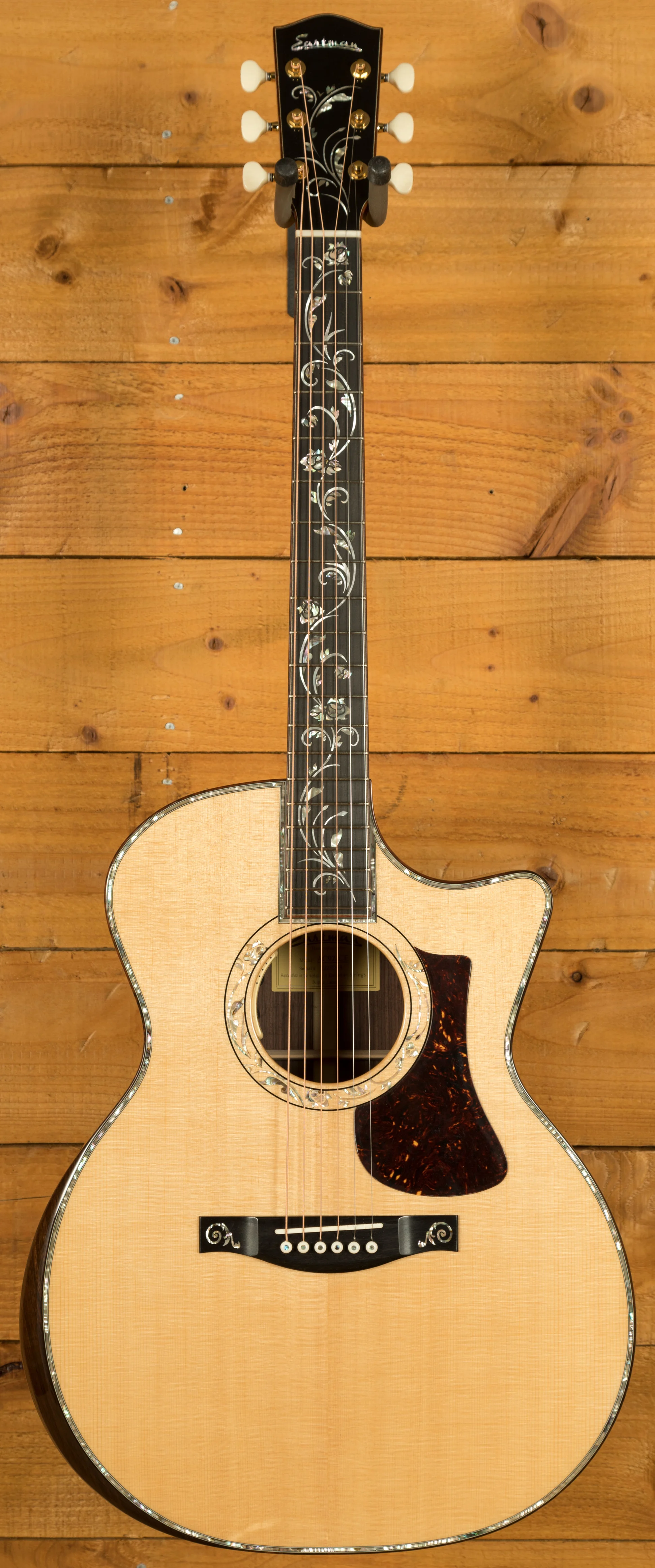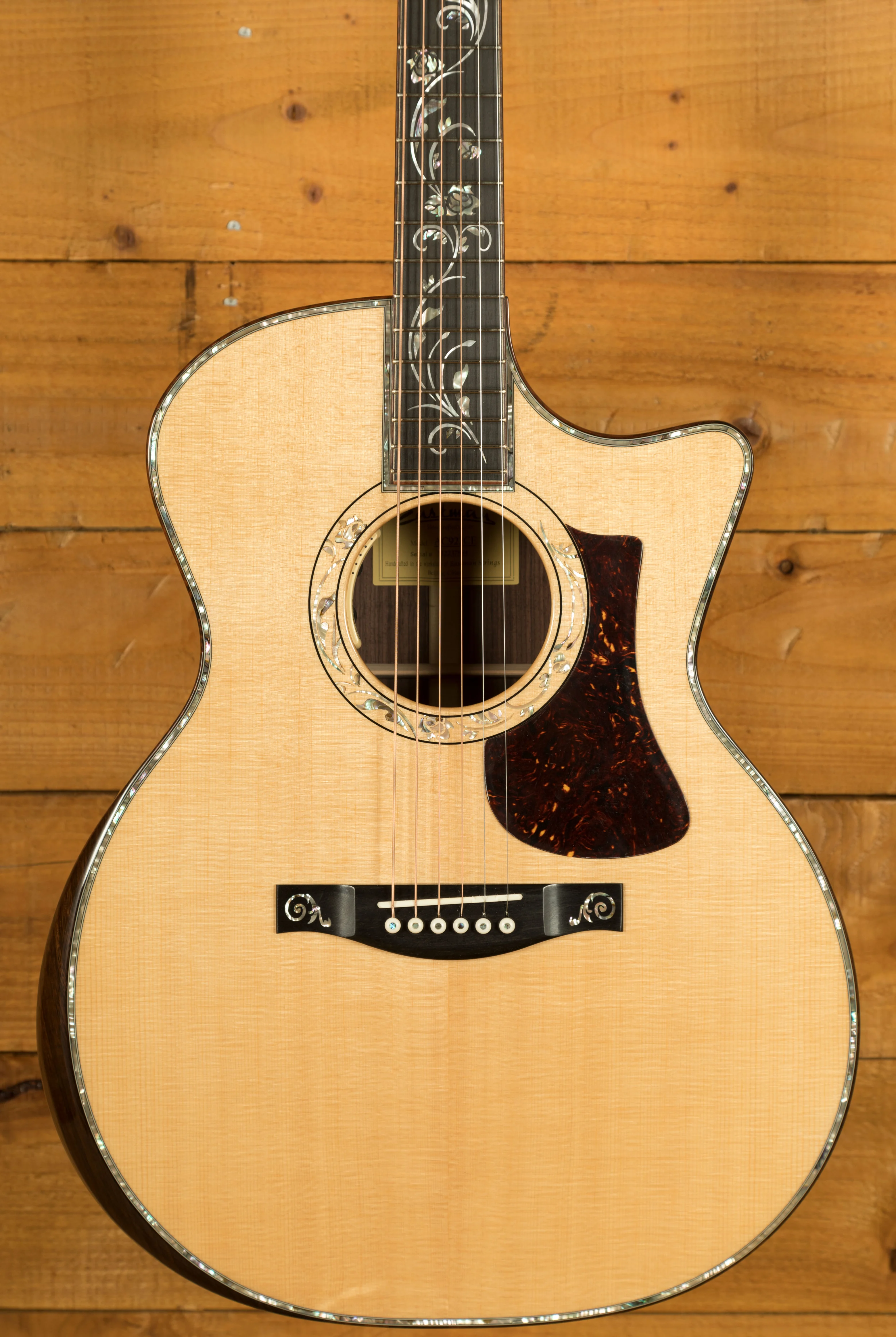 When it comes to aesthetics, the AC922CE is truly breathtaking. The abalone rosette, along with the exquisite pearl Large Vine inlay, exudes elegance and sophistication. The binding, made from figured maple, adds a touch of luxury to the guitar's overall appearance. The pearl headstock logo and black side dots further showcase the attention to detail and craftsmanship that goes into every aspect of this instrument.