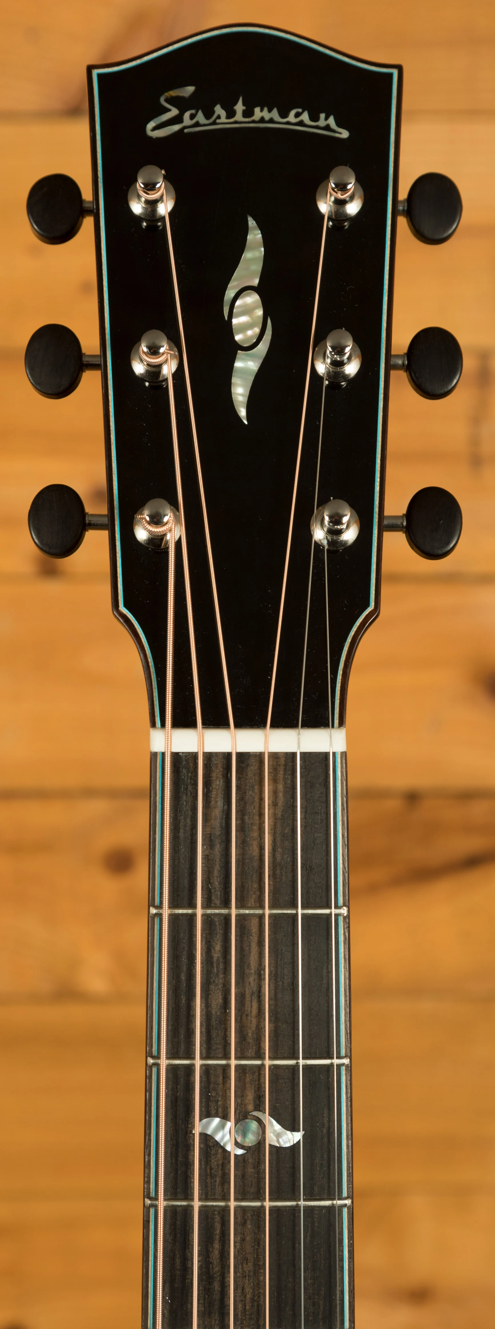 Attention to detail is evident throughout, with a stunning snakewood rosette accentuated by turquoise and magenta purfling, adding a touch of artistic flair. The dual-acting truss rod ensures optimal neck stability, while the rosewood binding with turquoise and magenta purfling elevates the aesthetic appeal of the guitar. The pearl headstock logo and hurricane pearl/abalone inlays are a testament to the fine craftsmanship that defines Eastman instruments.