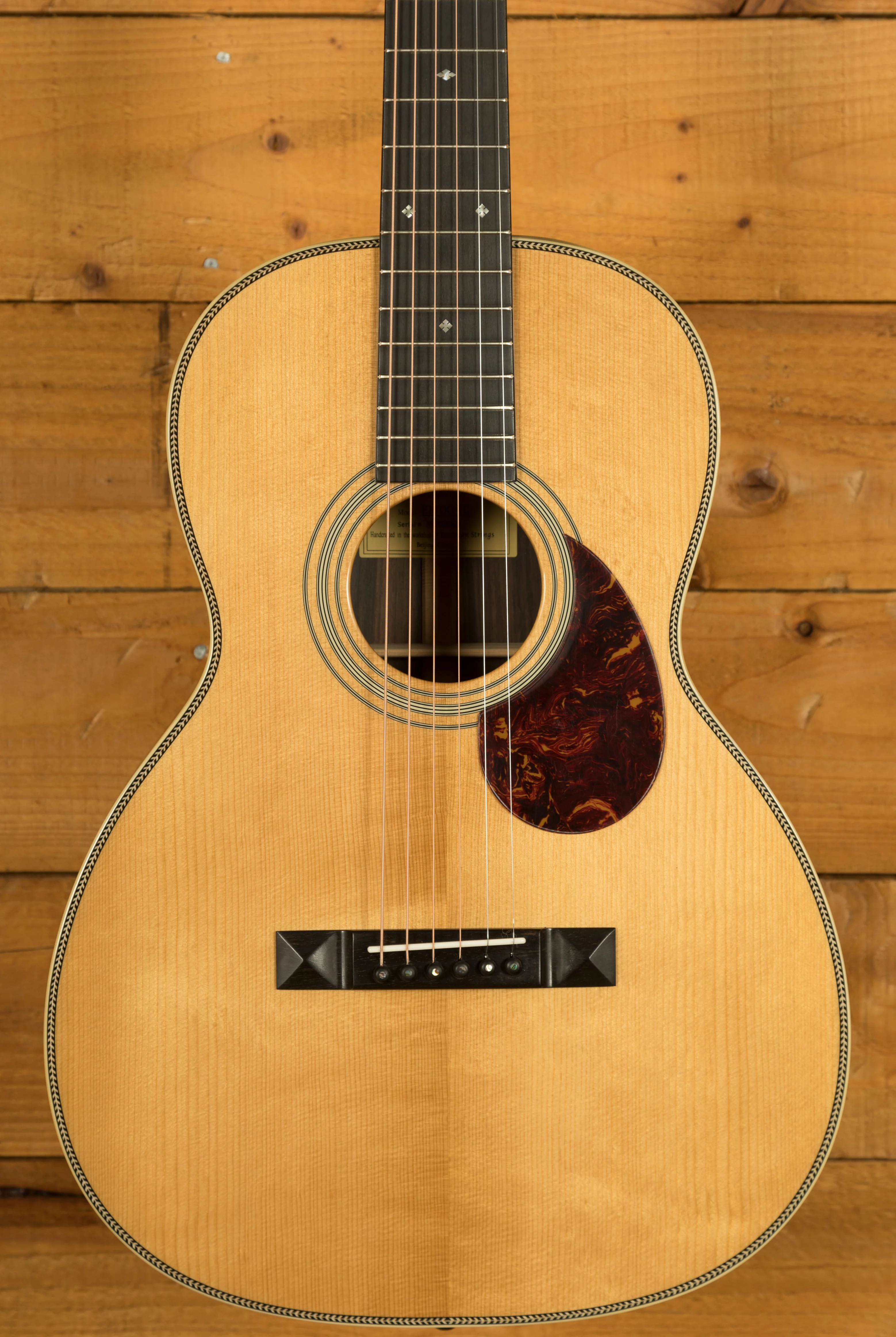 The E20OO-TC boasts timeless aesthetics with its classic rosette, pearl headstock logo, and elegant abalone snowflake inlays. The herringbone binding adds a touch of sophistication and complements the guitar's overall design. The white side dot markers offer easy visibility and reference points, ensuring accurate and confident playing.