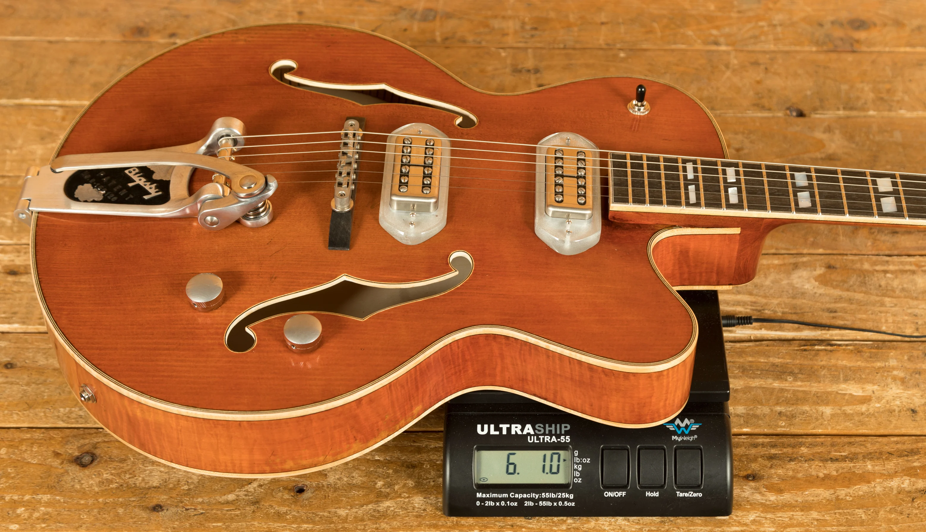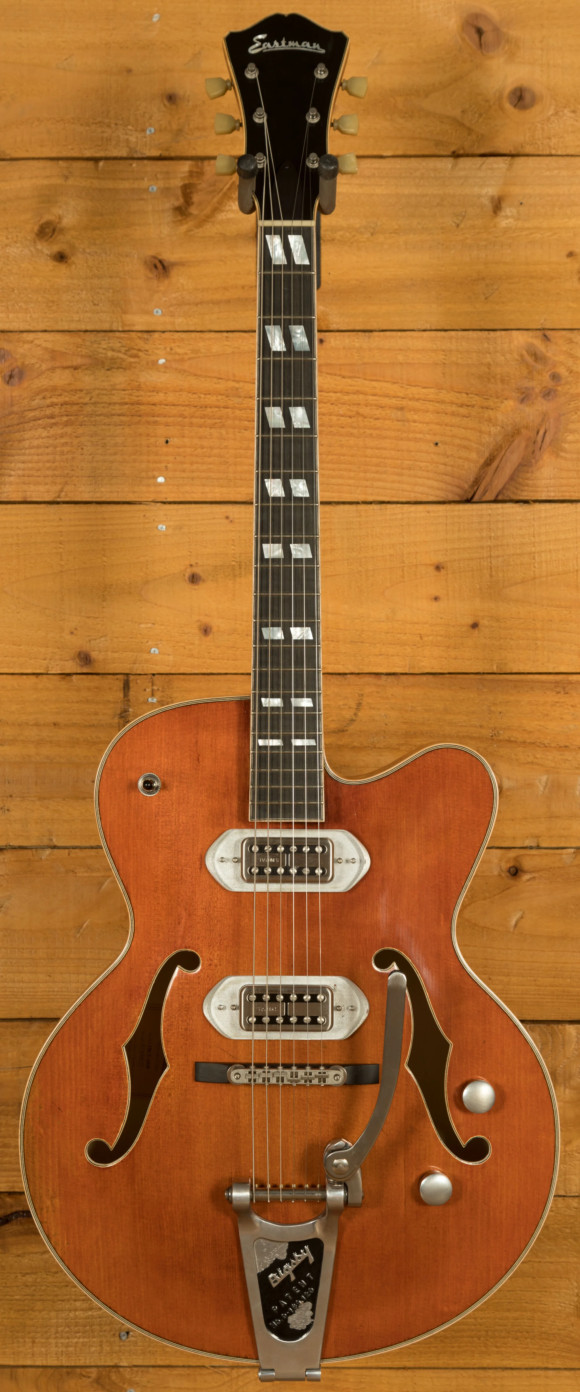 The hardware of the T58/v is designed to complement its exceptional tonal characteristics. The adjustable Ebony bridge allows you to fine-tune your intonation and achieve optimal string action. The Gotoh Relic Series SD90 tuners provide precise tuning stability while adding an elegant touch to the guitar's appearance. The US Bigsby B6 brings players the ultimate in vintage vibrato systems with authentic top quality.